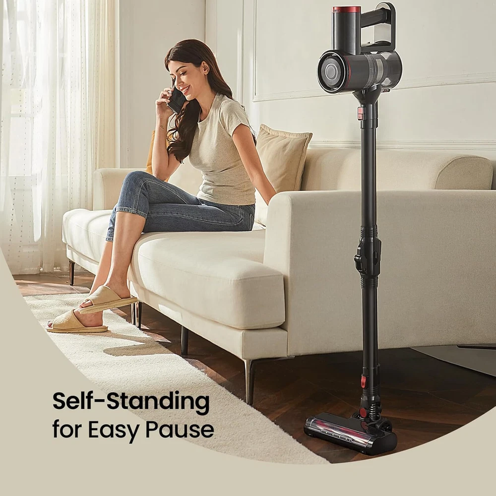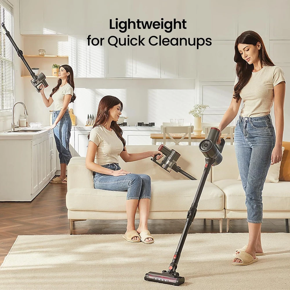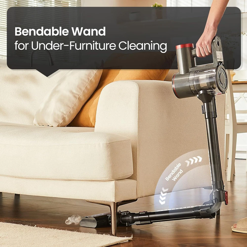 Cordless Vacuum Cleaner with Bendable Wand, Lightweight Stick for Gray Product Details Brand: RONEAIR Special Feature: Bendable Wand for Under-Furniture Cleaning, Illuminated & Motorized Floor Nozzle, Lightweight, Self-Standing Storage, Versatile Handheld Mode Filter Type: HEPA Filter Included Components: Dusting Brush, Under-Appliance Wand, LED Floor Nozzle, Handheld Vaccum Is Cordless?: Yes Capacity: 0.8 Liters Wattage: 150 watts Runtime: 30 minutes Charging Time: 4.5 Hours Recommended Uses For Product: Quick cleanups on hard floors and low-pile carpets, Handheld vacuum for upholstery, stairs, and car interiors Form Factor: Stick Color: Gray Model Name: V200 Product Dimensions: 7.99"L x 4.33"W x 44.09"H Battery Description: 120 volt battery with a 30-minute runtime Noise Level: 75 dB Battery Life: 3E+1 minutes Manufacturer: RoneAir Number of Items: 1 Controller Type: Push Button Control Method: Touch Style: Minimalist Cleaning Path Width: 9.8 Inches Portable: Yes Number of Handles: 1 Number of Power Levels: 2 Indoor/Outdoor Usage: Indoor Item Weight: 5.39 pounds Item model number: V200 Batteries: 6 Lithium Ion batteries required. (included) Assembly required: Yes Batteries required: Yes Battery type: 120 volt battery with a 30-minute runtime Special Feature: Bendable Wand for Under-Furniture Cleaning, Illuminated & Motorized Floor Nozzle, Lightweight, Self-Standing Storage, Versatile Handheld Mode Bendable Wand for Under-Furniture Cleaning, Illuminated & Motorized Floor Nozzle, Lightweight, Self-Standing Storage, Versatile Handheld ModeBendable Wand for Under-Furniture Cleaning, Illuminated & Motorized Floor Nozzle, Lightweight, Self-Standing Storage, Versatile Handheld Mode See more Surface RecommendationPower Source: Hard Floor, Low-Pile Carpets,Upholstery, Stairs, and Car InteriorsHard Floor, Low-Pile Carpets,Upholstery, Stairs, and Car InteriorsHard Floor, Low-Pile Carpets,Upholstery, Stairs, and Car Interiors See more Battery Powered VoltageItem Weight: 120 Volts2.45 Kilograms Wireless Wonder for Quick Cleanups: Tailored for daily use, this cordless vacuum excels at whisking away dust, pet hair, and small debris on hard floors and low-pile carpets, making quick cleanups a breeze. Self-Standing Storage Simplicity: Whether you prefer it standing proud on its own or neatly mounted on the wall, this vacuum adapts to your space and storage style, ensuring a clutter-free home. Bendable Wand for Under-Furniture Cleaning: With its flexible design, effortlessly glide into spaces beneath furniture for a thorough clean. The foldable metal tube is designed to reach the unreachable. Lightweight & Handy for Every Corner: Effortlessly switch from a full-size to a handheld vacuum, armed with a Dusting Brush and Crevice Tool, ideal for upholstery, stairs, and car interiors. Dual Suction Modes with Extended Runtime: This vacuum offers up to 30 minutes in standard mode and 15 minutes in powerful mode, complemented by an LED battery display and a practical 4.5-hour recharge time. Illuminated & Motorized Floor Nozzle: Navigate dark corners with ease using our floor nozzle's built-in headlight, while the dynamic, rotating brushroll ensures deep and thorough cleaning on all surfaces. Advanced Cyclonic Filtration System: Unleash the power of our vacuum's multi-stage filtration, capturing even the finest dust. The high-efficiency system locks in particles, ensuring clean air and a spotless home environment. Large Capacity, Easy-Empty Dust Cup: Effortlessly dispose of the collected debris with a simple press of a button. The vacuum features a large dust cup, allowing for extended cleaning sessions and minimal interruptions.