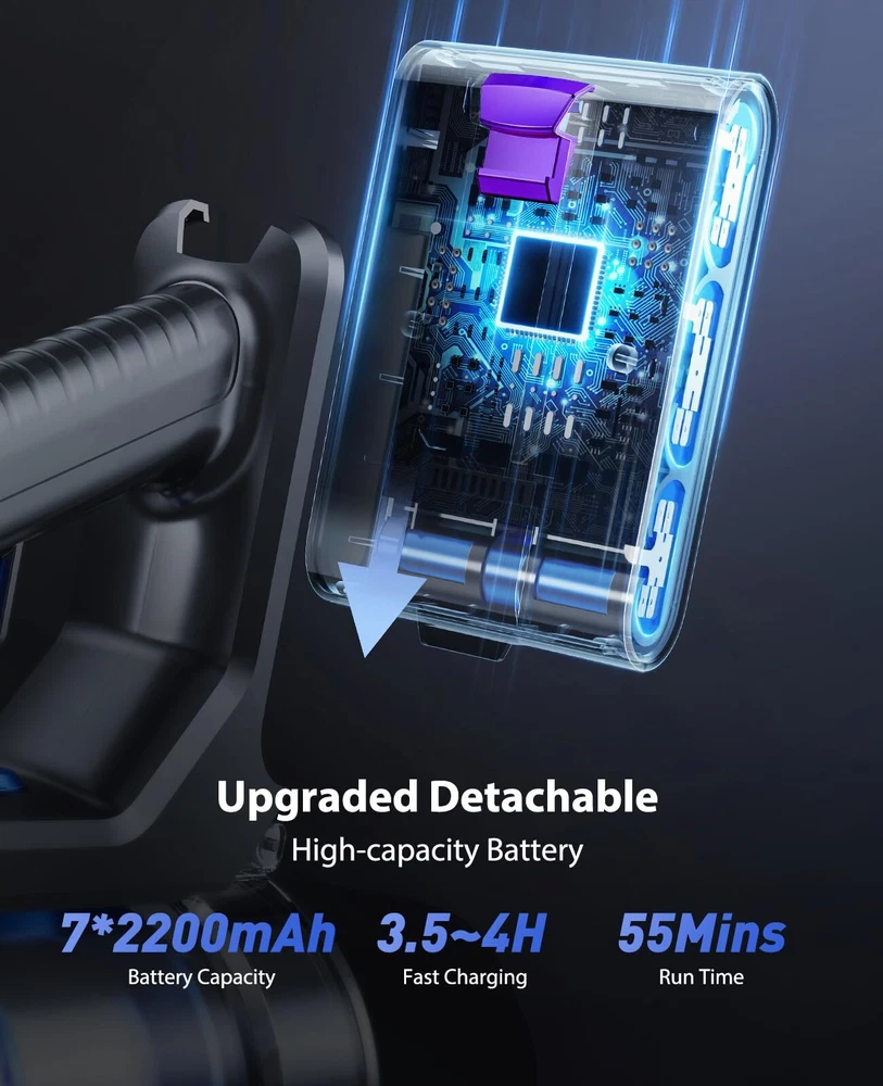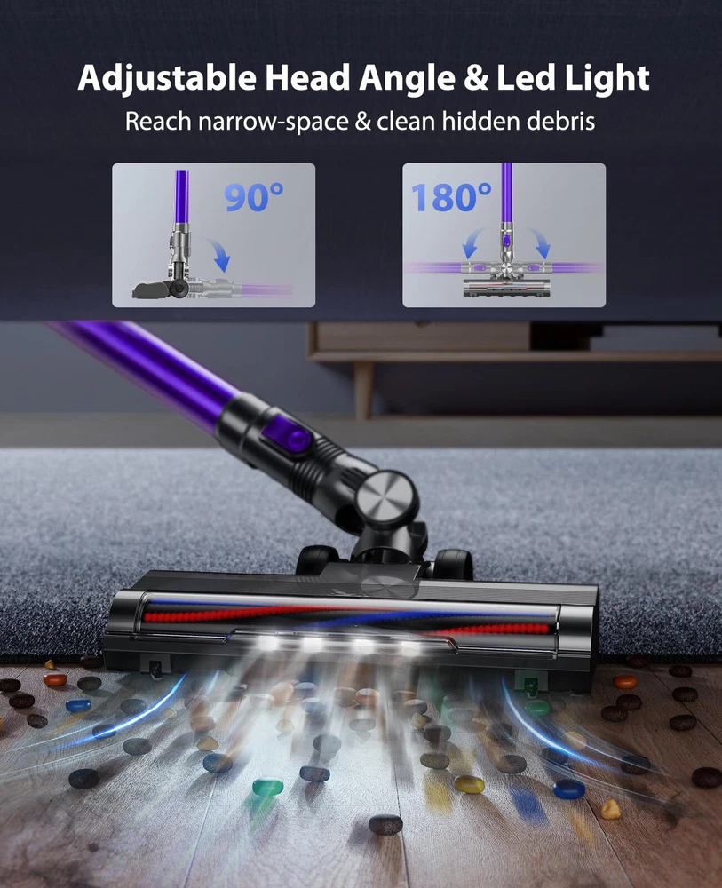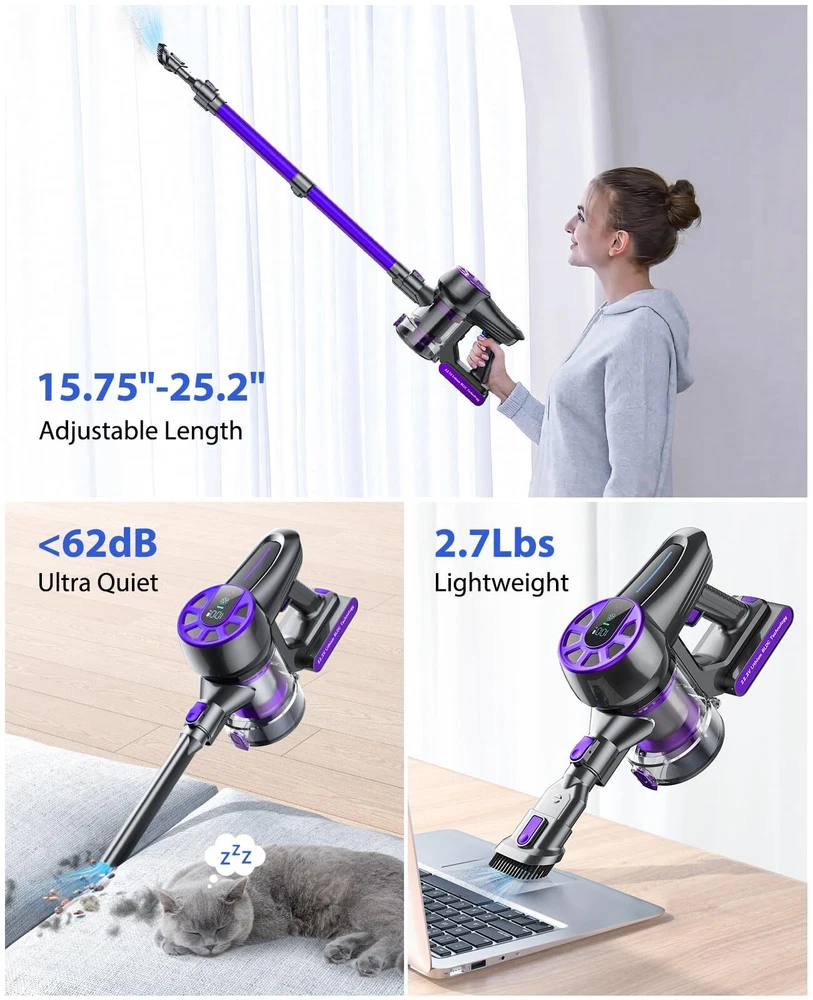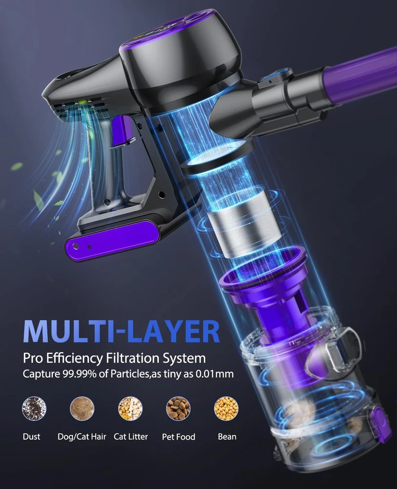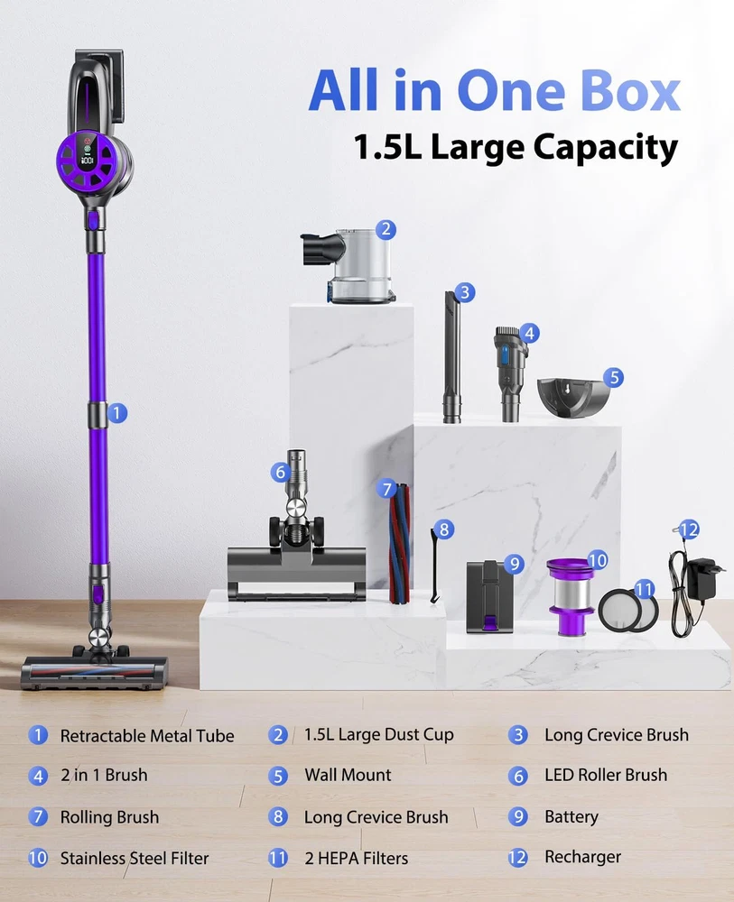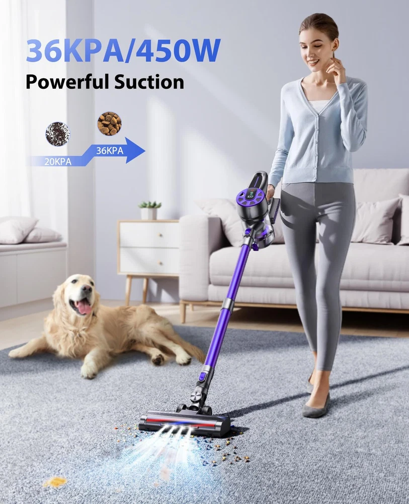 【36Kpa Strong Suction Power & Quiet Operation】The Cordless Vacuum Cleaner – an unrivaled cleaning powerhouse. Armed with a robust 450W brushless motor and a versatile selection of brush accessories, this vacuum boasts an incredible 36Kpa suction power, effortlessly annihilating dirt, debris, and stubborn pet hair on any surface, as tiny as 0.01mm, whether it's hardwood floors or plush carpets. Enjoying a peaceful cleaning experience with its whisper-quiet 62dB operation. 【Multi-Stage Filtration System & 1.5L Dust Cup】Breathe freely with our cutting-edge 5-stage cyclone filtration system, which efficiently captures a staggering 99.99% of microscopic dust particles as tiny as 0.01mm. Ensure a healthier living environment for your loved ones, including infants, seniors, and those with sensitivities. Bid farewell to the inconvenience of frequent emptying, thanks to the capacious 1.5-liter dust cup. 【Max 45~55Mins Long-Runtime, Detachable Battery】For uninterrupted cleaning sessions, the stick vacuum boasts a high-capacity 7*2200mAh rechargeable battery, delivering an impressive 45~55 minutes of runtime in Eco mode and 20 minutes in Max mode. Whether you have a spacious home or rigorous cleaning requirements, it's a perfect choice. The detachable battery is easily replaceable and charges swiftly in just 4 hours. 【All-in-ONE LED Display & Flexible Led Brush】The cordless vacuums take command with our intuitive All-in-ONE LED display, providing real-time updates on modes, battery status, and blockages. But the innovation doesn't end there. Our Flexible LED Motorized Brush and LED Display are meticulously crafted to perfection, featuring a 180° swivel brush and three LED lights that illuminate even the trickiest corners, transforming it into an intelligent and user-friendly cleaning companion. 【Ultra-Lightweight & Multi-Function】Weighing a mere 2.7 lbs, the cordless vacuum cleaner is effortlessly maneuverable. It offers wall mount options for convenient storage and charging. With a range of accessories, it can be configured into six versatile combinations, effectively handling all your diverse cleaning needs. We offer 2-year warranty and 1-year free return policy, backed by our round-the-clock dedicated customer service.
