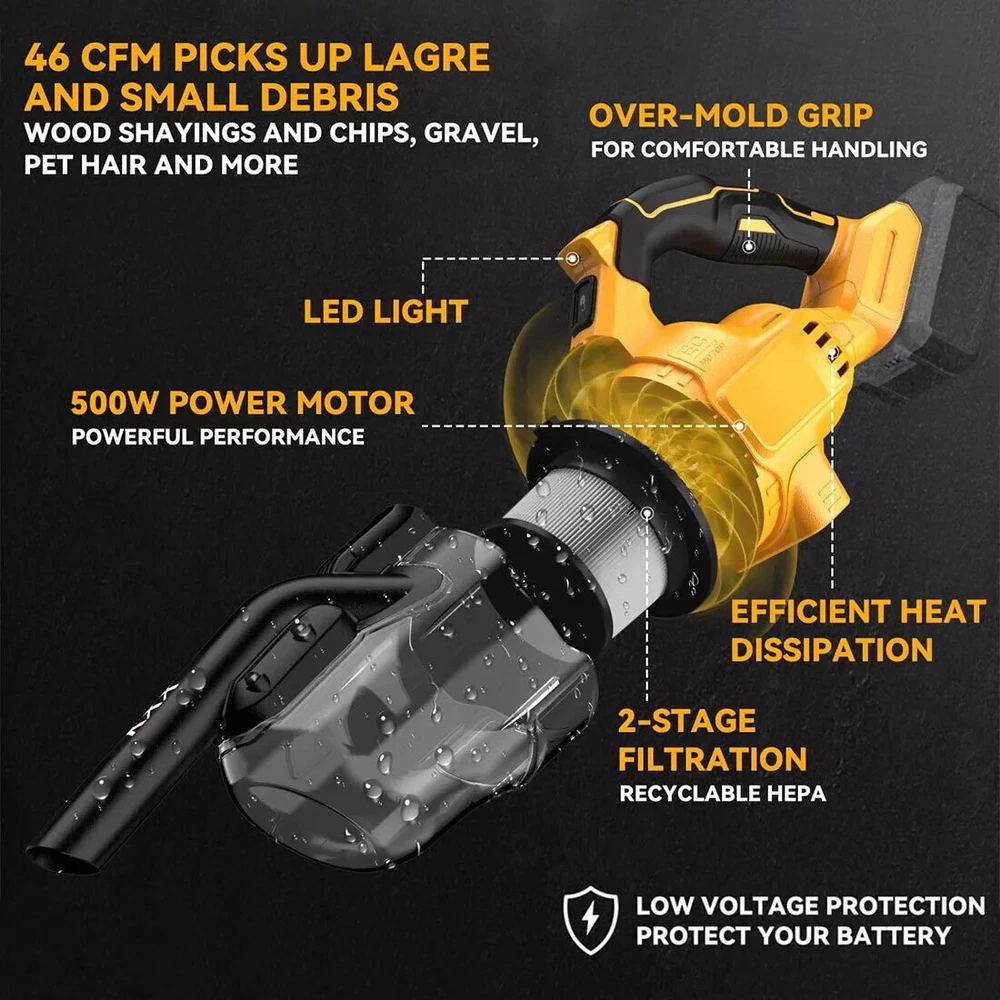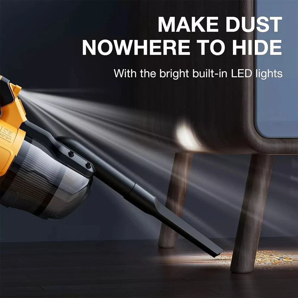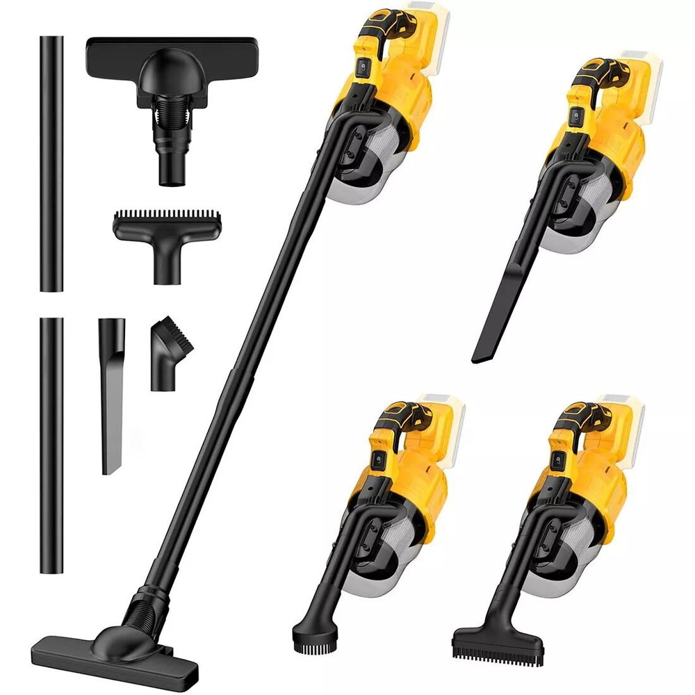 【German-Inspired Design】 Featuring a design inspired by German engineering, this vacuum cleaner is not only visually appealing but also strives for perfection in user experience. Its streamlined design makes it easy to operate while providing an excellent grip, allowing effortless cleaning. 【Compatible with DeWalt DCB Series Batteries】 Compatible with DeWalt DCB series batteries, you no longer have to worry about power issues. The robust battery supports extended use, making it suitable for various cleaning scenarios, ensuring you won't have interruptions while cleaning. 【For Multi-Scenario Use 】 Comes with multiple types of vacuum hoses, adaptable to different cleaning needs. Whether cleaning floors, furniture, or hard-to-reach corners, users can easily switch between hoses to tackle any cleaning challenge. Applicable Scenarios: Home cleaning Interior car cleaning Office and workspace cleaning Product Features: Lightweight design for easy portability and storage. Powerful suction for thorough cleaning. Simple operating interface, suitable for all users. 4 Accessory cleaning solutions. Easy empty canister to minimize exposure to dust and debris. concrete and drywall. A bright LED light illuminates the darkest areas. SpecificationsSpecificationsType : HandheldRated input power:500 WVacuum degree :16000paColour:YellowCompatible Battery :For Dewalt 20V BatteryBattery Included : NOAir Flow (CFM):46CFMRPM:30000R/MIN What's In Box 1 x Vacuum cleaner (Without battery) 1 x crevice nozzle 2 x brush 2 × Suction long pole 1 × instruction manual