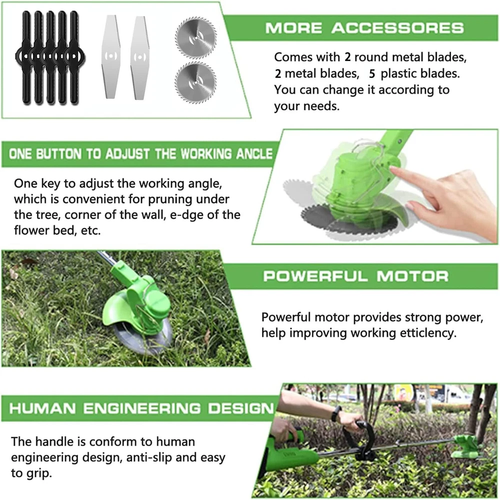 Cordless wacker Electric Weed Eater Lawn Edger brush cutter trimmer 新建网页 5 Feature: 【Powerful and Efficient Weeder】The multifunctional cordless electric weeder is widely used and can be used as a lawnmower, edge trimmer, and lawn mower to facilitate different mowing operations. The upgraded 1600 W electric lawn mower battery power supply is built to handle heavier workloads, allowing the cordless electric lawn mower to reach speeds up to 30,000 rpm. 【3 Types of Replaceable Blades】: This battery-operated grass eater is equipped with 3 types of blades. Nylon blades trim young grass. The stainless steel blade is used to quickly cut lawns, weeds and small shrubs. High cutting power manganese steel circular saw blade for pruning thick shrubbery branches. Different blades meet different weeding needs and are suitable for mowing around the yard. 【New handle lightweight and safe design】Our lawnmower weighs only 3.28 pounds, lightweight, even the elderly or women can control and use it easily&. Double safety button design, you need to press the safety lock and trigger at the same time to start the brush cutter, ensuring your safety. The new C-shaped ergonomically designed handle will not make you feel tired even after working for a long time, and can be hung anywhere. Easily keep your garden and yard clean and tidy. 【Adjustable Height and Cutting Angle】The stringless trimmer is equipped with an adjustable telescopic shaft that can be freely adjusted from 33 inches to 47 inches to meet the needs of most people for garden pruning work. The swivel head of this electric weed eater is adjustable (0 - 90°) to help you get into hard-to-reach corners without being restricted by wires. Telescopic design can further reduce the space occupied and make moving and storage more convenient! [2 Pcs 24V/2000 mAh lithium battery (high power, high efficiency)] 2000 mAh electric brush cutter is more efficient, longer running time (120-150 minutes without load), charging time (2-3 hours), two The battery packs work alternately to weed the entire yard with ease. Lower noise, no emissions, no need for multiple starts and minimal maintenance compared to gas lawn mowers. Specification: Material: aluminum + plastic Voltage: 21V Battery capacity: 2000mah Rotation speed: 20000 U/min Power: 900W Telescopic tube: 90cm/35.4 inches ~120cm/47.2 inches Round blade diameter: 15 cm/5.9 inches Straight blade diameter: 14.6 cm/5.74 inches Power supply type: 2 lithium batteries No-load running time: 90-150 minutes Package: 1 x lawnmower 2 x batteries 2 x rectangular alloy saw blade 2 x round alloy saw blades 5 x plastic saw blades 1 x baffle 1 x wrench 1 x charger 1 x instruction manual We only accept Paypal . Payment is expected within 2 days from the end of the auction. We send all the items are based on your paypal address. Therefore, please make sure your paypal address is valid. * International Buyers Please Note: Import duties, taxes and charges are not included in the item price or shipping charges. These charges are the buyer’s responsibility. Please check your country’s custom office to determine whether these additional costs will be prior to bidding / buying. We only ship this item to United State! We ship to your eBay address. Each package will be shipped to USA by UPS or Fedex with tracking number. Please check your shipping address carefully before checkout, it can't be changed if order completed. Ship within 1-2 business day once payment completed. Orders placed on weekend will be shipped within 3 days. Seriously promise: Refund or resend will be offered if item still not arrive in 7-10 business days. Just send us an email ,we will give you a satisfied solution as soon as possible. We maintain high standards of excellence FIVE STAR and strive for 100% customer satisfaction! Positive Feedback is very important to us. We hope that you contact us immediately BEFORE you give us neutral or negative feedback, so that we can satisfactorily address your concerns. We promise to offer the lowest price and high quality produce. Our working time: From Monday to Friday(9:00 am to 18:00pm), we do not work on holidays in China,hope you can understand and know that , thank you. Please always talk to us via ebay Message. We appreciate your business and look forward to growing our e-Bay sales with satisfied customers. If you dissatisfied for any reason, Please don't leave negative or neutral feedback at once. We work hard to make sure EVERY CUSTOMER 100% SATISFIED and resolve any problem for you and always leave positive feedback for all our customers. If you are satisfied with the product you received ,please leave us positive feedback and 5 scores DSR. Dear buyers,Welcome to our store!Your satisfaction is our top goal,we appreciate your business. If you have any questions, please feel free to contact with us by ebay Message during our business hours ( 9:30a.m. to 5:30 p.m.), or email us through eBay, we will try our best to help you to resolve it. If you are satisfied with our service, please rate the details of the transaction (Detailed Seller Ratings) on eBay and We will do the same for you. If you are not satisfied with the product or service ,please contact us before leave negative or natural feedback, we will try our best to solve the issue to your satisfaction, thanks. For any presale or after-sale questions,please do feel free to email us! Due to the time difference, each email will be replied within 1 working day,and weekend will be delayed a bitThanks for your patronizing!