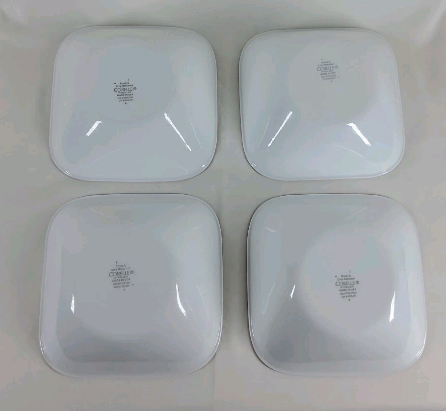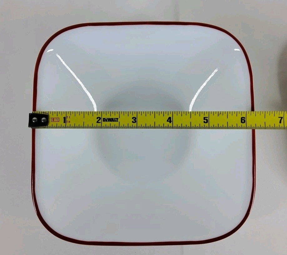 Material: Glass Character: Chip Color: White Type: Bowl Set Number of Items in Set: Four-Piece Finish: Shiny gtin13: Does not apply Item Depth: 2 inches Original/Reproduction: Original Theme: Food/Kitchen Style: Contemporary Pattern: Red Trim Personalize: No Country/Region of Manufacture: United States Item Diameter: 6 in Shape: Square UPC: Does not apply Brand: Corelle