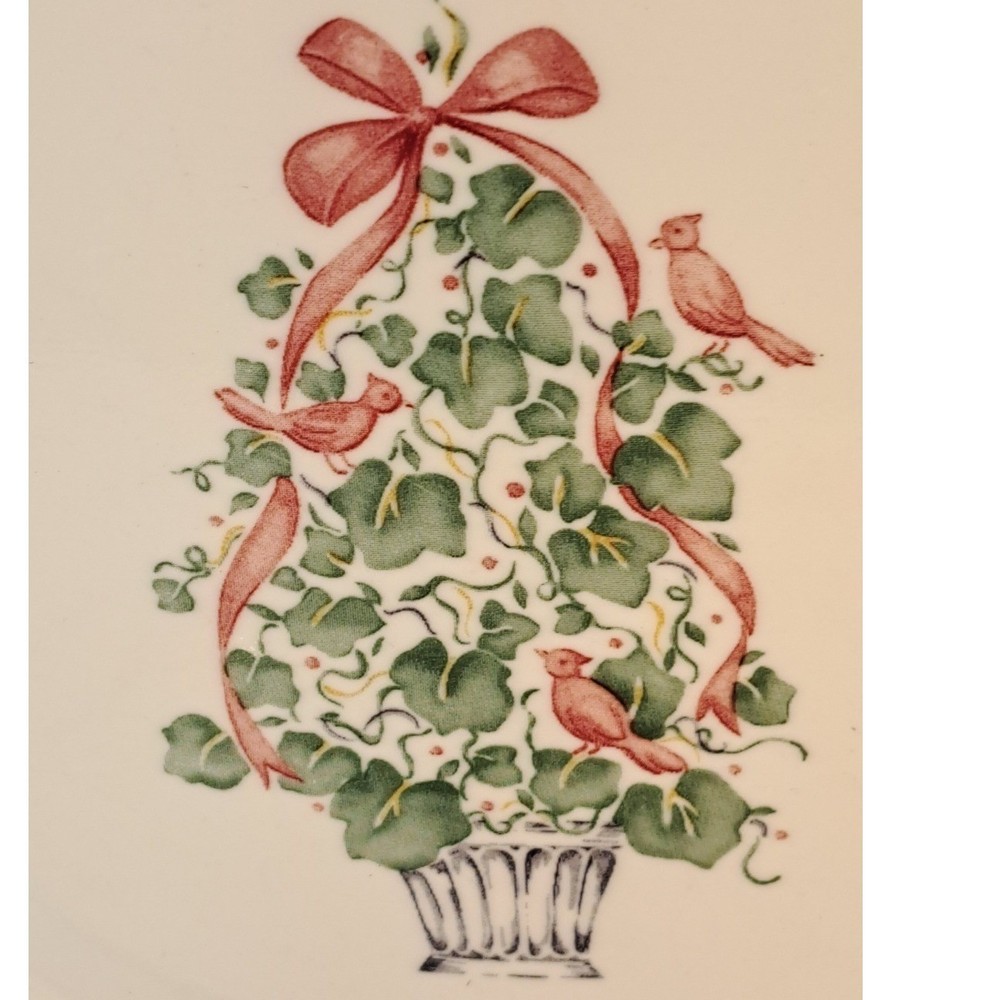Corelle by Corning Callaway Holiday dinner plates bring a festive touch to your seasonal table setting. This set of four plates features a central topiary design composed of green ivy leaves and red cardinals, accented by a pink ribbon bow. A matching pink ribbon border and a dark green rim frame the scalloped edges of these durable Vitrelle glass plates. Known for being lightweight and break-resistant, these plates are also microwave and dishwasher safe, making them as practical as they are charming for holiday entertaining. Brand: Corelle by Corning Pattern: Holiday Ivy Callaway Material: Vitrelle Glass Color: White, Green, Pink, Red Shape: Round Edge: Scalloped Design: Ivy Topiary with Cardinals and Ribbons Country of Manufacture: USA Features: Microwave Safe, Chip Resistant Keywords: Christmas, Holiday, Winter, Topiary, Cardinal, Ivy, Vintage Corelle, CorningWare, Festive Table, Seasonal Dining, Shabby Chic, Traditional, Farmhouse Holiday
