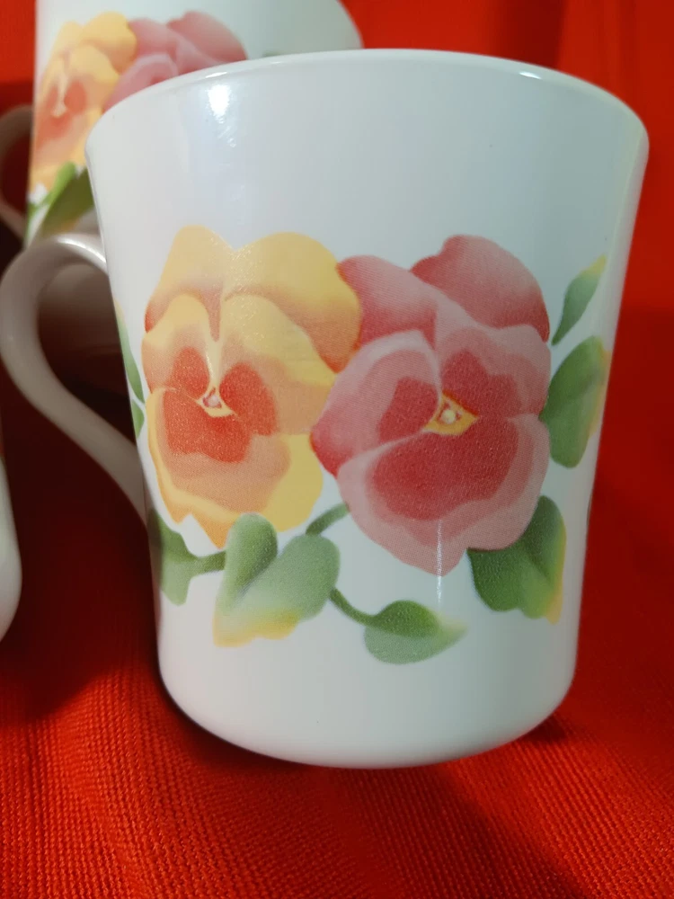 Made by Corning this set of 4 vintage mugs are in Summrr Blush pattern. Or Summer Pansies as some people call it. These mugs are in pristine condition.