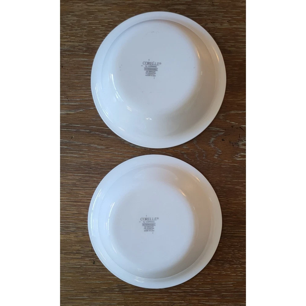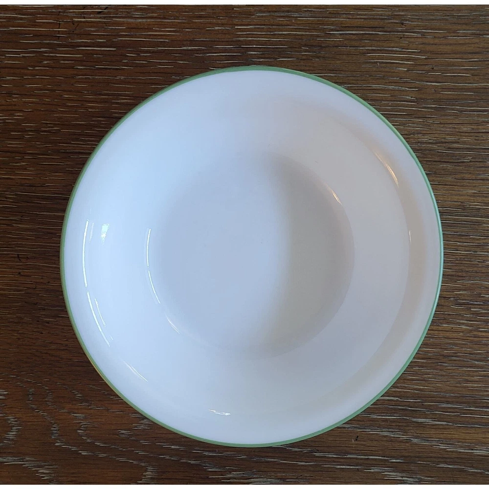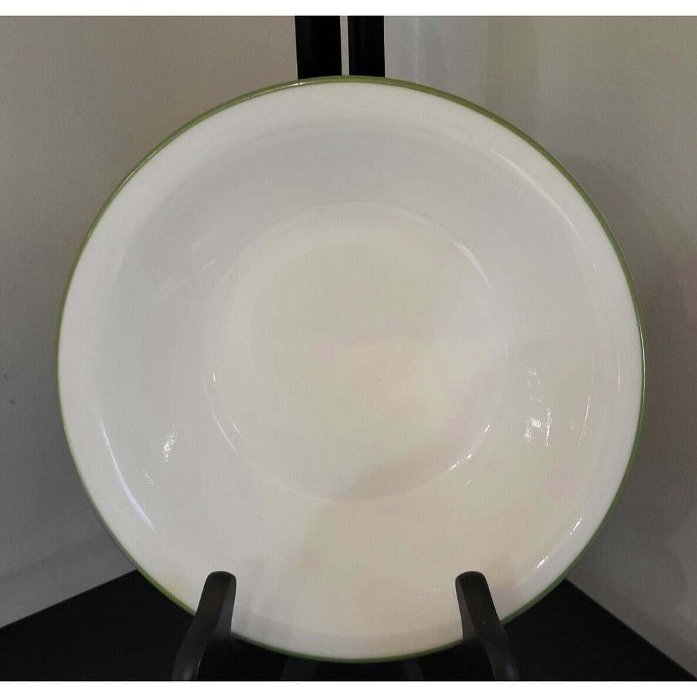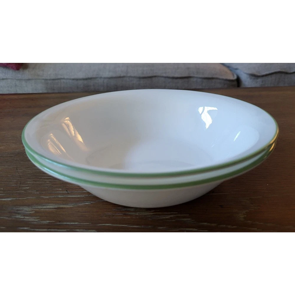 Add a touch of elegance to your dining table with this set of two Corelle Shadow Iris cereal/soup bowls. The round bowls feature the green rim, which are part of the shadow iris pattern. They are made of virtrelle material, which makes them break-resistant, stackable, microwave safe, dishwasher safe, and decorative. The glossy finish and green rim add a pop of color to any occasion, whether it's a formal dinner or a casual lunch with friends. The set includes three bowls and is an original Corelle product, produced using pressed glass and fused glass techniques in the United States. The backstamp is printed, and the bowls are part of the Shadow Iris product line. Perfect for all occasions, these bowls are a must-have addition to any kitchen or dining room. Excellent condition bowls. No chips...