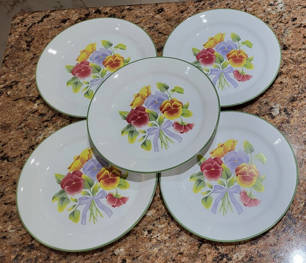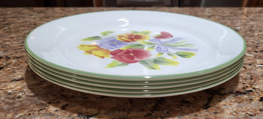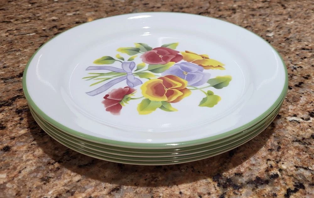 Elevate your dining experience with the timeless elegance of Corelle's Summer Blush luncheon plates. Each plate in this set of five showcases a delicate array of multicolor pastel florals and pansies, bringing a touch of nature's beauty to your table. Crafted from durable glass, these plates are not only decorative but also highly functional, designed to withstand the rigors of daily use. With a generous 9-inch diameter, they provide ample space for your favorite salads and lunch dishes. Their glossy finish and fused glass production style ensure a sleek, seamless appearance. These plates are stackable for easy storage, microwave and dishwasher safe, and can be gently machine washed at up to 140°F to maintain their charm. Whether for everyday use or special occasions, these Corelle plates are a testament to classic American craftsmanship. Excellent condition set of plates! Add them to your kitchen. Great for replacements, daily use or display!