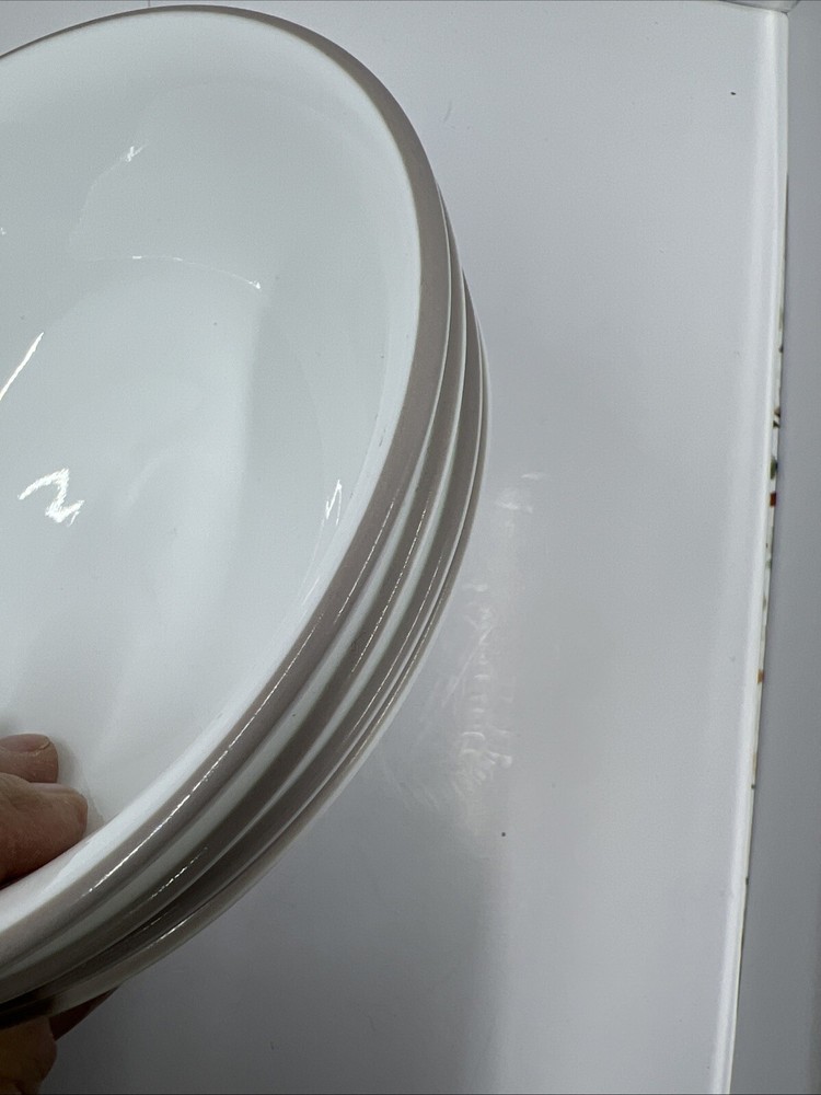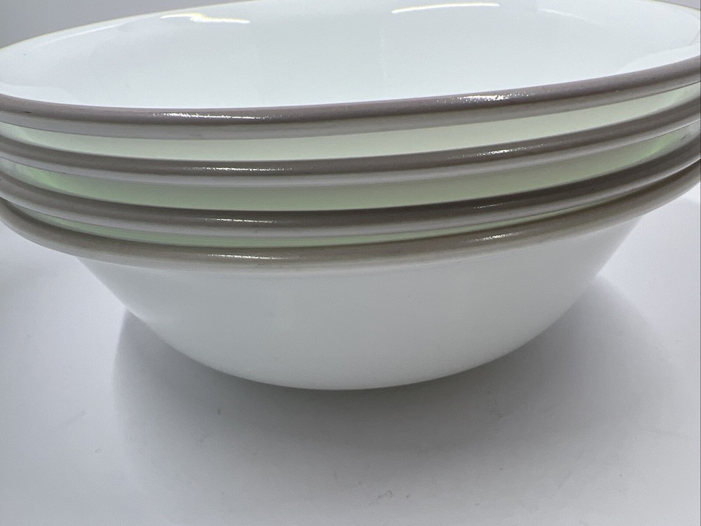 Pattern:MartiniColor:White with brown rimCountry/Region of Manufacture:United StatesType:Cereal/Soup BowlsNumber of Items in Set:Four-PieceBrand:CorelleShape:RoundItem Height:6 inMaterial:GlassOccasion:All OccasionsModel:Corelle Vitrelle
