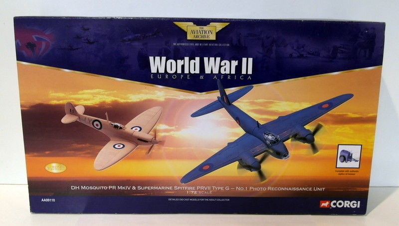 Corgi 1/72 scale diecast AA99110 DH Mosquito PR MkIV Supermarine Spitfire PRVII Contact Us Home About Us Feedback Contact Us Add to favourites Corgi 1/72 scale diecast AA99110 DH Mosquito PR MkIV Supermarine Spitfire PRVII click thumbnails above to enlarge Shop Home Our Feedback Ask a Question Product Description 1/72 Scale Diecast Model by CORGI The MODEL is in MINT condition . The BOX is in GOOD Condition. Product Details Scale 1/72 Material Diecast Brand CORGI EAN 7427043124570 Additional Info GRADING CONDITIONS MINT - The item is in perfect condition. NEAR MINT - Almost perfect, any imperfections will be extremely minor. EXCELLENT - The item will have had very careful use, with only small imperfections. GOOD - The item will have had more use, showing obvious imperfections. FAIR - The item will have heavy signs of wear, showing major imperfections. SPARES or REPAIR - The item will be in a poor condition. Payment Shipping Returns About Us Methods of Payment Our preferred method of payment is Paypal. Any questions please ask! Thanks. WORLDWIDE MAIL-ORDER SPECIALISTS Shipping within the UK is FREE OF CHARGE - Plese see the eBay postage tab for other worldwide shipping charges. We ship from our warehouse is the UK. We ship worldwide everyday using a Tracked / Signed For service. Over 30 years of experience shipping collectible models worldwide - you can trust our service. Any questions, please ask. Thanks for looking ! Returns We hope you are completely satisfied with your purchase. In the unlikely event that there is a problem / fault with the item we will happily provide you with a refund (excluding returns postage). About Us R.M.Toys Ltd is a family led company with over 50 years worth of experience specialising in high quality collectable models & worldwide delivery. We have continued to expand and develop as the retail market and technology has evolved and we are in no doubt we will need to continue with that trend so we hope we have been able to showcase our service and provide you, our customer, with everything you have required. Our aim is to ensure no matter what the model, we will provide an excellent service experience. To us, this means great availability, excellent customer service as well as quick & secure delivery, to anywhere across the world. All that is left to say is Thank You for taking the time to read our page and using our company to assist with your collection and gift needs - every order placed is gratefully received and as important to us as the next. Kind Regards The RM Toys Team R.M.Toys Ltd - All Rights Reserved || Design by Tapika Store The MODEL is in MINT condition . The BOX is in GOOD Condition.