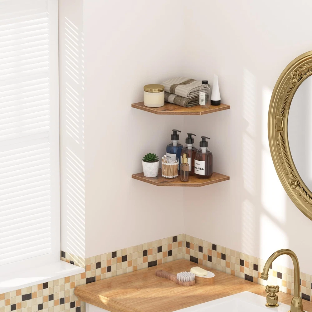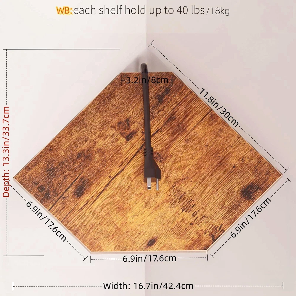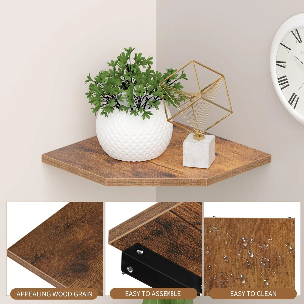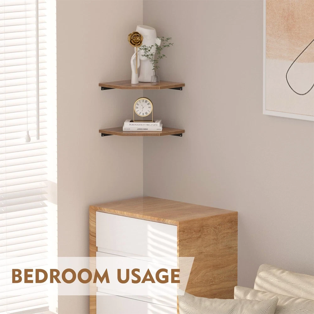 Modern Elegance: Crafted from premium Density Board, the corner wall shelves feature a minimalist design that creates a simple and clean look, enhancing the fashionable beauty of your space Cabling Space: The corner shelf has 3.2" incision on the rear corner to allow for the passage of large plugs. With a shelf dimension of 13.3" depth and 16.7" width, it is wide enough to accommodate devices such as security cameras, DVD players, etc Create a Striking Corner: A 2-tier wood wall shelf expands your storage space, turning the corner into elegant and useful storage and display space. Not only does it reduce clutter, but it also highlights your modern decor. Ideal for displaying photos, collectibles, plants, or other decorative items in the living room, bedroom, study, or corridor Easy to Install: Instructions and mounting hardware are included. Just place the corner wall shelf in the desired position, level it, and fix it with screws using the hidden bracket connectors Easy installation: Includes instructions and installation hardware. Designed for 90° corners, Suitable for concrete or wood walls with a thickness of at least 2 inches. Concrete walls must be drilled, fixed anchors inserted, and corner frames installed. Note: Before drilling, use a level to level, position, and drill