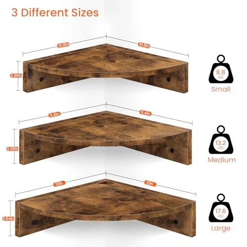 Manufacturer: Does Not Apply Finish Type: Painted Number of Shelves: 3 Date First Available: September 5, 2022 Specific Uses For Product: Organizing items, providing additional storage, and enhancing dec Item Weight: 2.8 Kilograms UPC: Does Not Apply gtin13: Does Not Apply Age Range Description: Adult Weight capacity: Maximum weight: 17.6 Pounds Product Care Instructions: Wipe with Dry Cloth EAN: Does Not Apply Unit Count: 3.0 Count Number of Items: 3 Item Height: 1 Brand: Does Not Apply Product Dimensions: 11.5"D x 16"W x 2.9"H Type: Does Not Apply Installation Type: Wall Mount Item Length: 1 Shelf Thickness: 2.36 Inches Furniture Finish: Wood Product Name: corner shelf Room Type: Bedroom, Living Room, Bathroom, Dining Room, Kitchen, Home Office Style: Rustic MPN: Does Not Apply Recommended Uses For Product: Bathroom, Kitchen, Living Room, Bedroom Assembly Required: Yes Color: Brown Min Required Door Width: 13 Inches Item Width: 1 Weight Limit: 17.6 Pounds Included Components: Mounting hardware Special Feature: Wire Hole