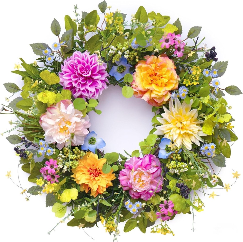 Coronas de verano para exteriores para la puerta principal con peonías y dalias Impresionante corona: la corona de primavera de Soomeir es una obra maestra hecha por diseñadores florales profesionales, con dalias vibrantes, peonías y una mezcla de exuberante vegetación artificial. Sus colores vivos son la manera perfecta de hacer que tu hogar destaque en el vecindario. Belleza llamativa: prepárate para sorprenderte con la plenitud y elegancia de esta corona de peonía de primavera y verano. La vegetación realista y las elegantes flores crean un ambiente fresco y natural. Ya sea que se muestre en tu puerta delantera, sala de estar, chimenea, armarios, paredes, ventanas, escalera o balcón, o se utiliza como centro de mesa, esta corona complementa cualquier estilo de decoración del hogar durante todo el año. Duradera y resistente: la corona de primavera y verano para puerta delantera hecha de flores de seda artificial está hecha a mano y las flores están unidas de forma segura a una base de enredadera. Es ligero y fácil de colgar en un típico colgador de corona. Incluso con el uso a largo plazo al aire libre, no hay necesidad de preocuparse por la decoloración o deformación de la corona. Tamaño perfecto: el ancho diagonal de la corona de primavera para puerta debe ser de 22 pulgadas, y su profundidad debe ser de 5 a 6 pulgadas. Debido a razones de envío, hemos empaquetado la corona en una caja más pequeña. Ajusta la corona de acuerdo con las instrucciones de la tarjeta antes de colgarla, y obtendrás una corona completa y hermosa Listo para usar: trae la frescura de la primavera a tu hogar en solo 2-3 minutos. Simplemente esponja la corona para restaurar su aspecto vibrante y completo. Viene en una caja de embalaje premium para un fácil transporte y almacenamiento, por lo que es un regalo maravilloso para cualquier ocasión.