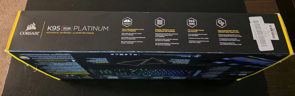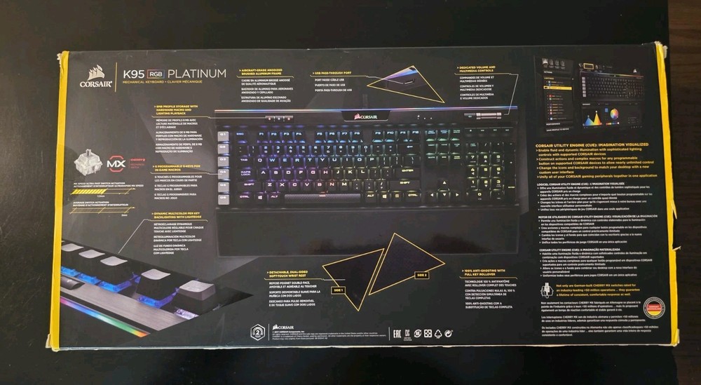 The Corsair K95 RGB Platinum Mechanical Gaming Keyboard is designed for gamers. It features 6 programmable macro keys, multimedia integration, detachable palm/wrist rest, and illuminated keys. This QWERTY keyboard has a plug & play setup, USB 3.0 connectivity, and is programmable. It comes in black with English keyboard language.