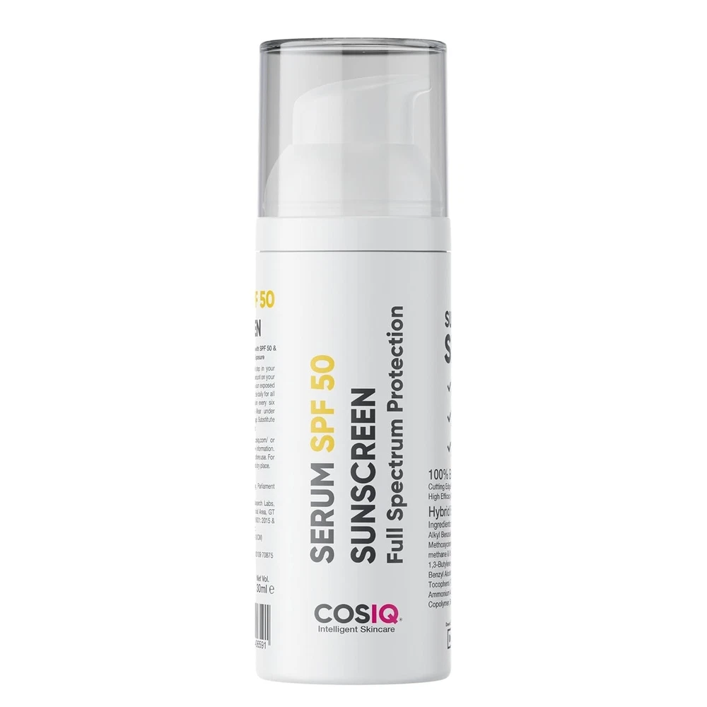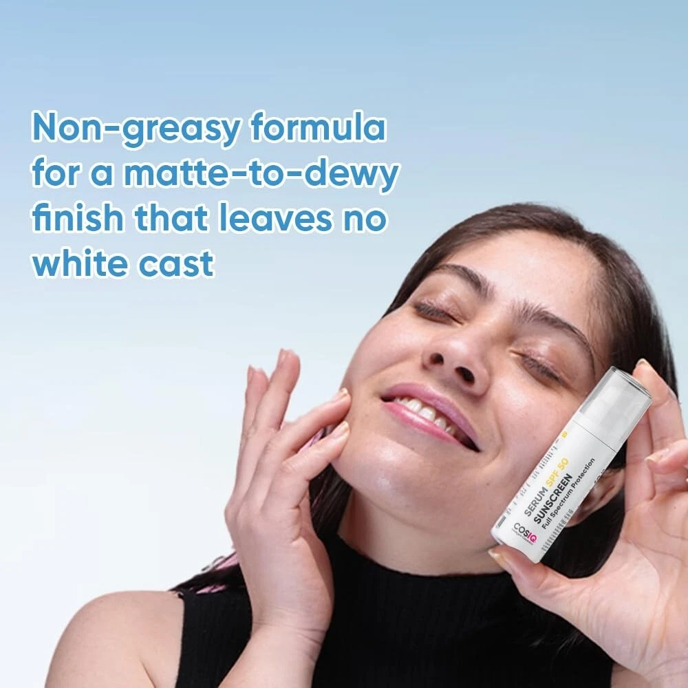 About this item ✅PROVIDES BROAD SPECTRUM PROTECTION (PA++++): The PA grading system in sunscreens indicates the level of protection from UVA rays. The presence of more than three ‘+’ signs signifies that the sunscreen provides the best protection against UVA rays. Our hybrid serum-based SPF 50 sunscreen with PA++++ is formulated with an effective combination of Hyaluronic Acid and Vitamin E. It protects from sun damage while also reducing fine lines and wrinkles and making your skin soft and supple. ✅PROTECTS AGAINST BLUE LIGHT: Blue light, a type of high-energy visible light is emitted by several electronic devices. The blue light from these devices not only disrupts our sleep cycle but also damages our skin significantly. This is why we bring to you Hyaluronic serum based Sunscreen with Vitamin E that not only protects your skin from the sun but also screens. Here’s your skin’s new BFF for healthy and damage-free. ✅NON-GREASY & FRAGRANCE-FREE: Say goodbye to the greasy and oily finish of typical sunscreens. The CosIQ Serum-Based Sunscreen SPF 50 PA++++ with Hyaluronic Sunscreen is fragrance-free and doesn’t clog your pores. The presence of concentration of Hyaluronic Acid in this sunscreen makes it quick to absorb and provides intense hydration to the skin. Extremely lightweight in nature, the sunscreen dissolves like water, hence the name ‘Serum SPF50’. ✅SAFE & EFFECTIVE FORMULATION: Free from toxins, fragrance, this sunscreen with PA++++ has a safe & effective formulation that offers a visible difference in 3-6 weeks. ✅WHO IS IT SUITABLE FOR?: Those looking for a non-greasy, fragrance-free broad spectrum protection against UV rays and blue light. Anyone with normal, Oily, Dry, Sensitive, Combination Skin, acne-prone or blemish-prone skin can use this sunscreen. Safety Information: Patch Test Recommended Ingredients: Aqua, Aloe Vera Leaf Ext, C12-15 Alkyl Benzoate, Glycerine, Water & Ethylhexyl Methoxycinnamate & Butyl Methoxydibenzoylmethane & Octocrylene & Phospholipids & 1,3-Butylene Glycol, Propanediol, Zinc Oxide, Hyaluronic Acid*, Benzyl Alcohol (and) Ethylhexylglycerin (and) Tocopherol, Polysorbate 20, Bamboo Water, Ammonium Acryloyldimethyltaurate/VP Copolymer, Sodium Gluconate, Vitamin E Directions: 1. Take an adequate amount of sunscreen. 2. Apply on your face & neck in your AM skincare routine. 3. Apply the sunscreen at least 15 minutes before sun exposure & reapply every 6 hours. From the brand #COSIQCULT Safe | Ethical | Affordable Previous page Next page Product Description