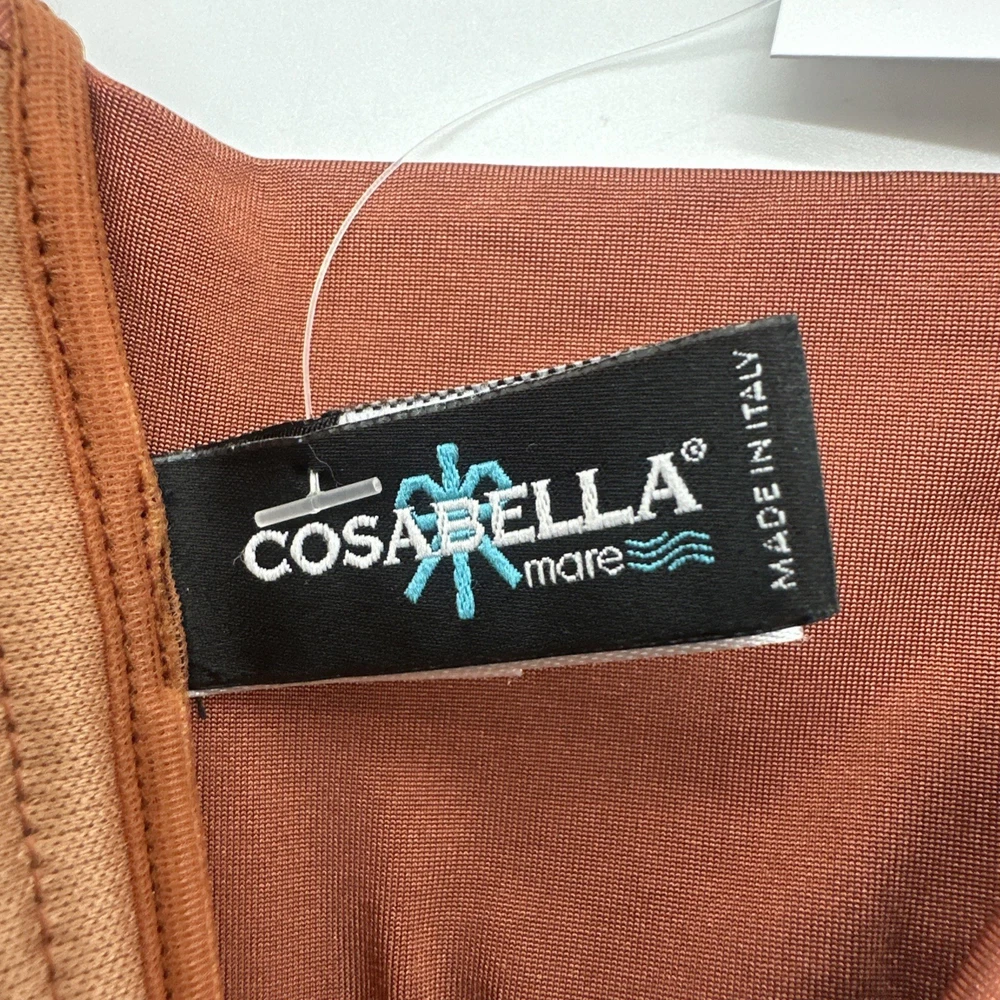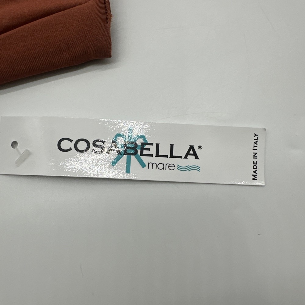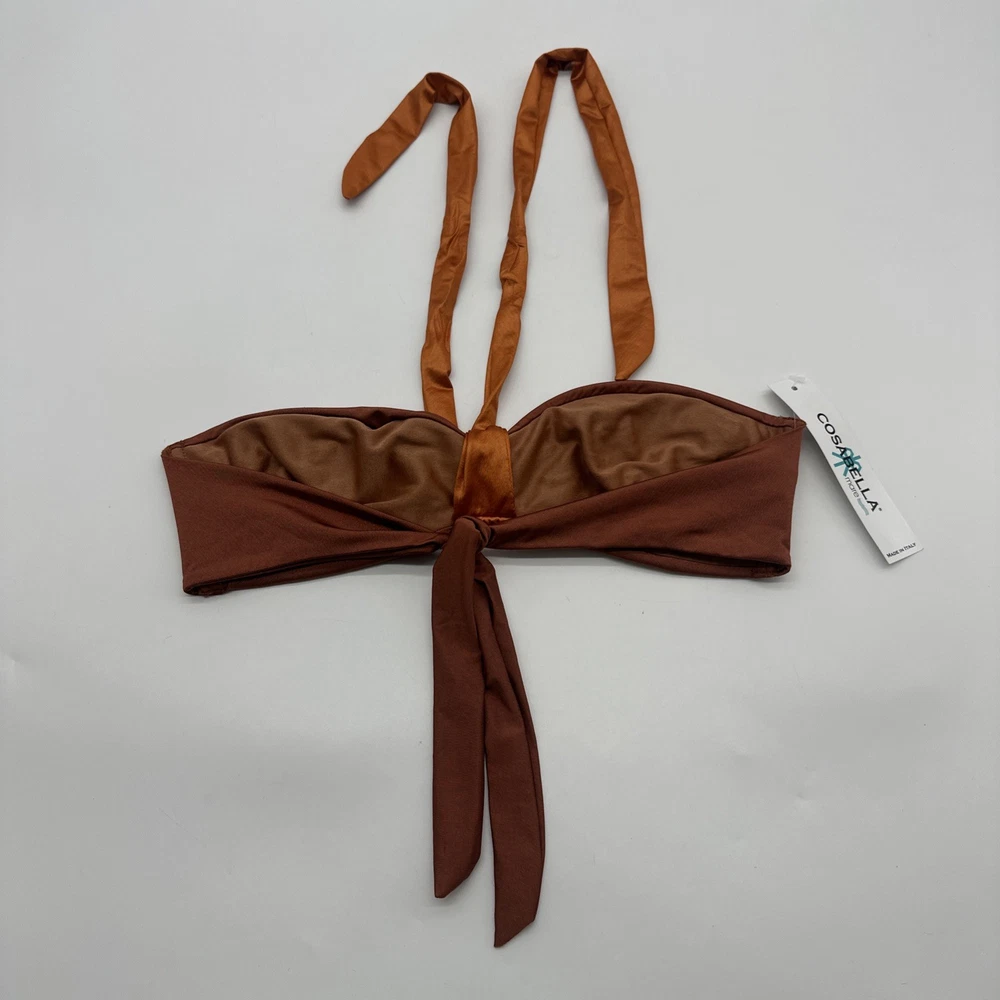 The Cosabella Mare Tuxedo Padded Bandeu Swim Top in Copper is a stylish and luxurious bikini top designed for women. Made in Italy with a blend of spandex and polyamide, this top features a solid brown color and a padded design for added comfort and support. With a flattering bandeau style and a size small fit, this Cosabella top exudes an Italian theme, making it a chic and fashionable choice for any beach or poolside look. Check pictures for flaws and measurements