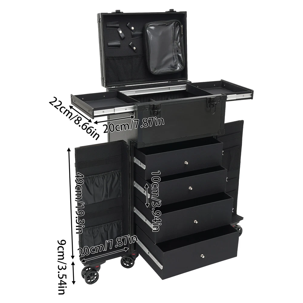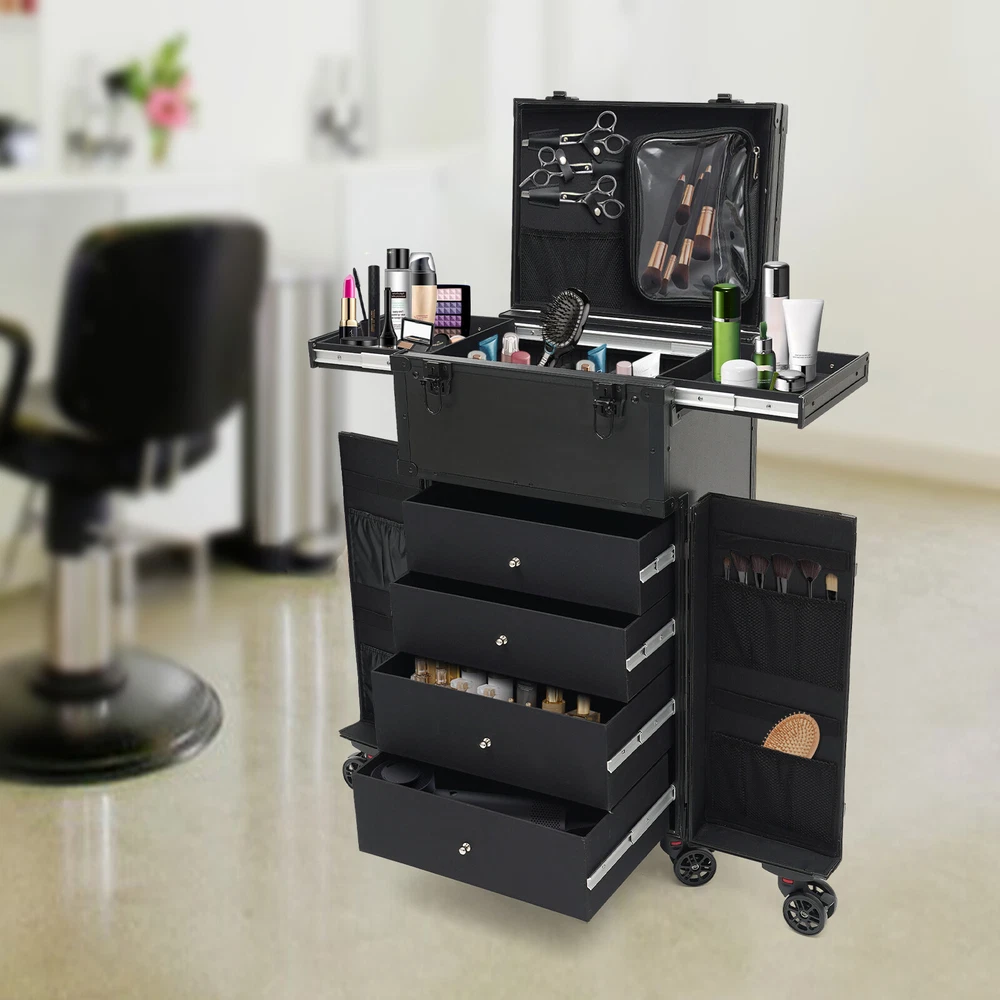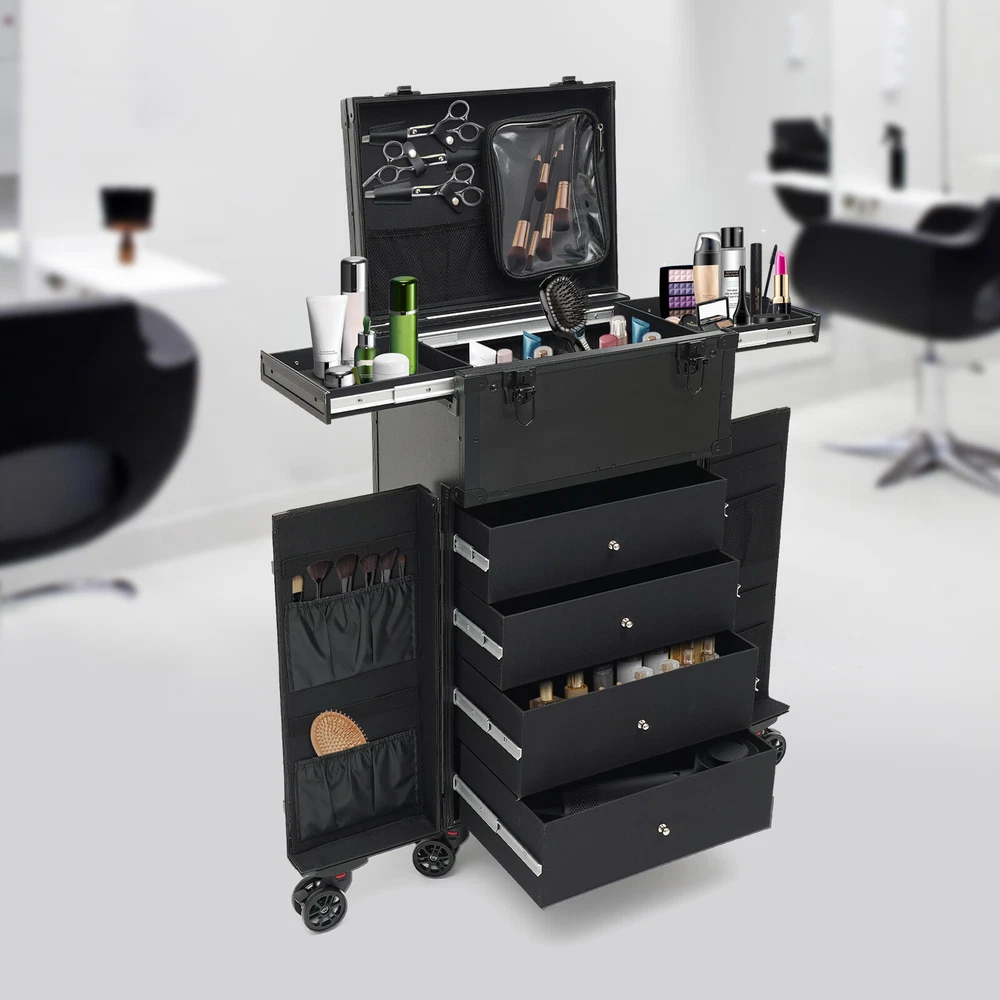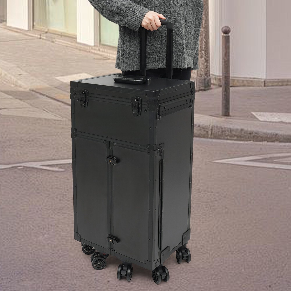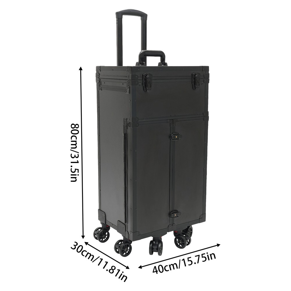 Cosmetic Suitcase Beauty Facial Storage Makeup Travel Box Salon Trolley Cart Rolling Makeup Case, Makeup Organizer Travel Case, Professional Makeup Case+6Wheels&Drawers Description Whether you're working or traveling, a professional makeup case will be a great convenience. This makeup case is made of high-quality aluminum alloy and ABS that is strong and durable. The top scissor groove and a small bag, the middle movable partition, the storage box under the partition, the lower 4 pull-out drawers, and side door pockets allow you to sort and store items. The strong load-bearing capacity allows you to store items with confidence. In short, it is the ideal choice for professional makeup artists and beauticians. Key Features Premium Materials: This product is made of high-quality aluminum alloy and ABS, which is corrosion-resistant, wear-resistant , and durable , ensuring your long-term use. Classified Storage: The top scissor groove and a small bag can be used to store accessories, and the middle movable partition can be used to store styling tools. The storage box under the partition can be used to store nail polish, lipstick, brush, or hair remover(all are not included). The lower 4 pull-out drawers can be used to store sprays, curlers, hair dryers (all are not included), or other supplies. The side door pockets can be used to store eye black, eyeliner pens, and combs(all are not included), making your items neat and orderly. Thoughtful Design: Three adjustable rod lengths allow you to freely adjust the rod length, while also being suitable for people of different heights. In addition, the detachable universal wheels enable you to replace them conveniently when damaged, which is easy and cost-efficient. Strong Load-bearing Capacity: This product can bear a weight of 66.14 lbs , allowing you to use it with confidence without worrying about damage due to excessive items. High Practicality: It can be used as a beauty table, allowing you to do beauty work anytime, anywhere. Protect Your Privacy: The safety buckle can protect valuable items inside your box and maximize your privacy. Generous Appearance: The black color scheme, rectangular shape, and smooth lines give this product a generous appearance, nicely decorating your dressing room. Excellent Gift: Its exquisite design and large capacity make this product a great gift to your mother, girlfriend, sisters, wife, and loved ones so that they can enjoy more convenient makeup time. Protective Packaging: The sponge s can better protect your product during transportation and make it delivered to you completely to the greatest extent. Details Durable Handle: The ergonomically designed handle can relieve finger pressure and provide you with a comfortable user experience. Wide Opening: With a wide opening, it is easy for you to store and retrieve certain items without messing up other items in the box. Clear Storage Bag: It is effective against dust and water and easy to search for the contents. Universal Wheels: The bottom 6 universal wheels allow you to easily move this product. Application It is recommended for make-up artists from beginners to professionals such as freelance make-up artists, wedding make-up artists, celebrity make-up artists, and make-up interns. It can also be used for traveling or kept at home for makeup enthusiasts, hair barbers/stylists, nail technicians, estheticians, embroiderers, and crafters. Specification Color: Black Shape: Rectangular Style: Modern Material: Aluminum Alloy, ABS Assembly Required: Yes Single Side Partition Size: 20*22cm/7.87*8.66in Case Door Size(L * H): 20*49cm/7.87*19.3in Overall Product Size: 40*30*80cm/15.75*11.81*31.5in Load-bearing Capacity: 30kg/66.14lbs Gross Weight: 10kg/22.05lbs Net Weight: 9kg/19.84lbs Package Size: 83*33*45cm/32.68*13*17.72in Package Included 1* Makeup Case 6* Universal Wheels 4* Keys Notes Please note that items other than this product are not included. The service wear of the case is a normal phenomenon. In the process of daily use, please try to avoid excessive impact and drop to extend the lifespan of the product. Please use soft tools and water to clean. Please keep away from corrosive liquids. Please avoid long-term exposure to the sun. Please use this product within its carrying capacity. Please allow the slight color difference caused by the shooting light and the 1-3 cm error due to manual measurement, and make sure you do not mind before ordering. Payment Delivery details Terms of sales About us Contact us Payment We accept ebay payment 。 Fees such as import duties, taxes are not included in the item price or shipping costs. These charges are the buyer's responsibility. Delivery details Shipping: 2-9 working days to: USA Terms of sales We maintain high standards of excellence and strive for hundred percent customer satisfaction. Feedback is very important to us. We hope that you contact us immediately before you give neutral or negative feedback, so that we can address your concerns. It is impossible to address issues if we do not know about them! About us Your satis faction is our ultimate goal. We work hard to earn your trust and future business. Our certified technicians have tested each item before shipping. The unit comes with 1 year limited warranty on all manufacturing defects. a) If you receive a defective item, you may return it or ask for a discount. Please contact us within 14 days after you receive the package. b) What you returned must be intact and in its original packaging as re? u. Customer is responsible for shipping costs of the returned item. c) We will cover the cost of shipping back t with the shipping rate indicated in the registration page. We will send you a new unit or refund the full payment you paid. Thank you. Contact us Business Hour Business Hour: Monday To Friday: 8:30 AM to 5:00 PM (Beijing China time) Due to time zones, our reply to your questions may not be immediately. But within above working time, we will reply your email w