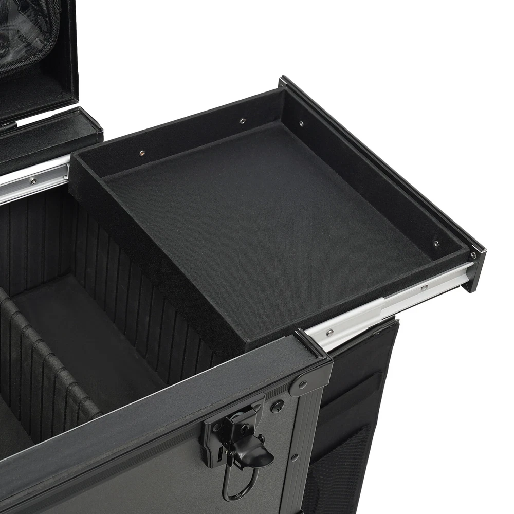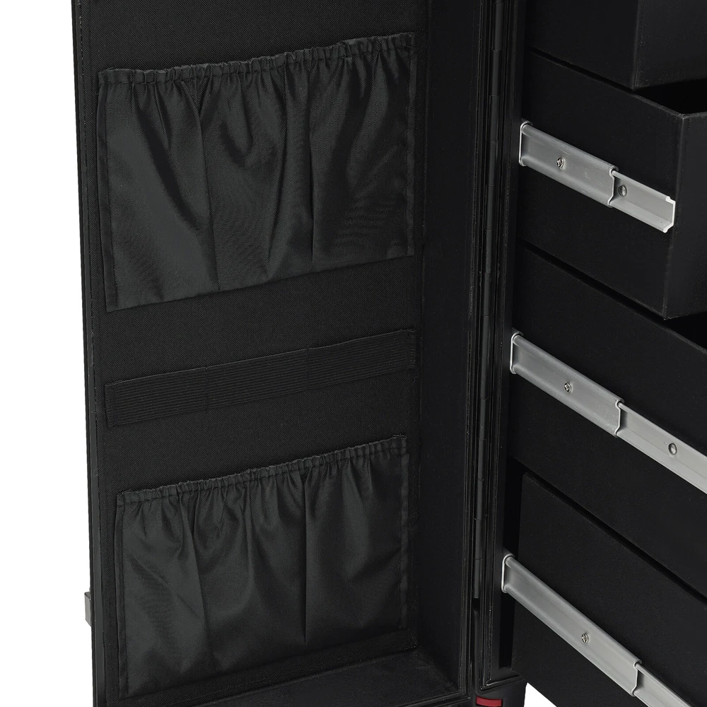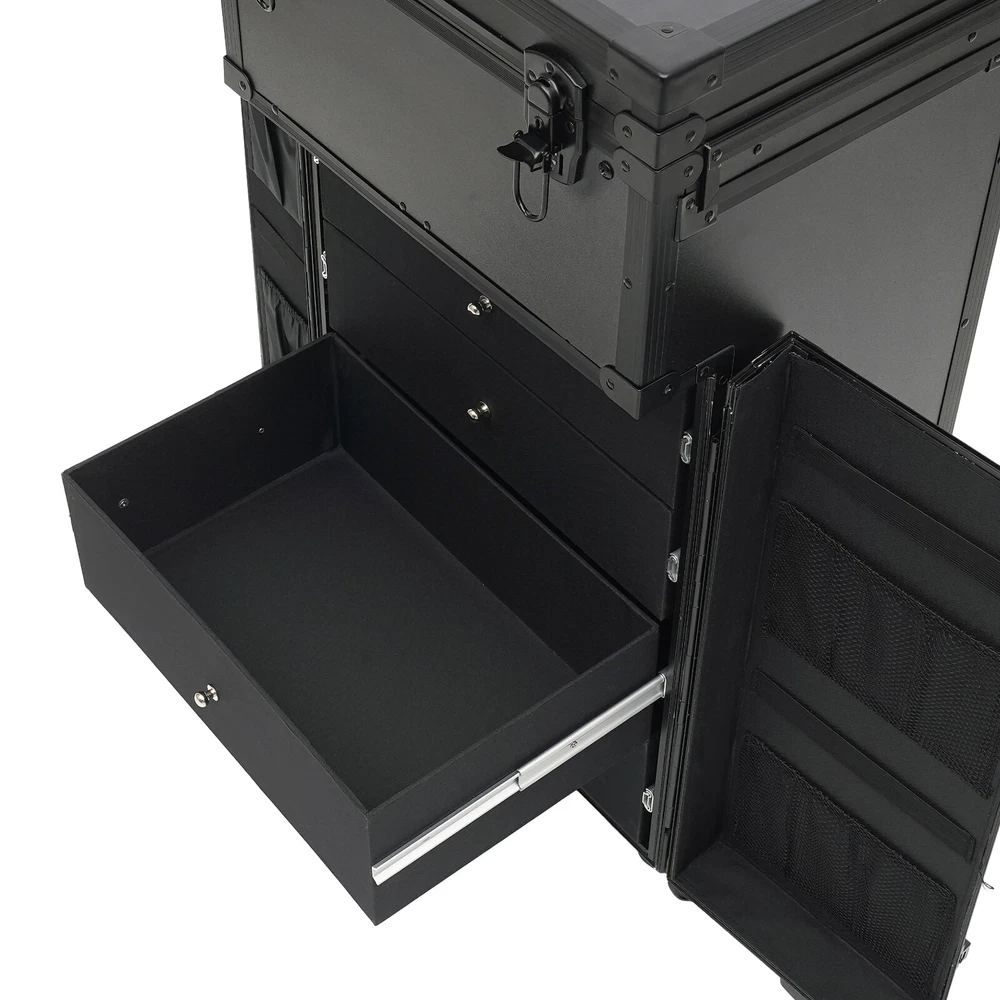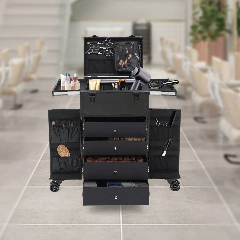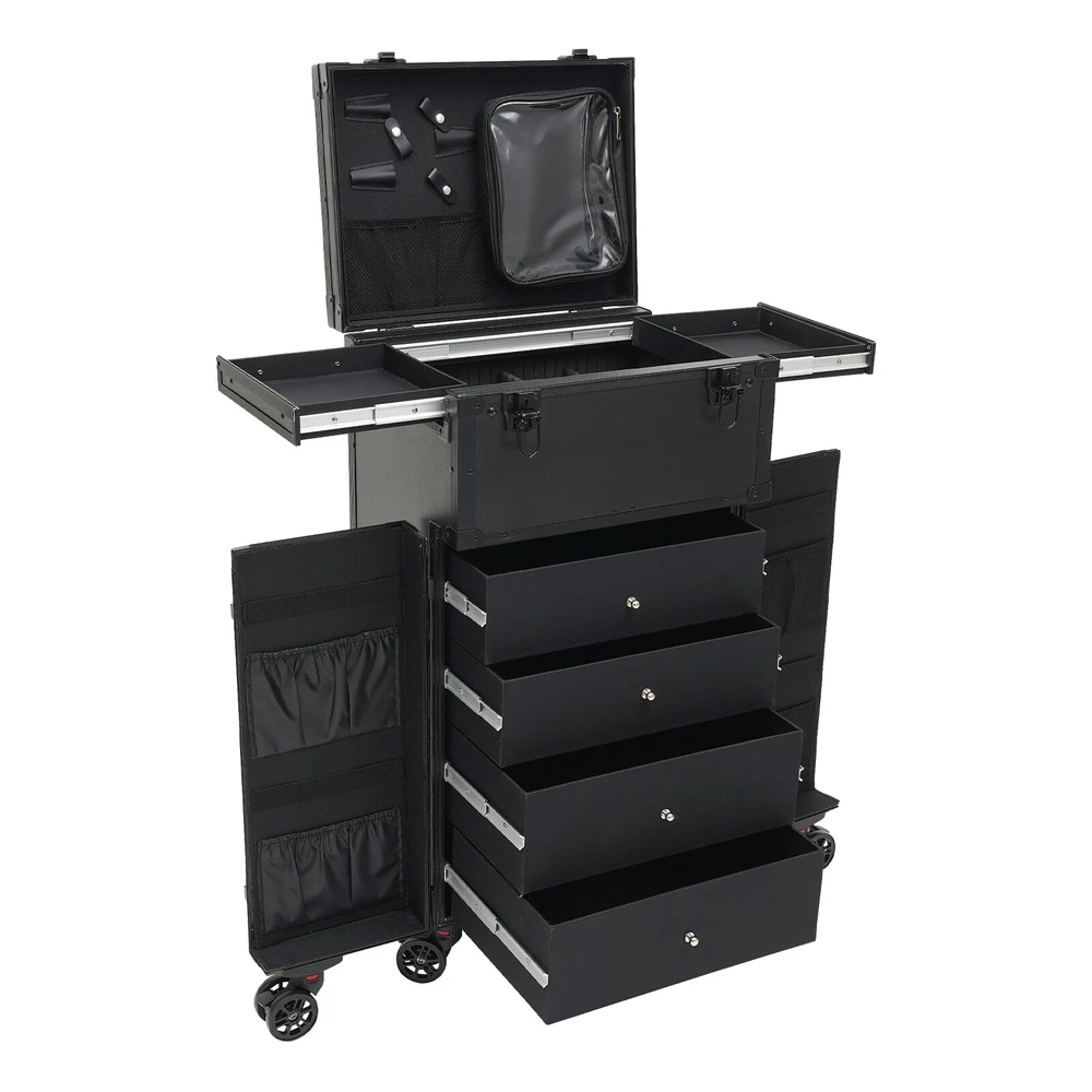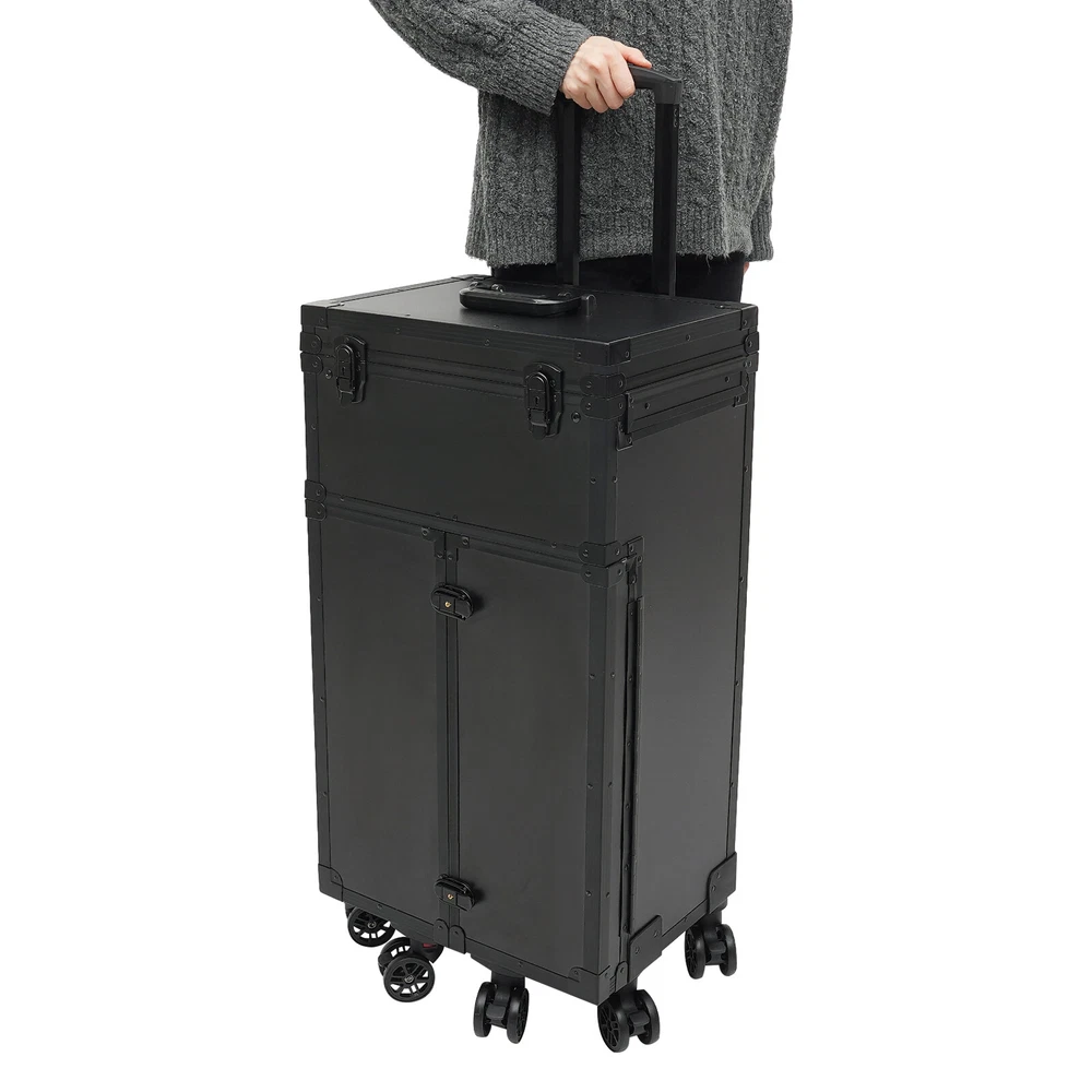 Cosmetic Suitcase Beauty Facial Storage Makeup Travel Box Salon Trolley Cart Rolling Makeup Case, Makeup Organizer Travel Case, Professional Makeup Case+6Wheels&Drawers Description Whether you're working or traveling, a professional makeup case will be a great convenience. This makeup case is made of high-quality aluminum alloy and ABS that is strong and durable. The top scissor groove and a small bag, the middle movable partition, the storage box under the partition, the lower 4 pull-out drawers, and side door pockets allow you to sort and store items. The strong load-bearing capacity allows you to store items with confidence. In short, it is the ideal choice for professional makeup artists and beauticians. Key Features Premium Materials: This product is made of high-quality aluminum alloy and ABS, which is corrosion-resistant, wear-resistant , and durable , ensuring your long-term use. Classified Storage: The top scissor groove and a small bag can be used to store accessories, and the middle movable partition can be used to store styling tools. The storage box under the partition can be used to store nail polish, lipstick, brush, or hair remover(all are not included). The lower 4 pull-out drawers can be used to store sprays, curlers, hair dryers (all are not included), or other supplies. The side door pockets can be used to store eye black, eyeliner pens, and combs(all are not included), making your items neat and orderly. Thoughtful Design: Three adjustable rod lengths allow you to freely adjust the rod length, while also being suitable for people of different heights. In addition, the detachable universal wheels enable you to replace them conveniently when damaged, which is easy and cost-efficient. Strong Load-bearing Capacity: This product can bear a weight of 66.14 lbs , allowing you to use it with confidence without worrying about damage due to excessive items. High Practicality: It can be used as a beauty table, allowing you to do beauty work anytime, anywhere. Protect Your Privacy: The safety buckle can protect valuable items inside your box and maximize your privacy. Generous Appearance: The black color scheme, rectangular shape, and smooth lines give this product a generous appearance, nicely decorating your dressing room. Excellent Gift: Its exquisite design and large capacity make this product a great gift to your mother, girlfriend, sisters, wife, and loved ones so that they can enjoy more convenient makeup time. Protective Packaging: The sponge s can better protect your product during transportation and make it delivered to you completely to the greatest extent. Details Durable Handle: The ergonomically designed handle can relieve finger pressure and provide you with a comfortable user experience. Wide Opening: With a wide opening, it is easy for you to store and retrieve certain items without messing up other items in the box. Clear Storage Bag: It is effective against dust and water and easy to search for the contents. Universal Wheels: The bottom 6 universal wheels allow you to easily move this product. Application It is recommended for make-up artists from beginners to professionals such as freelance make-up artists, wedding make-up artists, celebrity make-up artists, and make-up interns. It can also be used for traveling or kept at home for makeup enthusiasts, hair barbers/stylists, nail technicians, estheticians, embroiderers, and crafters. Specification Color: Black Shape: Rectangular Style: Modern Material: Aluminum Alloy, ABS Assembly Required: Yes Single Side Partition Size: 20*22cm/7.87*8.66in Case Door Size(L * H): 20*49cm/7.87*19.3in Overall Product Size: 40*30*80cm/15.75*11.81*31.5in Load-bearing Capacity: 30kg/66.14lbs Gross Weight: 10kg/22.05lbs Net Weight: 9kg/19.84lbs Package Size: 83*33*45cm/32.68*13*17.72in Package Included 1* Makeup Case 6* Universal Wheels 4* Keys Notes Please note that items other than this product are not included. The service wear of the case is a normal phenomenon. In the process of daily use, please try to avoid excessive impact and drop to extend the lifespan of the product. Please use soft tools and water to clean. Please keep away from corrosive liquids. Please avoid long-term exposure to the sun. Please use this product within its carrying capacity. Please allow the slight color difference caused by the shooting light and the 1-3 cm error due to manual measurement, and make sure you do not mind before ordering. Payment Delivery details Terms of sales About us Contact us Payment We accept ebay payment 。 Fees such as import duties, taxes are not included in the item price or shipping costs. These charges are the buyer's responsibility. Delivery details Shipping: 2-9 working days to: USA Terms of sales We maintain high standards of excellence and strive for hundred percent customer satisfaction. Feedback is very important to us. We hope that you contact us immediately before you give neutral or negative feedback, so that we can address your concerns. It is impossible to address issues if we do not know about them! About us Your satis faction is our ultimate goal. We work hard to earn your trust and future business. Our certified technicians have tested each item before shipping. The unit comes with 1 year limited warranty on all manufacturing defects. a) If you receive a defective item, you may return it or ask for a discount. Please contact us within 14 days after you receive the package. b) What you returned must be intact and in its original packaging as re? u. Customer is responsible for shipping costs of the returned item. c) We will cover the cost of shipping back t with the shipping rate indicated in the registration page. We will send you a new unit or refund the full payment you paid. Thank you. Contact us Business Hour Business Hour: Monday To Friday: 8:30 AM to 5:00 PM (Beijing China time) Due to time zones, our reply to your questions may not be immediately. But within above working time, we will reply your email w