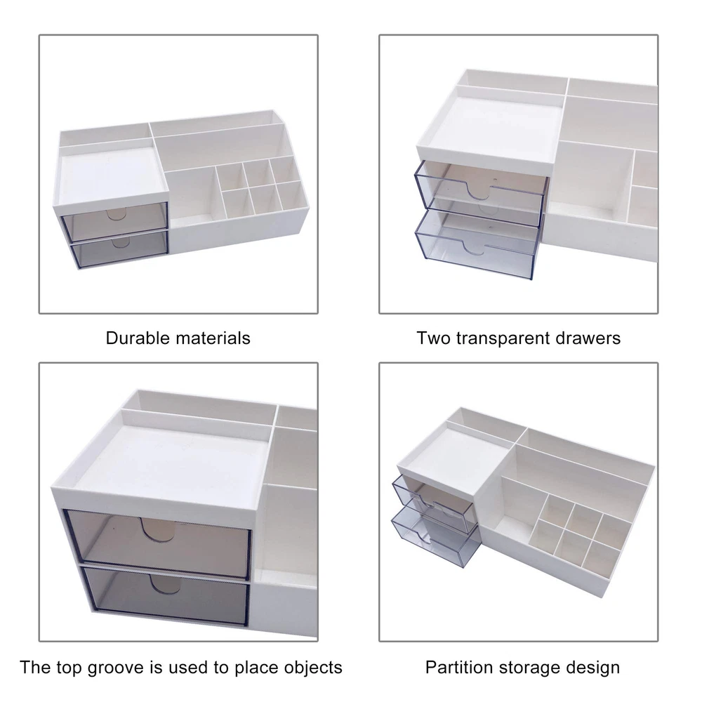 Material: Makeup organizer is made of ABS plastic. Easily Find What You Need: Makeup Organizer with 10 Compartments and 2 Transparent Drawers. Size: 9.6*4.7*3.6 inches. Versatile Design: This Desktop storage is not only perfect for storing your makeup brushes, nail polishes, Liquid Foundation, lipsticks and other small personal items but also great for storing your desktop stationery such as paper clips, pencil, scissors, binder clips and many other office supplies; you can put any other daily necessities on the Desktop storage. Widely Used: Fits Bedroom Countertop Bathroom and office, especially the makeup table.