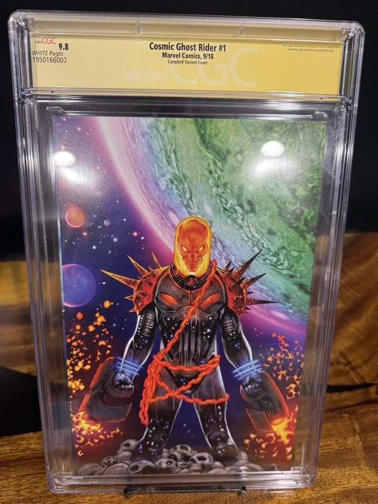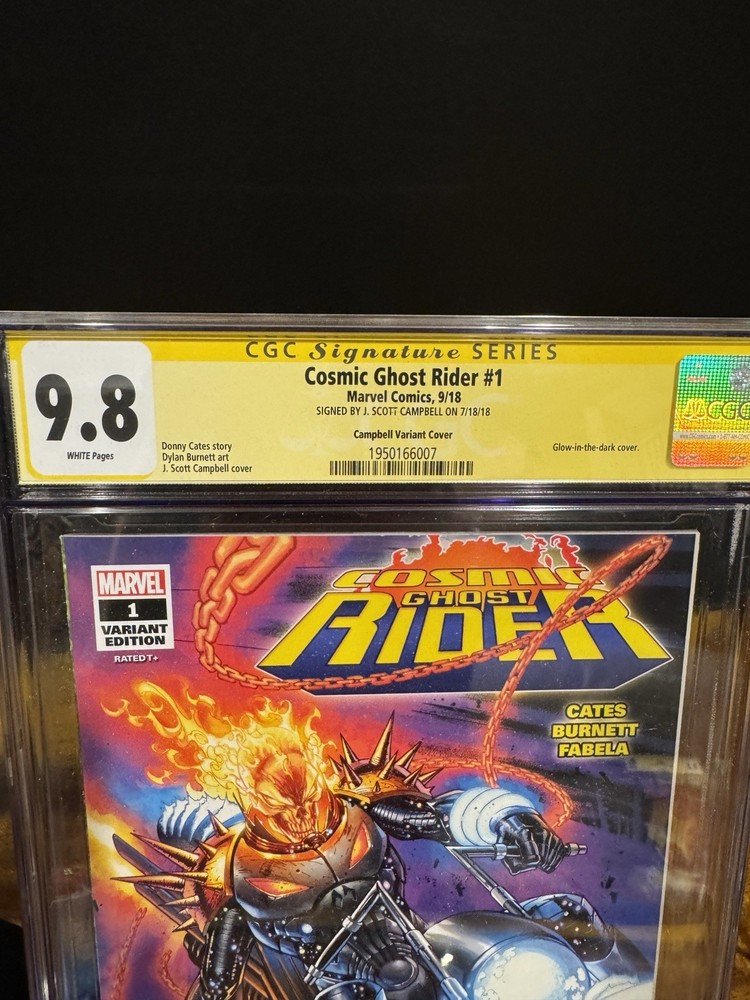 The product is a rare and highly collectible comic book, Cosmic Ghost Rider #1 from September 2018, featuring the character Ghost Rider (Johnny Blaze) by Donny Cates and J. Scott Campbell. This single issue variant is signed by J Scott Campbell and has a CGC 9.8 grade, making it a highly sought-after item for comic book enthusiasts. Produced by Marvel Comics, this comic is a first printing and is part of the Marvel Universe (MCU), appealing to a general audience with an action-packed storyline. This limited edition comic from San Diego Comic Con (SDCC) is a valuable addition to any comic book collection. Ships USPS W/insurance , All Sales Final, No Returns