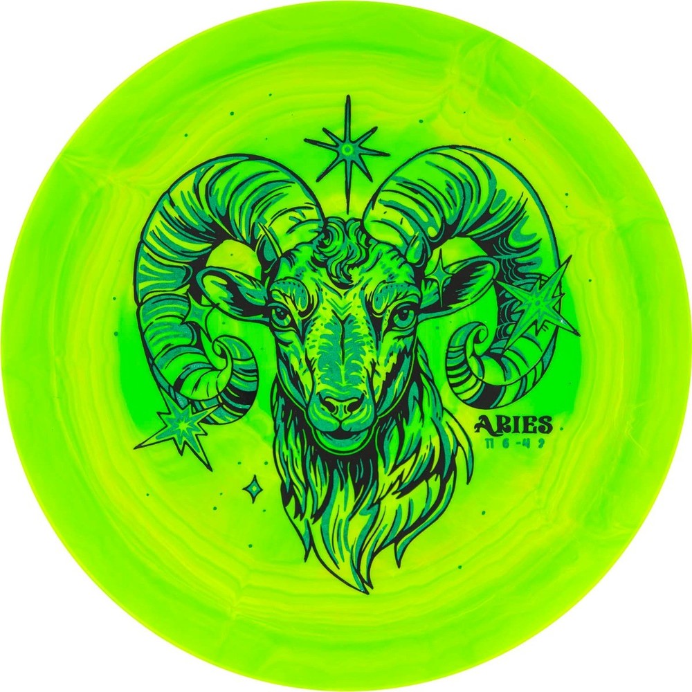The Millennium Cosmic Ram Swirly Sirius Aries can unlock big distance for low to average powered players. That, plus its bold, two-color stamp, will make this understable distance gainer a real favorite. How These Sirius Aries Feel Minimal to noticeable dome. Plenty of grip here . Get To Know The Aries The Aries is described as stabilized Mamba. That’s good news for players who love the Mamba’s incredibly easy turn, but would like a touch more stability for even longer drives. Throwing this disc will result in long, smooth turns with a moderate check at flight’s end. The Specs Artist: Tony Diaz (2 Color Foil) Flight Numbers : 11 | 6 | -4 | 2 Disc Type : Distance Driver Stability : Understable Plastic Type : Swirly Sirius (Star) Best Shot Types : Turnovers, Uphill drives, Tailwinds, Super big S Lines Artwork Spotlight This XXL two-foil stamp by Tony Diaz features a bold Aries ram theme, drawing from the familiar Aries astrology symbol. The large-format design fills the flight plate, making the swirling Sirius plastic background pop, thus giving each disc a unique, eye-catching look. Why It Belongs In Your Bag If you want a distance driver that will turn but not burn, the Aries with its striking XXL ram artwork, is worth a shot.
