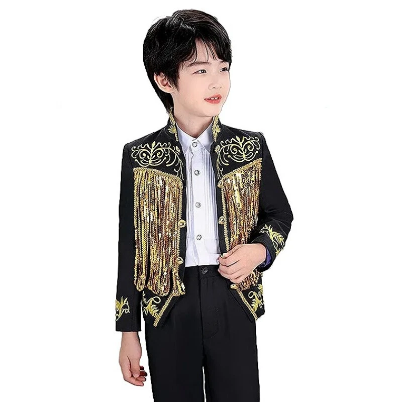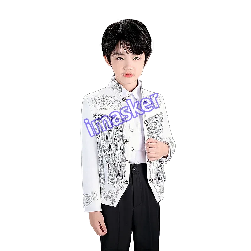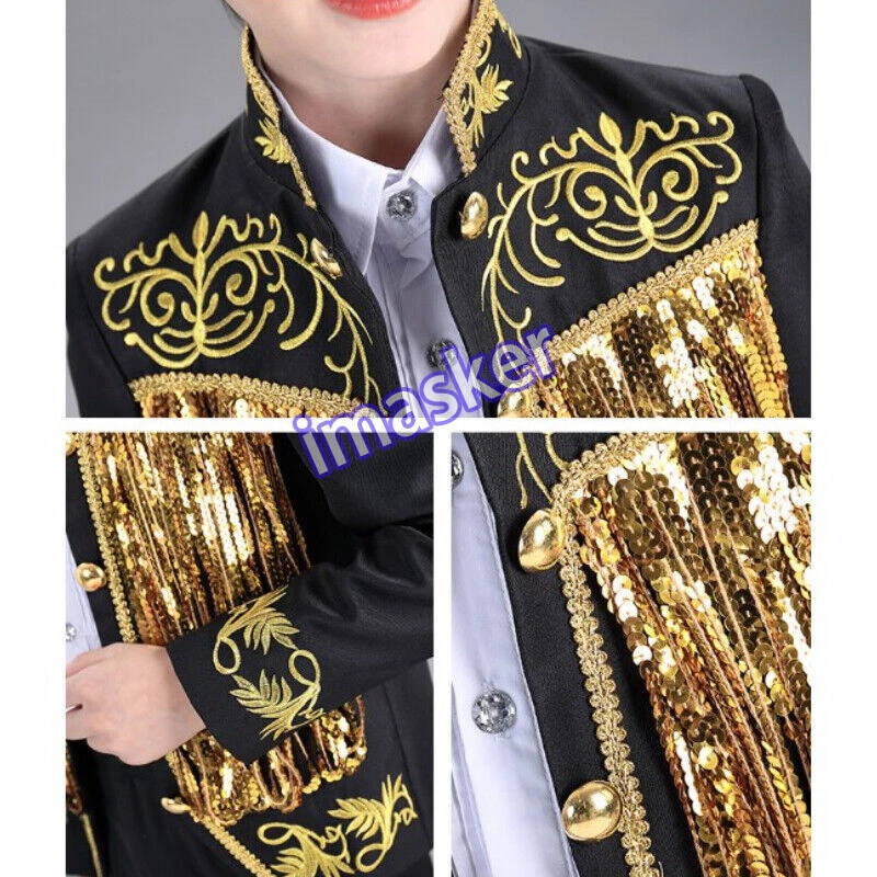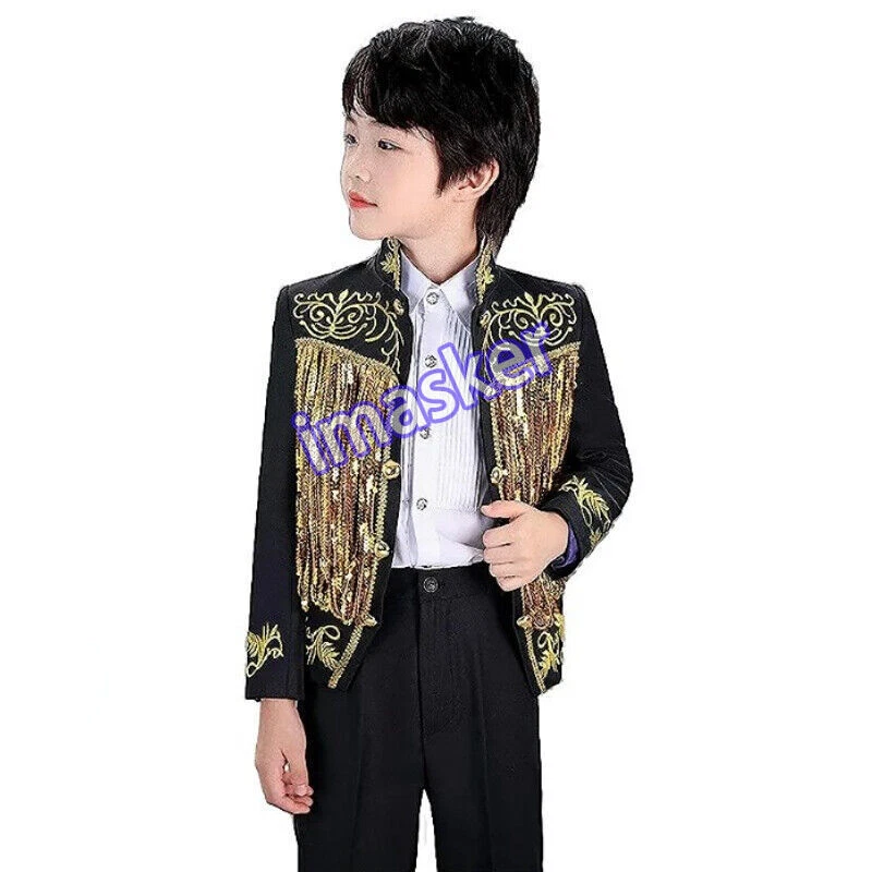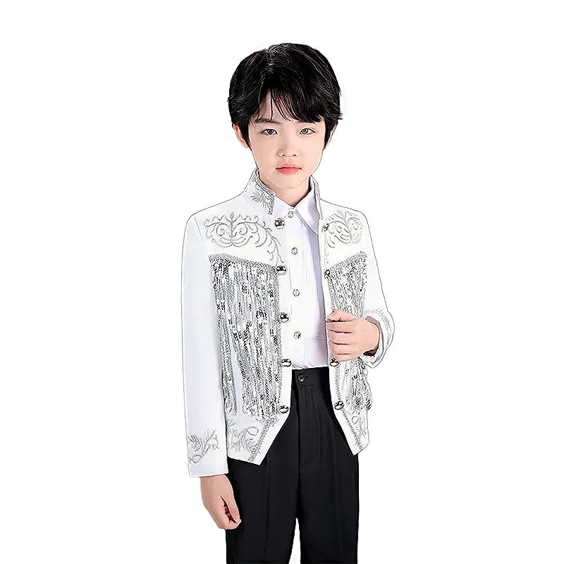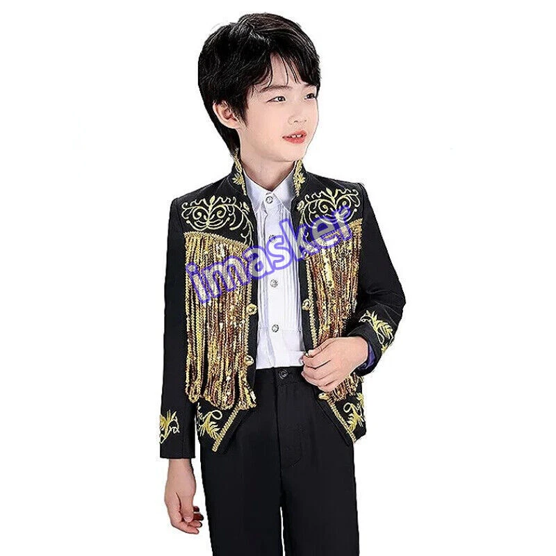 Cosplay Prince Boys Shiny Sequins Fringed Embroidered Tuxedo Suit Jacket Coat