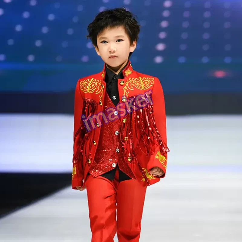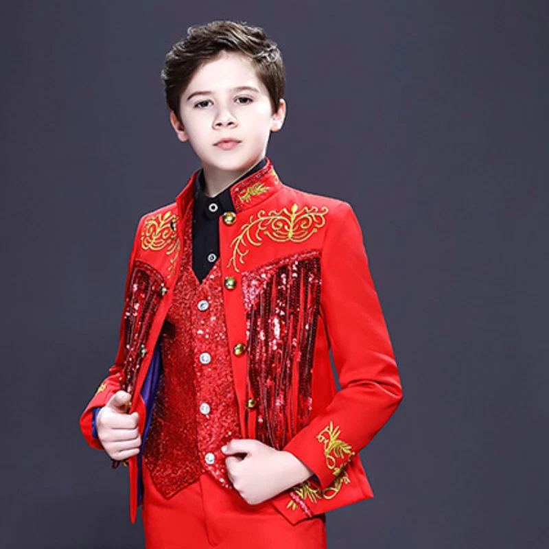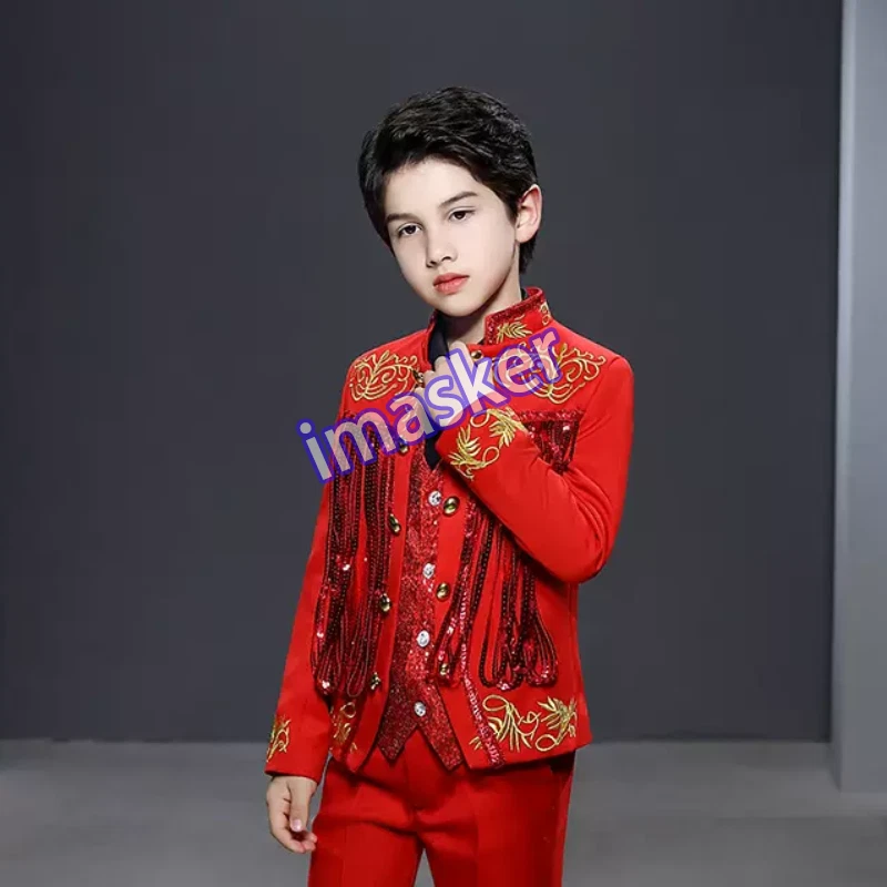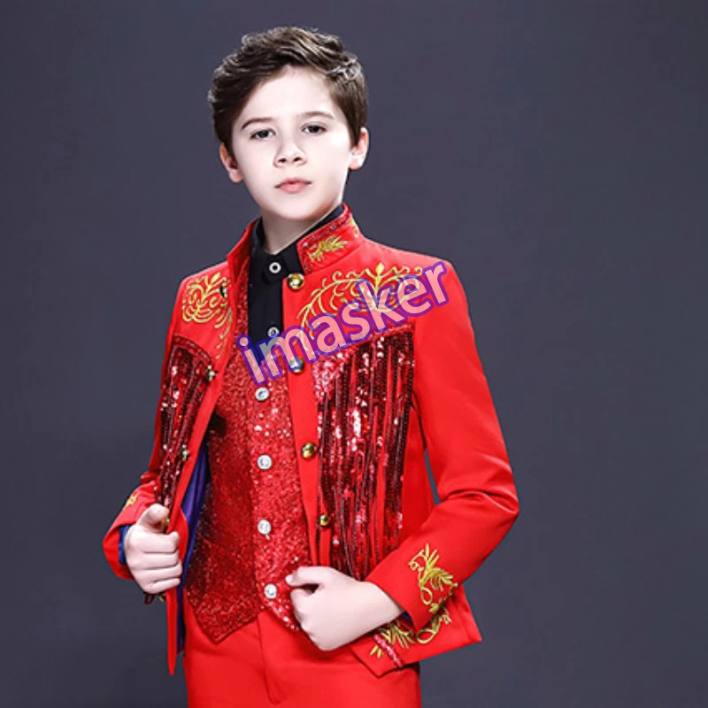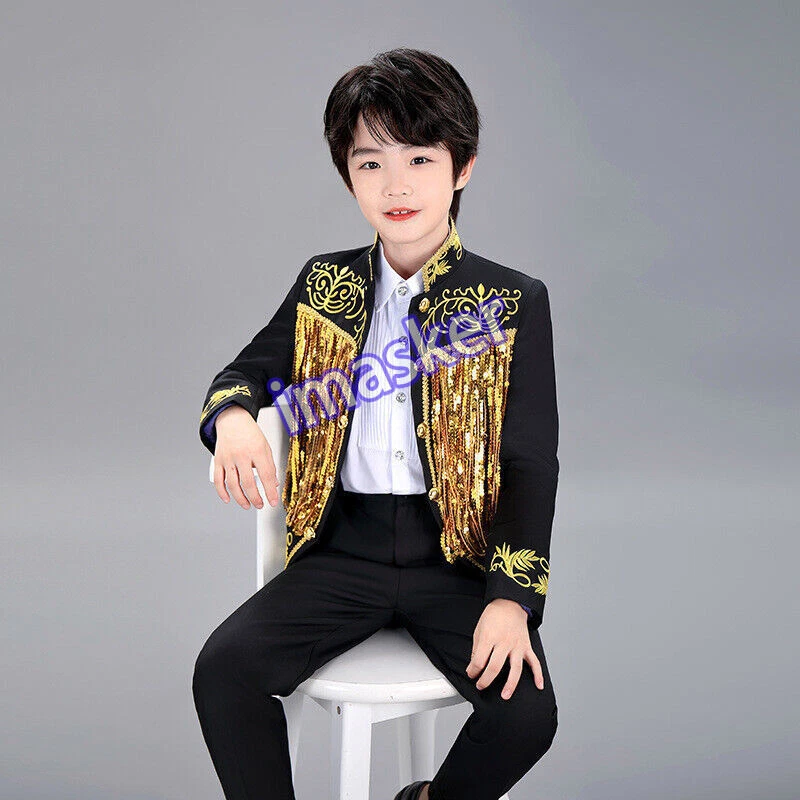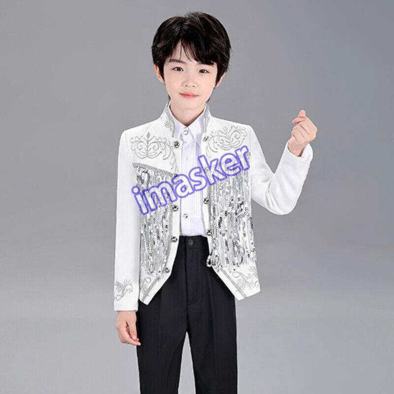 Cosplay Prince Boys Shiny Sequins Fringed Embroidered Tuxedo Suit Jacket Coat