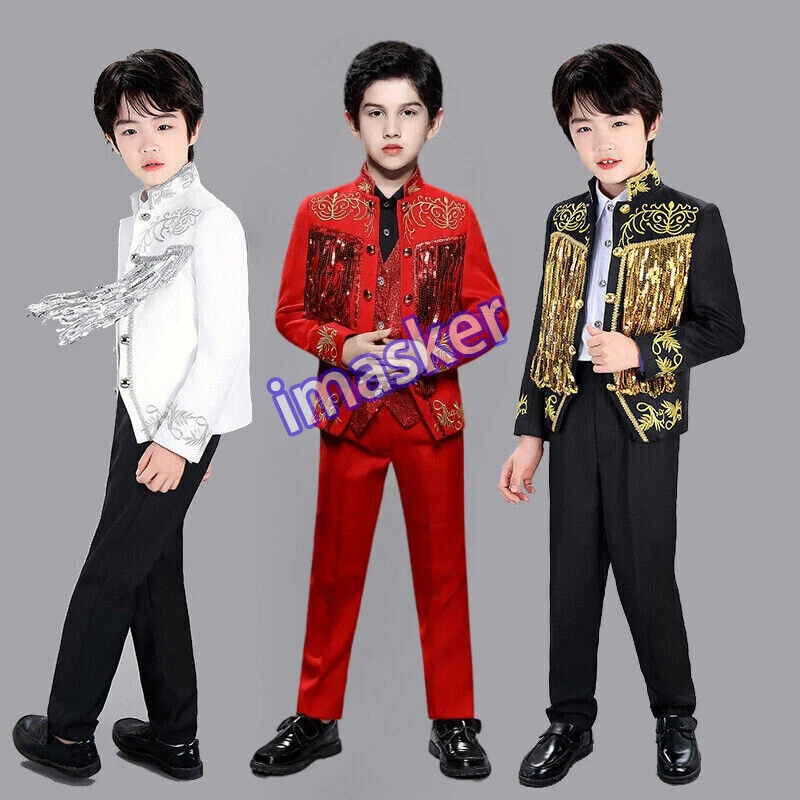 Cosplay Prince Boys Shiny Sequins Fringed Embroidered Tuxedo Suit Size: 4-12 Years 4 T (Label size 120): suggest weight 41-52 lbs/19-24 kg, suggest height 43.3-47.2 in/110-120 cm, length 18.9 in/48 cm, shoulder 11.8 in/30 cm, bust 28.3 in/72 cm, waist 26.8 in/68 cm, sleeve 17.3 in/44 cm 5 Y (Label size 130): suggest weight 52-60 lbs/24-27.5 kg, suggest height 47.2-51.2 in/120-130 cm, length 20.1 in/51 cm, shoulder 12.4 in/31.5 cm, bust 30.0 in/76cm, waist 28.3 in/72 cm, sleeve 18.1 in/46 cm 6-7 Y (Label size 140): suggest weight 60-71 lbs/27.5-32.5 kg, suggest height 51.2-55.1 in/130-140 cm, length 21.3 in/54 cm, shoulder 13.0 in/33 cm, bust 31.5 in/80 cm, waist 30.0 in/76 cm, sleeve 18.9 in/48 cm 7-8 Y (Label size 150): suggest weight 71-82 lbs/32.5-37.5 kg, suggest height 55.1-59.1 in/140-150 cm, length 22.4 in/57 cm, shoulder 13.8 in/35 cm, bust 33.1 in/84 cm, waist 31.5 in/80 cm, sleeve 19.7 in/50 cm 9-10 Y (Label size 160): suggest weight 82-93 lbs/37.5-42.5 kg,suggest height 59.1-63.0 in/150-160 cm, length 23.6 in/60 cm, shoulder 14.6 in/37 cm, bust 34.6 in/88 cm, waist 33.1 in/84 cm, sleeve 20.9 in/53 cm 11-12 Y (Label size 170): suggest weight 93-104 lbs/42.5-47.5 kg, suggest height 63.0-67.0 in/160-170 cm, length 24.8 in/63 cm, shoulder 15.0 in/38 cm, bust 36.2 in/92 cm, waist 34.6 in/88 cm, sleeve 21.7 in/55 cm Material: polyester Main Color: white, black, red Payment 1. We accept PAYPAL only. 2. Payment must be made within 7 days of auction closing (Unpaid dispute will automatically open when item is not paid in 7 days). 3. PLEASE NOTE: SHIPPING&HANDING DOES NOT INCLUDE DUTIES, LOCATL TAXES OR ANY OTHER IMPORTATION FEES. 4. Please list your special requests (color, packages, value of declaration, etc.) in the EBAY NOTES SECTION when you make payment Shipping 1. We Ship to Worldwide 2. We ship your orders within 1-2 business days after the payment cleared. 3. Item shipped from China via china Post Airmail, reach most of the countries within 2 to 4 weeks. 4. Delivery time depends on destination and other factors, it may takes up to 20 days. If you don't receive the item after 25 days,please contact us, we'll investigate and solve the delivery problem. 5. Import duties, taxes, and charges are not included in the item price or shipping cost. These charges are the buyer's responsibility. Please check with your country's customs office to determine what these additional costs will be prior to bidding or buying. Warranty Return 1. Customer satisfaction is our top goal. All products are quality checked. They are new and in good condition when shipped to our customers. If product is defective or damage upon arrival, or wrong product shipped, please contact us immediately. Returns accepted within 14 days of delivery date and item must be in original new condition, not worn or altered in any way with attached tags & wrap. Otherwise deal is final. Return shipping must be paid by buyer. 2. Please contact us first if you have anyproblems/questions/concerns. We will be happy to resolve any issues you may have in a cordial and friendly manner. 3. We appreciate your Positive Feedback, and will do the same in return. PLEASE DO NOT leave negative feedback without first communication with us. Please allow max 24 HOURS for us to respond About Feedback We maintain high standards of excellence and strive for 100% customer satisfaction! Feedback is very important to us. We request that you contact us immediately BEFORE you give us neutral or negative feedback, so that we can satisfactorily address your concerns.It is impossible to address issues if we do not know about them! Contact Us We care about our valued customers, if you have any questions, please feel free to contact us in EBAY MESSAGE, our Customer Service staffs will be very pleasure to reply you in 24 Hours.