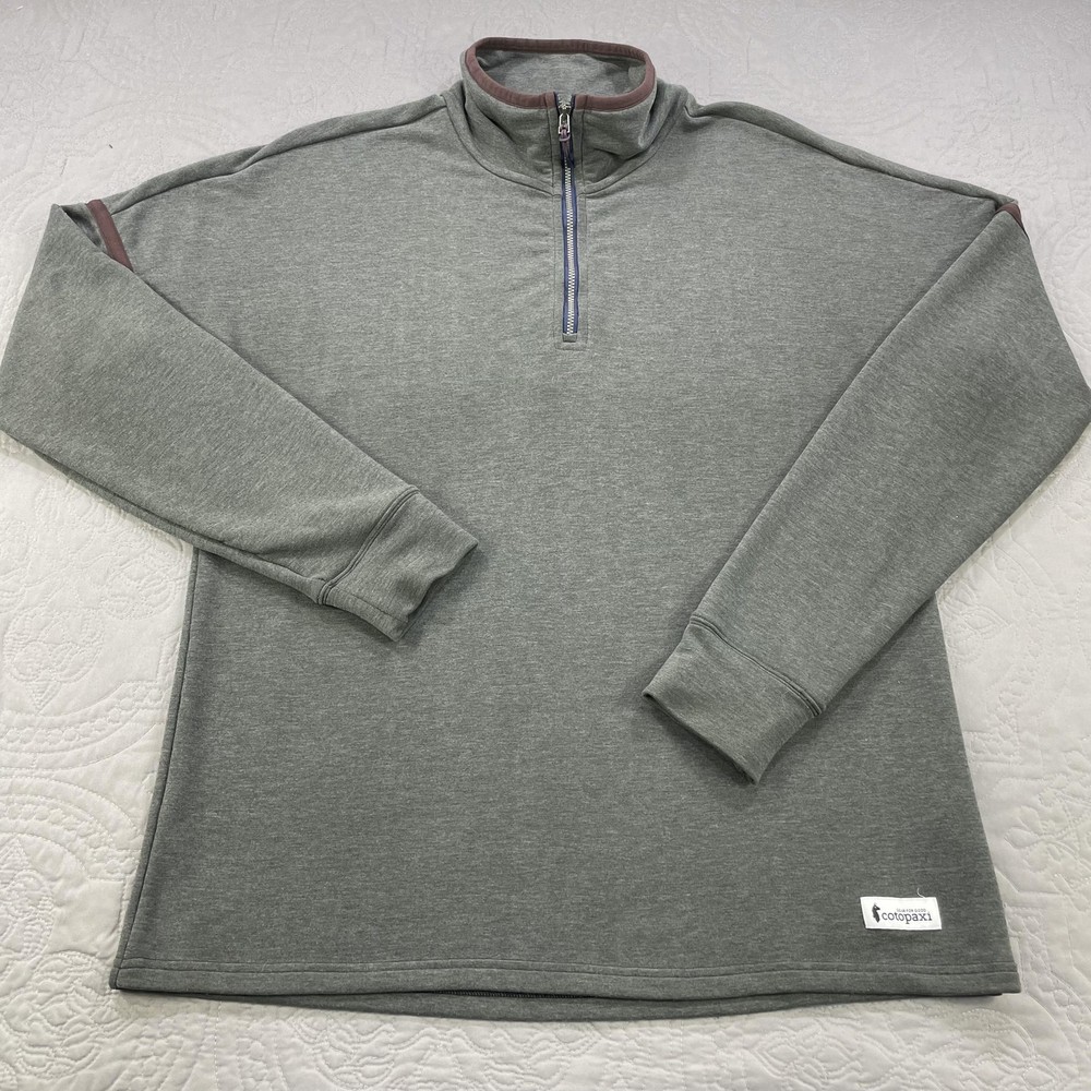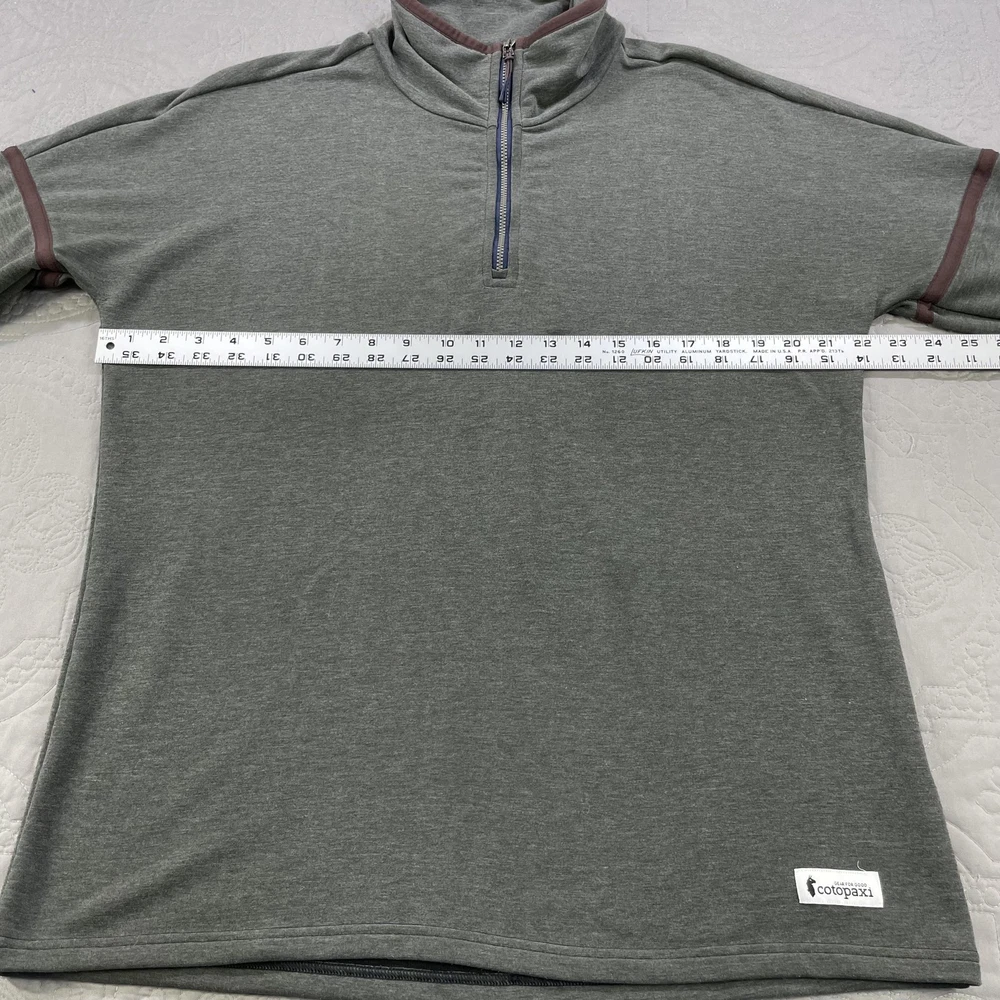 Brand: Cotopaxi Item: Quarter-zip pullover sweatshirt with mock neck Tag size: Mens XL Color: Heather gray with maroon trim at the collar and contrast zipper detail Fabric: Polyester and TENCEL Lyocell blend; see care tag photo for full fiber content Made in Cambodia Features: Soft brushed interior for comfort and warmth Features: 1/4 zip front; mock neck; long sleeves; banded cuffs; straight hem Features: Cotopaxi "Gear For Good" logo patch at the hem Notes: See photos for label details and overall fit