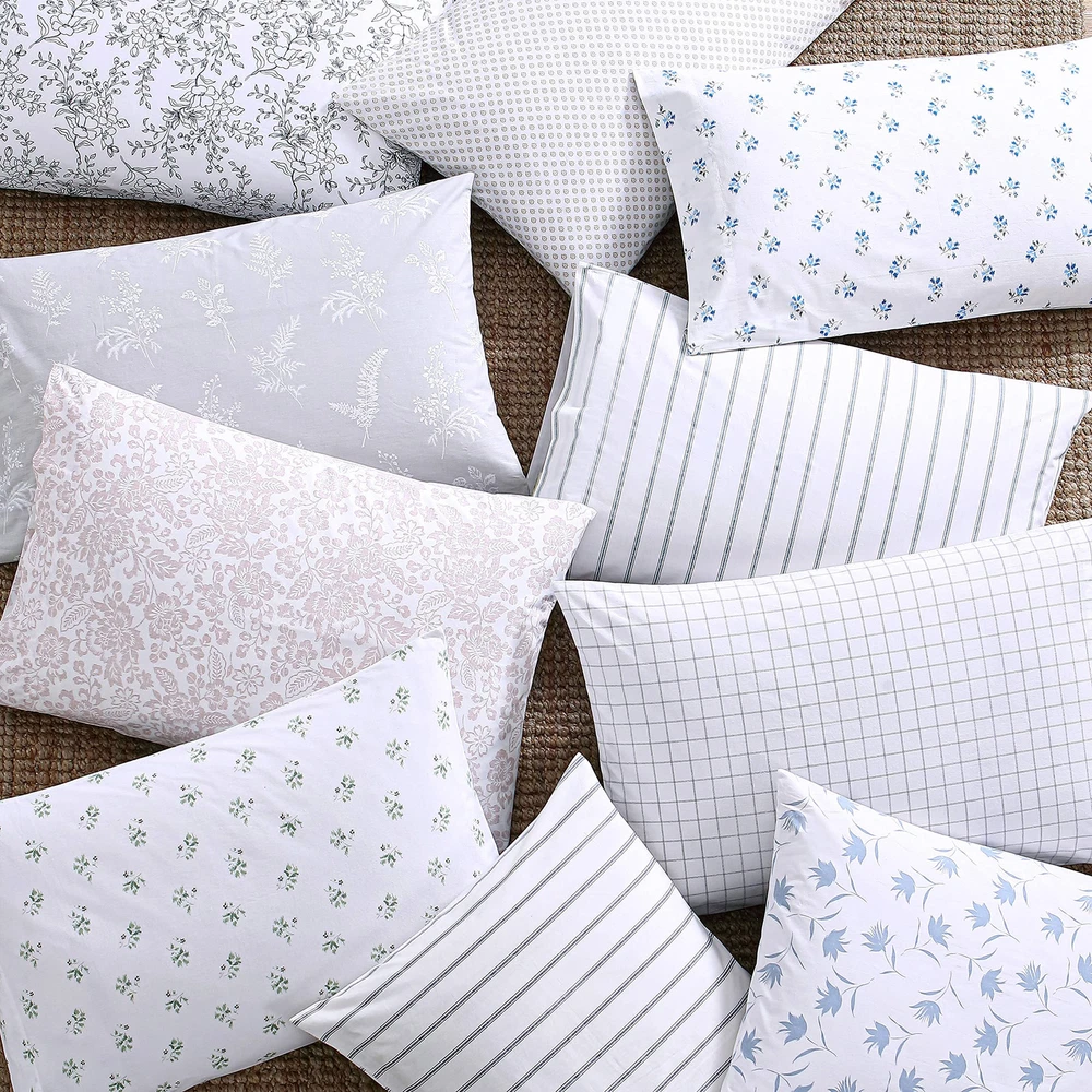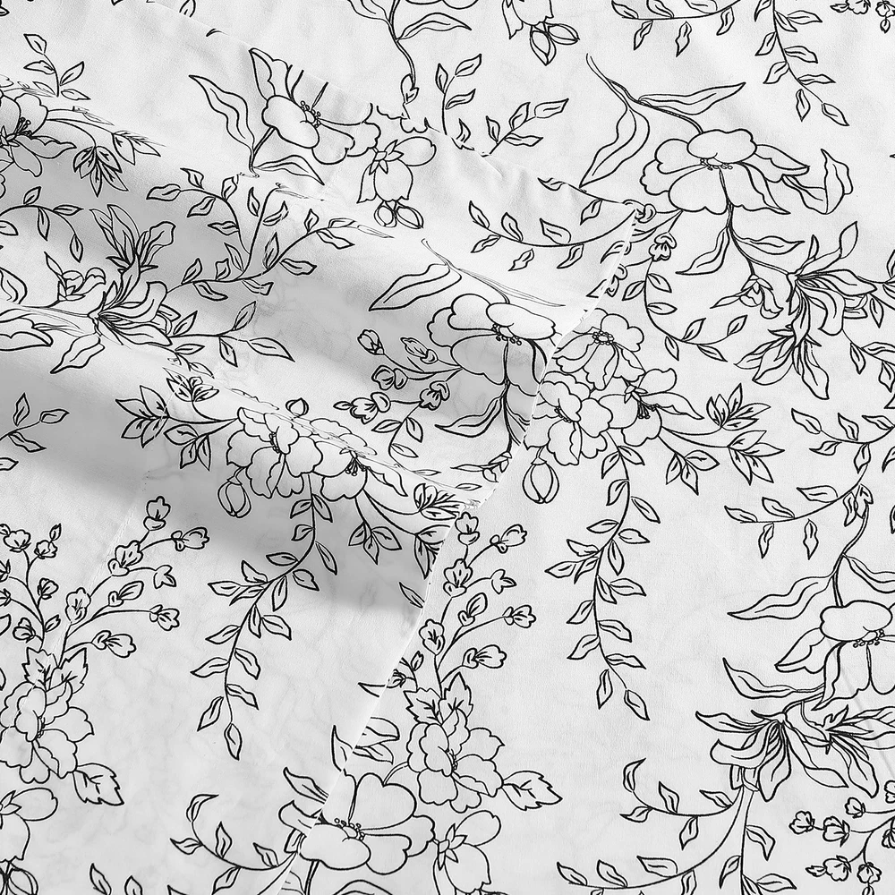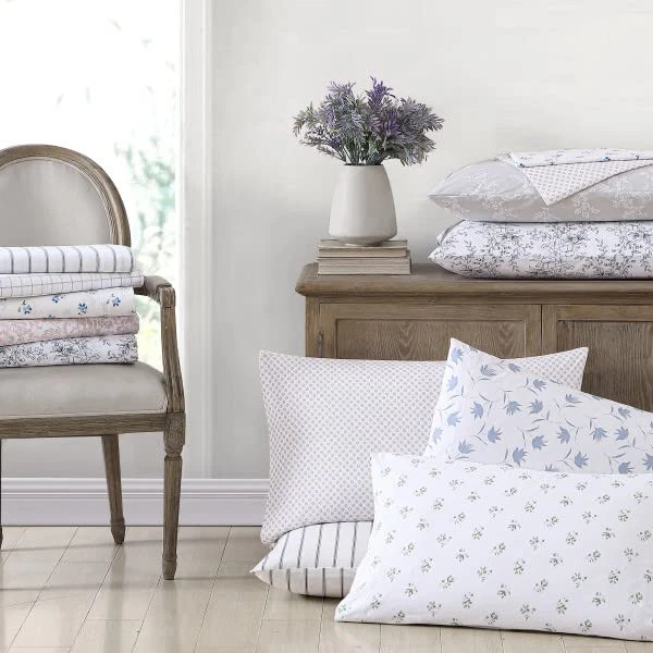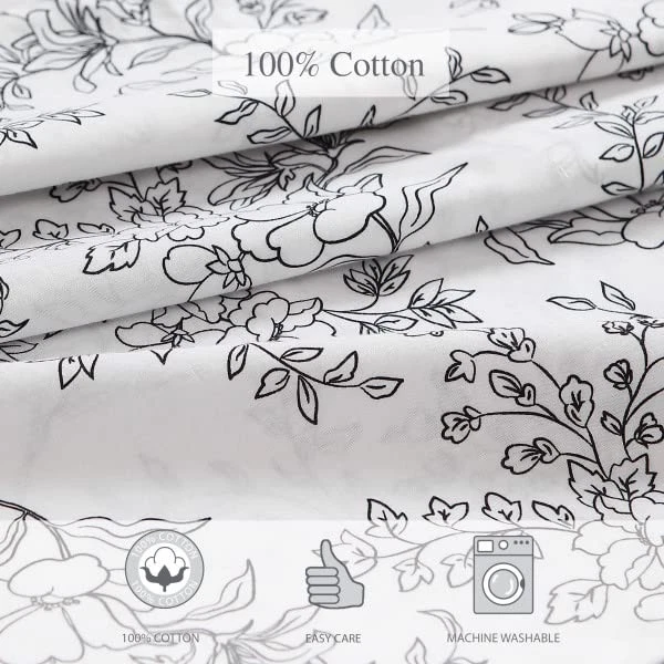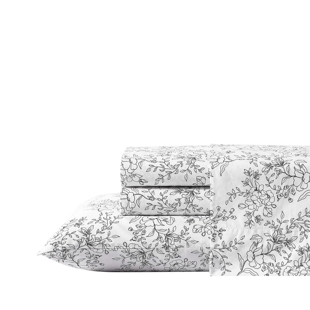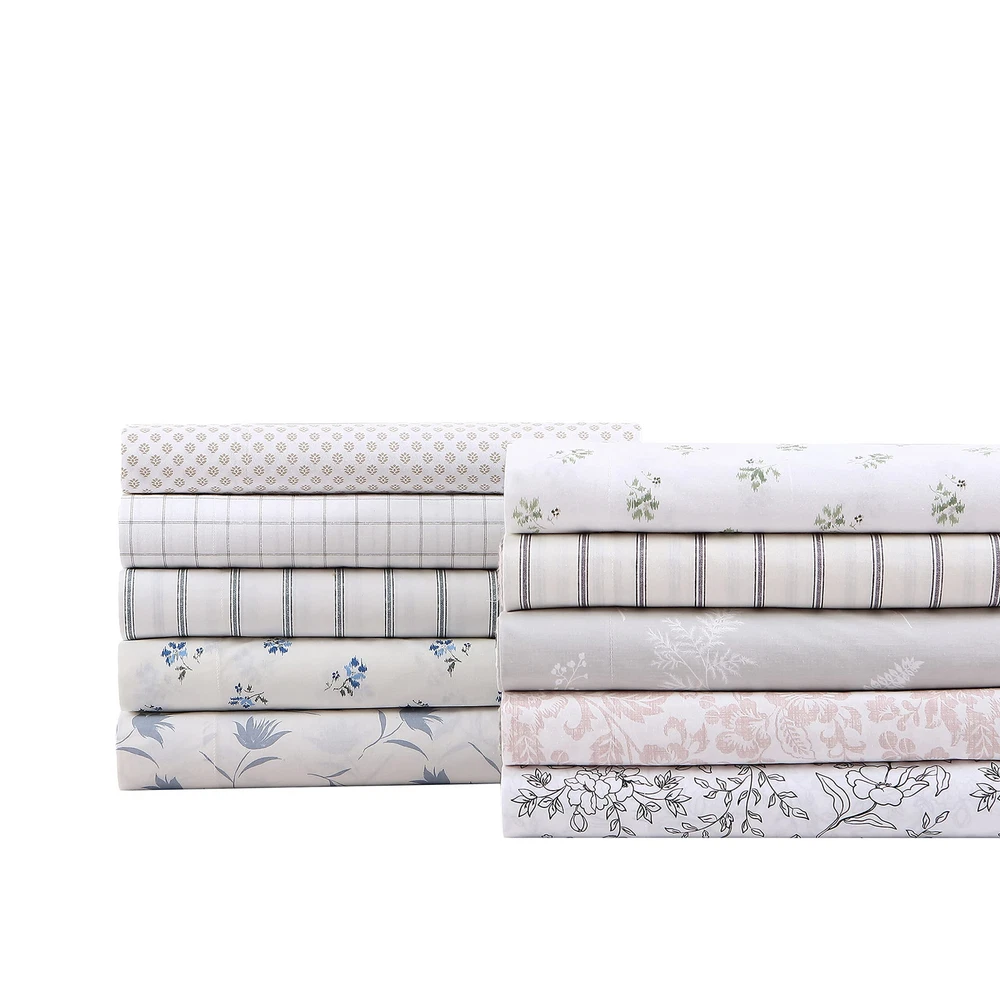 Add gorgeous rustic charm to your bedroom décor with a new printed percale cotton sheet set from . Available in a variety of relaxed farmhouse and vintage cottage patterns, these sheet sets will coordinate beautifully with any bedding ensemble and provide a restful night's sleep. Constructed with high quality percale cotton, these crisp and breathable 200 thread count sheets are a must have for any bed. The included fitted sheet features a deep pocket and fits mattresses up to 16" deep for twin size, 17" deep for full size and up to 18" deep for queen and king sizes. Set includes one flat sheet, one fitted and two pillowcases (one for the twin size). Sheets and pillowcases are machine washable for easy and convenient care. MATERIAL: 100% Percale Cotton- constructed with optimal breathability SET INCLUDES: One flat sheet, one fitted sheet and two standard pillowcases FEATURES: Includes a fully elasticized fitted sheet- Premium elastic installed all-around to prevent the fitted sheet from slipping and ensure that it stays in place during use; Deep pocket- Fits mattress up to 18" deep (up to 15 for twin size) DIMENSIONS: Flat Sheet- 102"L x 90"W, Fitted Sheet- 80"L x 60"W, Standard Pillowcases- 20"L x 30"W CARE: Machine wash cold, tumble dry low