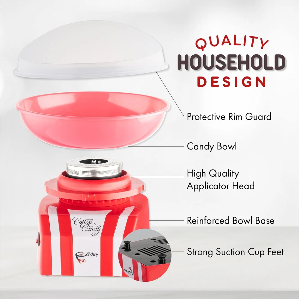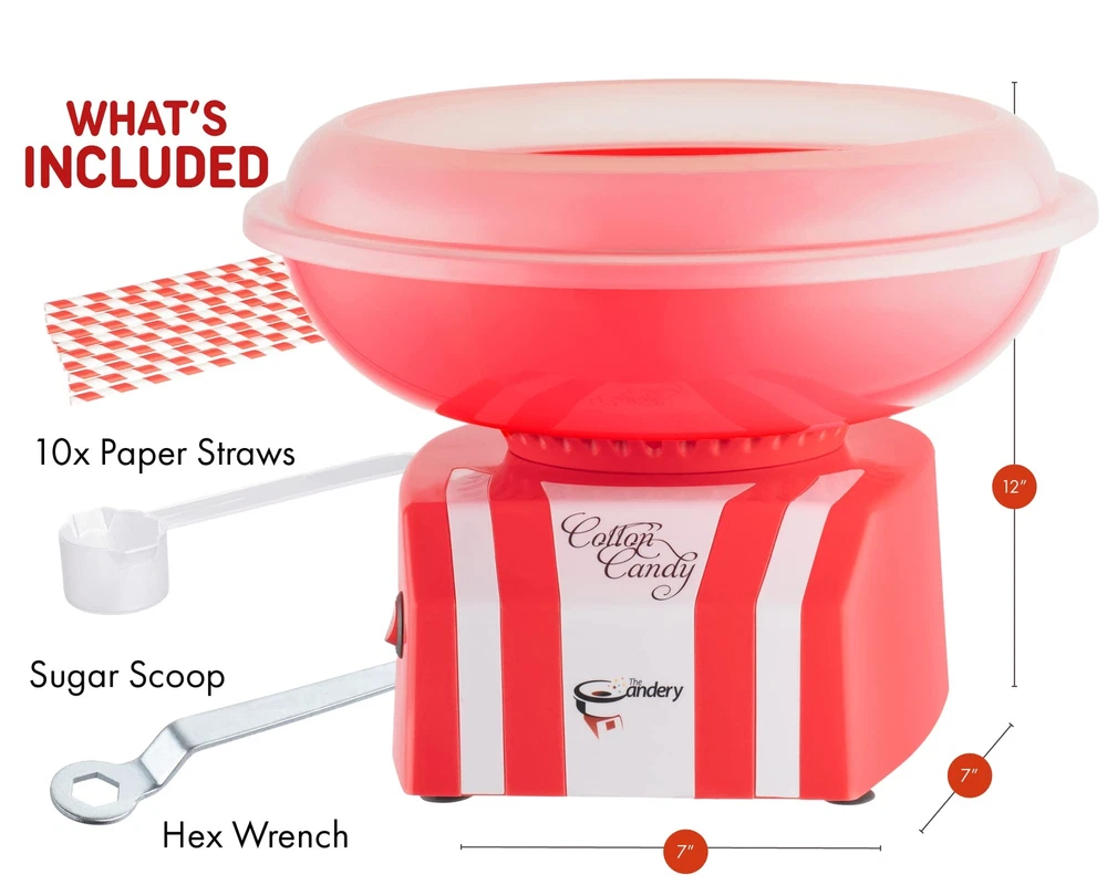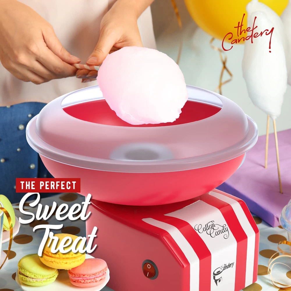 FAMILY FUN: Whether you're throwing a fun birthday party for your kids or enjoying a relaxed family weekend. Try using this pink cotton candy machine for fundraising events, baby showers, summertime celebrations, and more INCLUDES 10 CONES & SCOOP – The cotton candy machine kit comes with everything you need for homemade sweet treats, including 10 paper candy cones and a sugar scoop. Safely use and enjoy with your favorite cotton candy sugar, hard candy, or rock candy. COTTON CANDY MAKER: This Vintage-themed cotton candy maker is compatible with all Candery Cotton candy kits including our cotton candy flossing sugar and various bundles. The compact design allows it to fit on any countertop! HIGH QUALITY CONSTRUCTION - Designed with a unique reinforced bowl base that is easy to secure by sliding the bowl into the base. Strong suction pads keep the candy cotton machine stable during use, with a protective plastic shield to contain the sugar floss. PERFECTLY PUFFY IN 30 SECONDS.... or less! A best-in-class candy machine motor gathers the wisps of sugar fluff to quickly produce perfect, puffy clouds of cottony-soft candy. Great for parties and events with a growing line of excited children to serve!