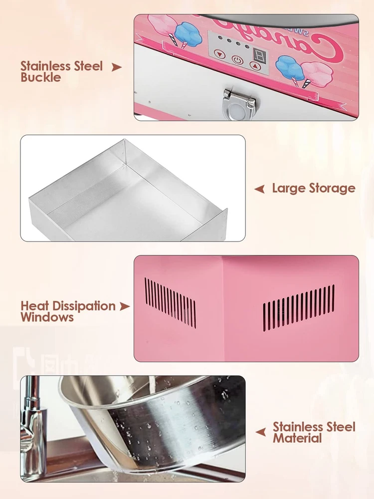 Cotton Candy Machine Commercial 【High Efficiency】Our commercial cotton candy machine features a digital display screen.1200W, 120V, Aluminum sugar outlet for heating evenly. Producing up to 2-3 servings per minute. 【Super Space】Large 20.5" food grade stainless steel bowl and Sugar Scoop. Unit disassembles for simple cleaning. 【Temperature Adjustable】Adjust the Temperature Control Button as needed, wait for it to warm up (about 5 mins), pour in the sugar and within minutes delicious cotton candies are done.Suitable for different kinds of candies. 【Clever Design】The locking clips help hold down the bowl to minimize the vibration, making the operation quiet and smooth. 【Wide Application】Suitable for professional sellers and novices. And it is perfect for the family party ,carnivals, sporting events and street stalls.