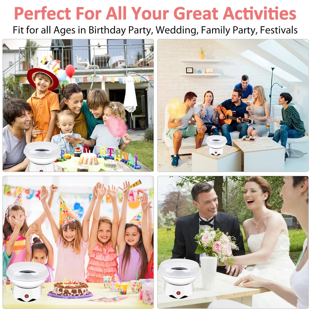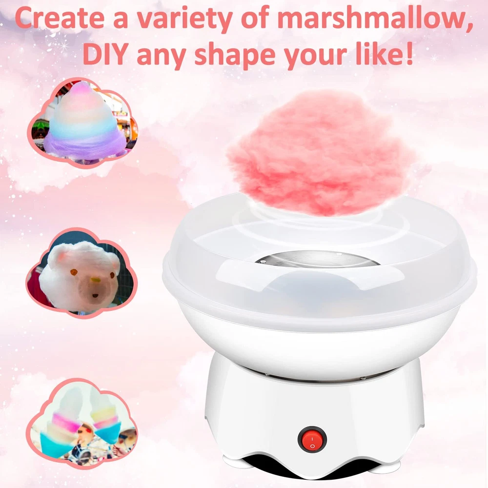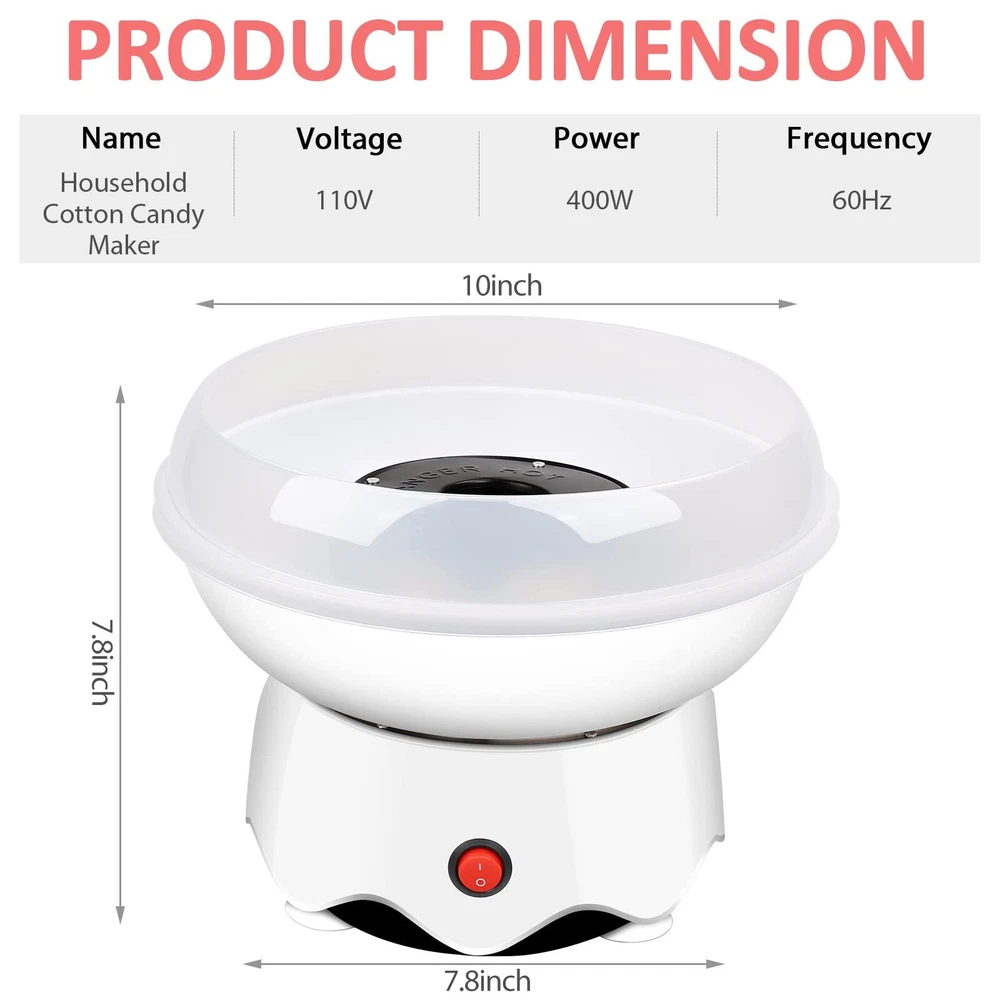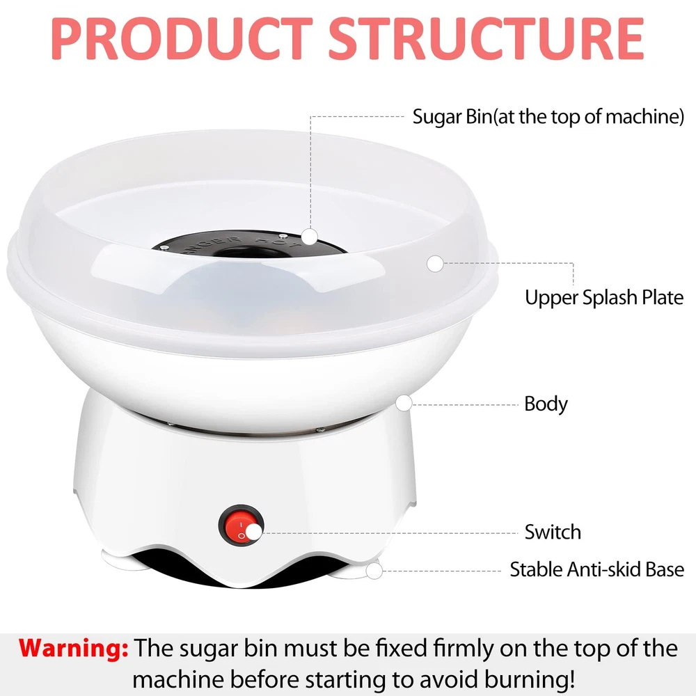Portable Cotton Sugar Machine DIY Sweet Cotton Candy Maker! Girl Boy Gift Children Day Toy Gift With Sticks Spoon. EASY OPERATION STEPS Step1 Turn on the switch (Preheat 2-3 minutes). Step2 Turn off the machine and add suitable sugar into the boiler. Step3 Turn on the machine and wait it comes out sugar floss (then roll it up with stick). Steps4 Enjoy the moment to roil a cotton candy. SPECIFICATIONS Size: 7.8”x7.8”x10” Material: PP+Aluminum+Stainless Steel Power - 400W Voltage - 110V Frequency - 60Hz ATTENTION 1. Due to the difference between different monitors, the picture may not reflect the actual color of the item. We the style is the same as shown in the pictures. 2. Please allow slight dimension difference due to different manual measurement. ATTENTION Please read carefully the Precautions and Warning in the Instruction Manual to Avoid Causing Fire! 1.Don't put sugar directly into the stainless steel net, you must put the sugar bin first and then the sugar to avoid fire. 2.Do not place the machine in or near gas stoves, stoves, hot stoves, etc. 3.The sugar bin and splash plate must be installed correctly before use to insert the plug into the socket. 4.Pour half a spoon of clean granular sugar in the center of the sugar bin, and the sugar must be poured into the sugar bin when the sugar bin completely stops rotating. Do not use or mix other materials.Do not use too much sugar to avoid fire. The cotton candy machine is composed of safe harmless food materials, durable & long lasting. With anti-skid design on its bottom, more stable & less noise once working. The cotton candy maker inside part adopts ceramic head heating tube,has good thermal conductivity, works more efficiently. Use it under 110V, 400W. Keep away from the machine, or use it under your protection. Easy to use the machine, but must the instruction manuals to avoid any fire catching. You can create delicious fluffs of cotton candy by proper sugar. Super convenient to clean the machine by damp cloth or warm soapy water. A great home accessory for your families. The homemade cotton candy maker is a great choice for birthday party, any festivals! Great tools to enhance -parents relationship, bring much more happiness.