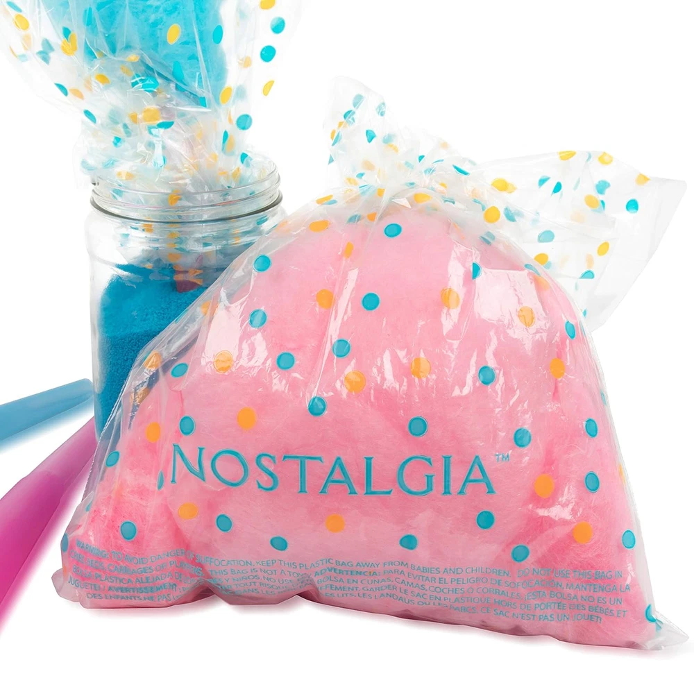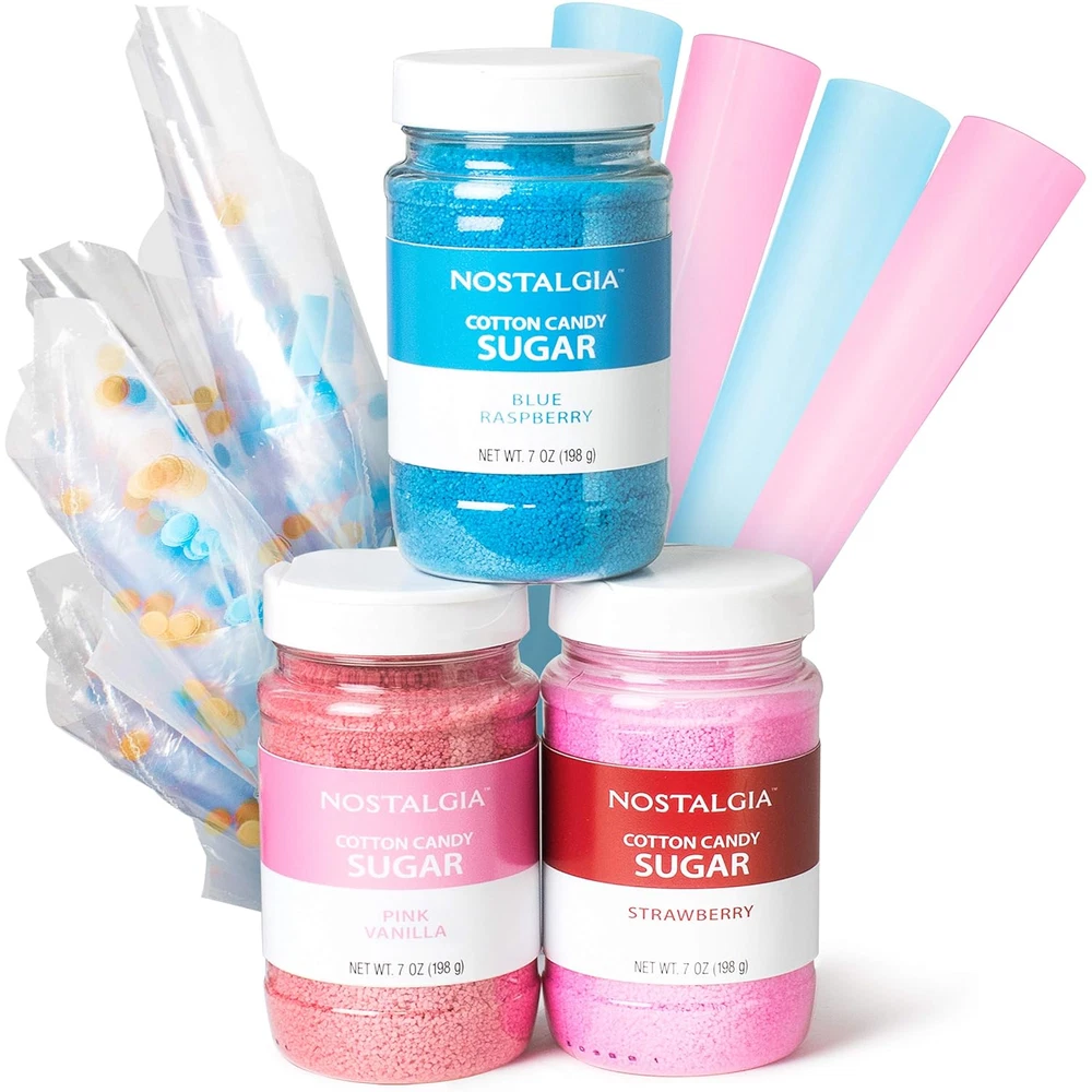 COTTON CANDY SUGAR: Includes three 7 oz. bottles of carnival-style cotton candy sugar in Pink Vanilla, Blue Raspberry, and Strawberry flavors—perfect for creating sweet, fluffy treats. THREE COLORFUL FLAVORS: Features three vibrant and delicious flavors—Pink Vanilla, Blue Raspberry, and Strawberry—for a classic cotton candy experience at home. THE NECESSARY ACCESSORIES: 4 usable cones and 10 clear plastic bags & ties are included for preparing the perfect cotton candy cone. EASY TO MAKE: Effortlessly create cotton candy with Nostalgia cotton candy machines. Simply pour, spin, and enjoy! Easy to store for long-lasting use ADD FUN TO ANY PARTY: Bring birthdays, holidays, and New Years Eve parties to the next level with sweet, carnival-quality cotton candy treats for guests of all ages to enjoy. PAIR WITH NOSTALGIA COTTON CANDY MAKERS: Designed to pair seamlessly with Nostalgia Cotton Candy Makers and compatible with other cotton candy machines for versatile use. ALLERGEN INFORMATION: Does not contain any known allergens Enjoy making sweet, sugary cotton candy treats from the comfort of home with fabulous results every time. This fun and convenient kit comes with all of the necessary ingredients for making fluffy and delicious cotton candy. Choose from one of the 3 included flavors of flossing sugar, including pink vanilla, blue raspberry, or strawberry, to satisfy your sweet tooth. Use the reusable cones for swirling and twirling cotton candy, then warp it all up with with the 10-clear plastic bags and twist ties. Designed to pair seamlessly with Nostalgia Cotton Candy Makers and compatible with other cotton candy machines for versatile use. Elevate any party or event with culinary creativity!