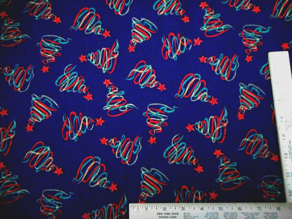 This is a very nice fabric that is 100% cotton. This fabric is out of print. It has red, green & metallic gold swirling Christmas trees on a dark navy blue background. READ: Because computer monitors show colors and shades differently, the fabric colors can vary from the photos. If you have any questions regarding this, please contact me before p urchasing the item. I have been a quilter for 30 years and am an accomplished seamstress & would be happy to answer any questions you might have. This is for a 1 Yard of Fabric. If you have a problem with anything you purchase from me, please contact me before leaving neutral or negative feedback and I will work it out with you. Payment is due within 48 hours. If payment isn't received within 5 days, it will automatically go to Ebay's resolution center for non-payment. INSTRUCTIONS FOR COMBINED SHIPPING: I Do combine shipping. You must put your items into your shopping cart and request an invoice from me using the request total button before completing the payment process. IF YOU'RE UNABLE TO COMBINE YOUR SHIPPING, PLEASE CONTACT ME. Payment is due upon receipt of your invoice. Thank you for looking and God bless you and your family. IF THERE IS A PROBLEM WITH ANY PURCHASE, PLEASE CONTACT ME, THE SELLER, VIA EBAY'S MESSAGING SYSTEM PRIOR TO OPENING A CASE--OPENING A CASE, EVEN IF RESOLVED SMOOTHLY, CAN HURT THE SELLER'S RATINGS. THANK YOU