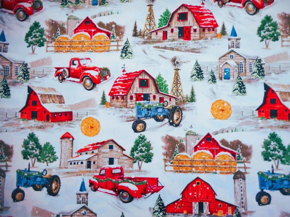 Length/Amount: By the Half-Yard Width: Up to 45'' Type: Quilting Brand: Brother Sister Design Studio Suitable For: Accessories - Bags/Purses, Accessories - Hats, Apparel - Coat/Jacket, Apparel - Dance/Sportswear, Apparel - Dress, Apparel - Everyday Clothing, Apparel - Loungewear, Crafts, Quilting Color: White Blue Red Green Tan Gray Pattern: Vintage Christmas Farm Scene Fiber Content: Cotton Theme: Holiday/Christmas Material: Cotton
