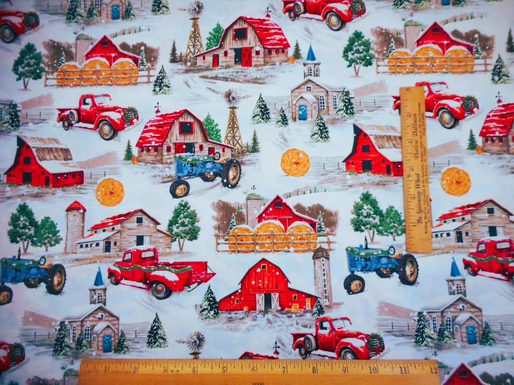 This is a very nice fabric that is 100% cotton. This is a premium quilting cotton by Brother Sister Design Studio. This is a vintage Christmas farm scene with blue tractors, red trucks, rolled hay, barns, houses & churches on the white & blue snowy background. READ: Because computer monitors show colors and shades differently, the fabric colors can vary from the photos. If you have any questions regarding this, please contact me before p urchasing the item. I have been a quilter for 30 years and am an accomplished seamstress & would be happy to answer any questions you might have. This is for a 1 Half-Yard of Fabric. If you purchase more than 1Half-Yard, I will give you one continuous cut. If you have a problem with anything you purchase from me, please contact me before leaving neutral or negative feedback and I will work it out with you. Payment is due within 48 hours. If payment isn't received within 5 days, it will automatically go to Ebay's resolution center for non-payment. INSTRUCTIONS FOR COMBINED SHIPPING: I Do combine shipping. You must put your items into your shopping cart and request an invoice from me using the request total button before completing the payment process. IF YOU'RE UNABLE TO COMBINE YOUR SHIPPING, PLEASE CONTACT ME. Payment is due upon receipt of your invoice. Thank you for looking and God bless you and your family. IF THERE IS A PROBLEM WITH ANY PURCHASE, PLEASE CONTACT ME, THE SELLER, VIA EBAY'S MESSAGING SYSTEM PRIOR TO OPENING A CASE--OPENING A CASE, EVEN IF RESOLVED SMOOTHLY, CAN HURT THE SELLER'S RATINGS. THANK YOU