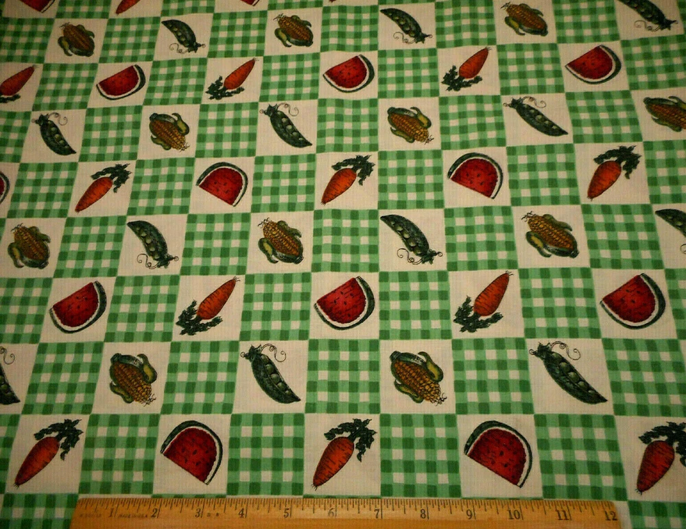 This is a very nice 100% cotton fabric. This is a Vintage fabric that is out of print. It has carrots, corn, peas & watermelon on beige patches separated by green & beige checked patches. Computer monitors show colors and shades differently. If you have any questions regarding this, please contact me before purchasing the item. I have been a quilter for 30 years and am an accomplished seamstress and would be happy to answer any question you might have. This is for 1 Yard of fabric. It you purchase more than 1 Yard, I will give you one continuous cut. If you have a problem with anything you purchase from me, please contact me before leaving neutral or negative feedback and I will work it out with you. Payment is due within 48 hours. Payments that aren't receive within 5 days will automatically go to Ebay's resolution center for non-payment. INSTRUCTIONS FOR COMBINED SHIPPING: I do combine shipping. Put all your items into your shopping cart & request an invoice using the request total option BEFORE completing the payment process, or I won't be able to combine your shipping. Payment is due upon receipt of the invoice. Thank you for looking and God bless you and your family. IF THERE IS A PROBLEM WITH ANY PURCHASE, PLEASE CONTACT ME, THE SELLER, VIA EBAY'S MESSAGING SYSTEM PRIOR TO OPENING A CASE--OPENING A CASE, EVEN IF RESOLVED SMOOTHLY, CAN HURT THE SELLER'S RATINGS. THANK YOU