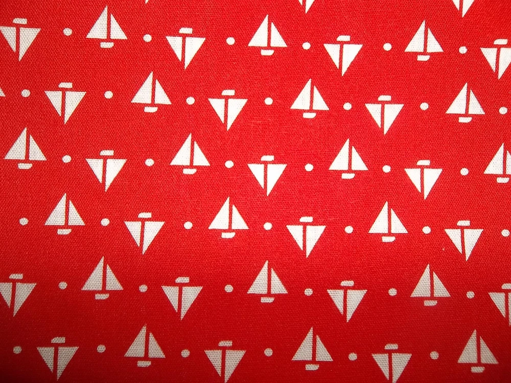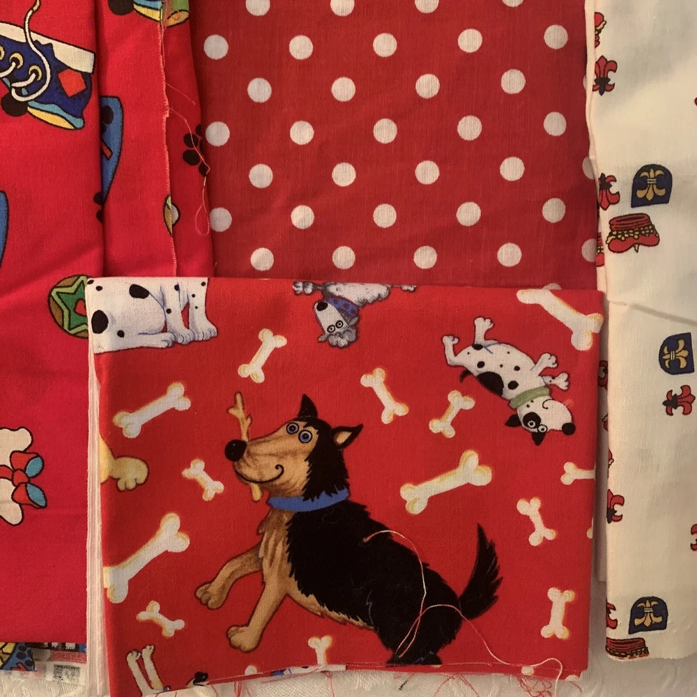 Fabric: Lot of 8 Fabrics all red prints Timeless Treasures red dogs print 9 x 44" Red Dog theme toss print Dream Spinners 2 yards x 44" white with red hearts irregular shape pc. less than a yard Fleur de lis print red on white 1 yard x 44" red white polka dot 2 pieces 19 x 8" red with white sailboats 19 x 32" red and green mini floral 24 x 25" plus odd extensions red floral on white 2 pieces 22 x 17" plus 7 varying size usable scrap A STASH BUILDER! Good amount for the price. Attractive prints. Pre-owned, but new - never used, from an estate stash. Will combine ship with other fabric lots. .