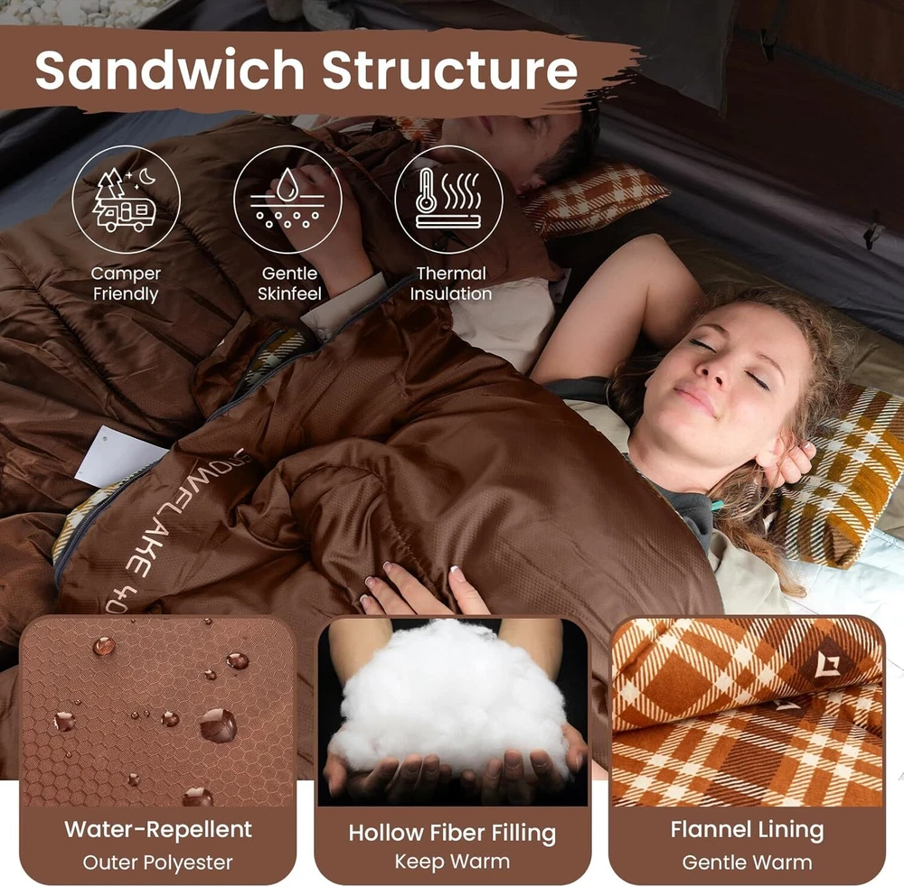89% Cotton, 11% Polyester Imported 【Cotton Flannel Sleeping Bags】With 210D polyester outer shell, this flannel sleeping bag adopts great durability and water repellency. And it is filled with 400g/㎡ cotton hollow fiber, thermal insulated, and damp proof. Flannel liner gives you a cloud-like skin feeling. Release your fatigue after a tiring day. 【Big and Tall Cold Weather Sleeping Bag】75 L X 33 W. Larger than regular camping sleeping bags. Fits 6 ft tall adults with room to spare. Cozy in any position. Can be used for warm and cold weather in 4 seasons. 【Versatile Zip Together for Double Sleeping Bag】2-way zippers that right or left-hand zippers allow for 2 flannel sleeping bags for camping to be attached together. Unzip the bottom to cool your feet. Besides a sleeping bag, you can "Wear" while chilling, also as a blanket or a picnic pad. for family trips, and car camping. 【Customer-Focused Design for Quality Sleeping Bag】Half-circle hood with an adjustable wind-proof drawstring keeps your head warmer even in extreme conditions. The on the collar prevents the zipper from suddenly opening. 【Easy to Carry】This packable sleeping bag package size is 17 x 9 in, weight 5.07 lbs. The sleeping bag comes with a compression sack, allowing for convenient storage and easy carry, roll control design makes the sleeping bag for adults cold weather folding quickly and easily. The portable sleeping bag is perfect for hiking, backpacking, car camping, and more. On Dec 29, 2024 at 17:46:26 PST, seller added the following information: