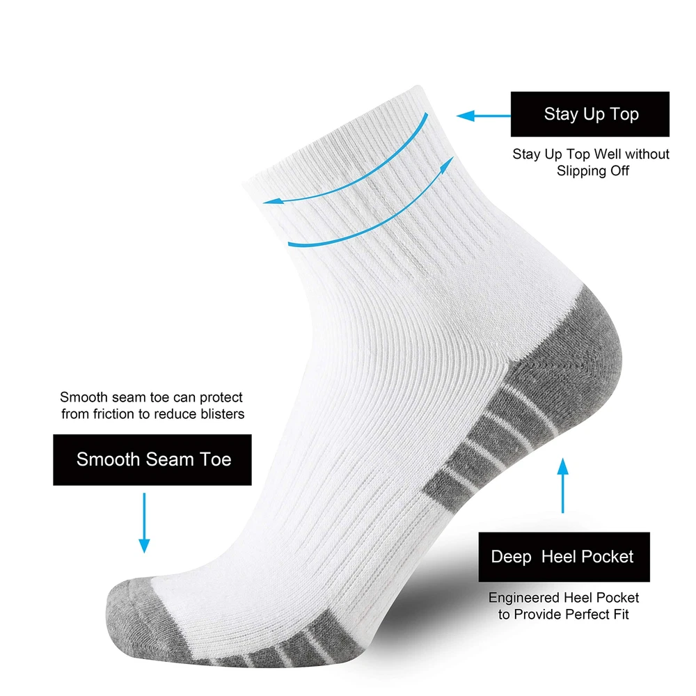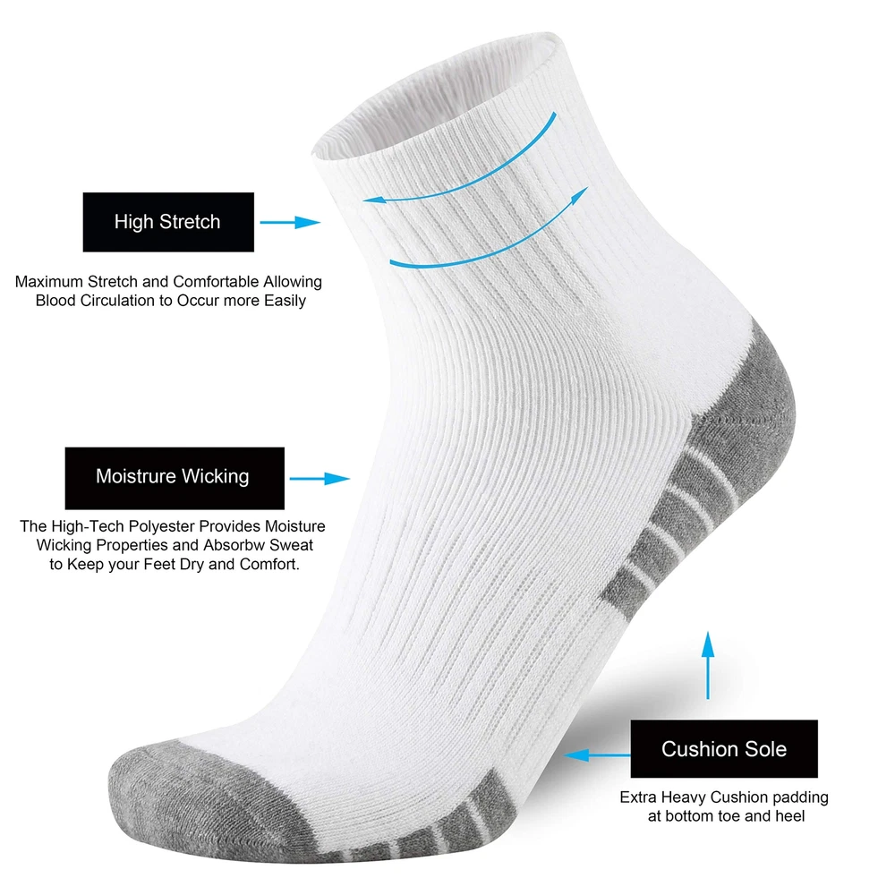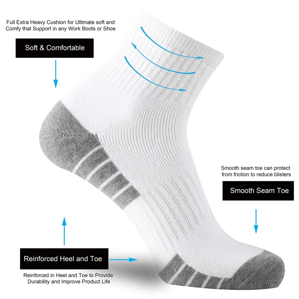 cushion low cut socks made with the premium cotton and polyester blend.The fibers is lightweight that provide superior Moisture Wicking properties and Mesh Construction design,The fabrics can transport moisture away from your feet and create airflow within the fabrics, which keeps your skin breathable and your feet cool and dry ,it provides a breathable Comfy and Cozy feeling. The toe and heel of the socks are reinforced for both durability and relaxation,It provides ultimate comfort and durability for a tough job, extreme outdoor adventure or athletic sports.It helps you avoid blisters during your daily work or outdoor activities. These Socks are Great for: • GYM • Hiking • Tennis • Running • Cycling • Trekking • trainning • Camping • Climbing • Athletics • Outworkers • Backpacking • Everyday Use • Steel Toe Boots • Mountain Biking • Work Boots Socks • Heavy Duty Socks • Aerobic Exercises • Outdoor Activities etc Wash Instruction: • Suggest machine & hand wash. • Tumble dry or air dry. • Don't iron. • Don't bleach. • Don't soak socks in hot water or suds for a long time. Why Choose Brand Socks? brand owner has more than 15 years experience in sock design and manufacturing,Since we started in 2003,we keep an eye on the higher quality. We have listened to customer feedback to give you value-added sox!It's our way of ensuring you get your money is worth every time you buy from us. Money Back Guarantee: We stand behind our cushioned socks with a money back guarantee. If you have any questions please feel free to contact us,we will solve your problem as soon as possible until you satisfaction. Premium Materials: Superior cotton and polyester blend, Use a spandex and nylon knitting to deliver a snug fit and retain shape even after repeated washings Soft Comfy:Full cushioning for ultimate support in any work boot or shoe. It helps you avoid blisters during your heavy duty work or daily activities Moisture Control: The advanced technical fibers wick away sweat and moisture. Moisture wicking properties to keep smell fresh and feet dry and breathable Durability: Nylon blend knitting provide added durability in high stress areas, it avoids holes dramatically, more protection in most extremely environment Performance: Deep heel and elastic top ensure the sock fits the contours of the foot so perfectly, super stretchable and boost blood circulation easily