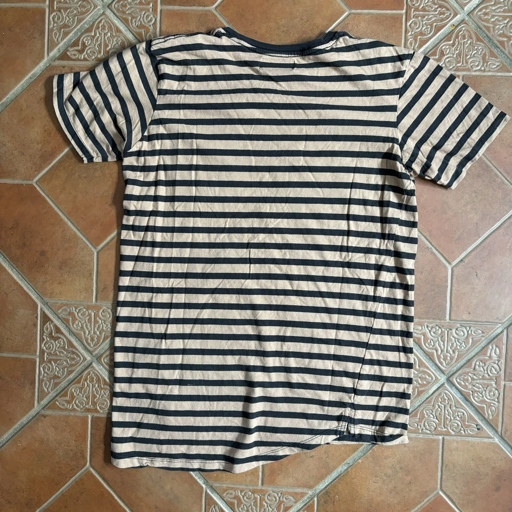 Cotton On Garment Tan Black Striped Longline Fit Men’s Front Pocket Shirt Size M In good overall condition. No tears/holes or stains. Brand label say longline fit and fits men’s size medium. Tan and black horizontal stripes with a front pocket. Some ware/nubbing on fabric from wear. Price reflects this.
