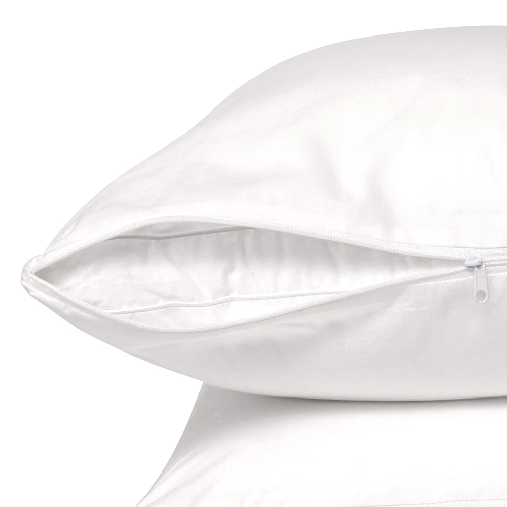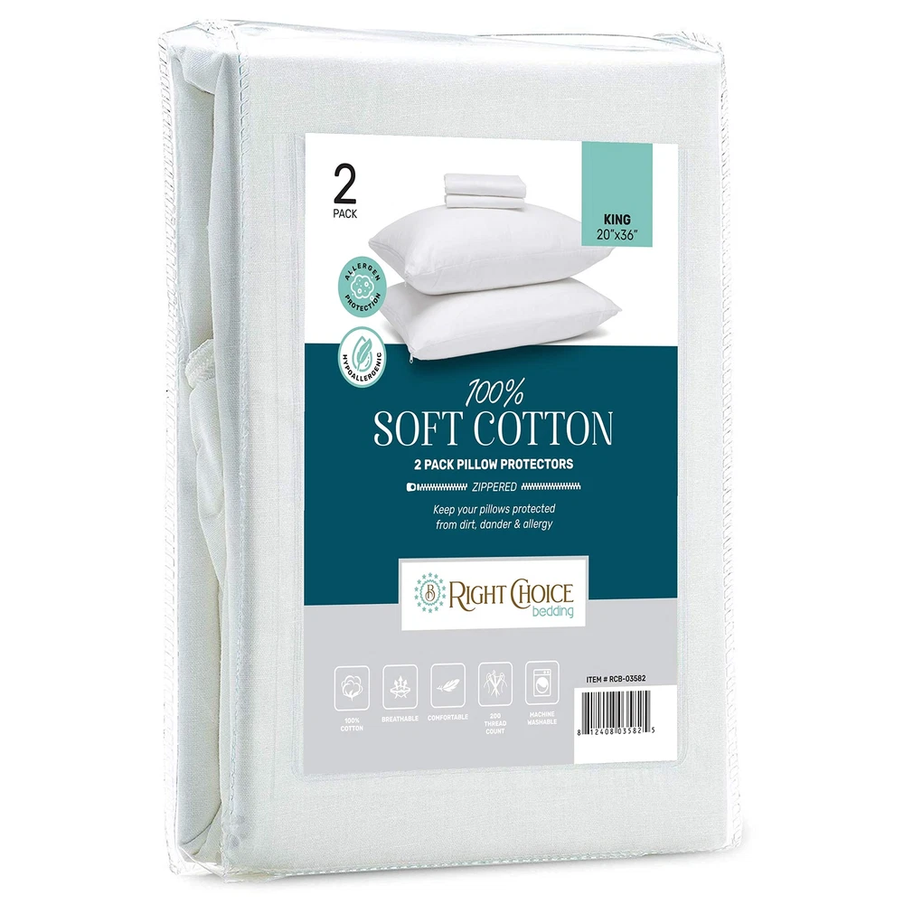 Right Choice Bedding Cotton Pillow Protectors with Zipper are the perfect combination of comfort, protection, and convenience. These pillow protectors are crafted with premium-quality cotton fabric, offering a soft and cozy feel for a peaceful night's sleep. Experience enhanced breathability as the fabric allows air to circulate, keeping your pillows fresh and cool. The convenient zipper closure ensures a secure fit and easy installation, providing reliable protection against spills, stains, and general wear and tear. Upgrade your bedding collection with Right Choice Bedding Cotton Pillow Protectors. NATURAL COTTON FABRIC: Our Right Choice Bedding Cotton Pillow Protectors provide top-quality protection for your bed pillows. Out 100% cotton fabric is soft, smooth, and breathable. ZIPPERED PILLOWCASE FOR FULL COVERAGE: Enjoy complete pillow protection from every angle. Our tight-locking, smooth-gliding zipper will keep your pillow securely in place. PREMIUM 200 THREAD COUNT FABRIC: Experience the luxury of our 200-thread count fabric. It combines durability and softness, enhancing your sleep experience while keeping your pillows in pristine condition. NOISELESS AND COMFORTABLE: Say goodbye to noisy and uncomfortable pillow protectors. Our pillow covers are designed to be noiseless and provide a quiet and restful sleep. EXTEND THE LIFE OF YOUR PILLOWS: Don't let dirt and grime ruin your sleep or the longevity of your pillows. Our zip-up pillow cases act as a protective shield, keeping your pillows clean and fresh, and extending their lifespan for years to come. EASY WASH AND CARE: Our pillow protectors are machine washable, offering hassle-free care. They are designed to withstand multiple washes without shrinking or losing their quality, making caring for them a breeze. KING SIZE 20x36: Our pillow protectors are made to fit king-sized pillows measuring 20x36 inches. Please check your pillow dimensions before purchasing to ensure a proper fit. SET OF 2 FOR CONVENIENCE: Each purchase includes a set of 2 pillow protectors, offering great value and convenience.
