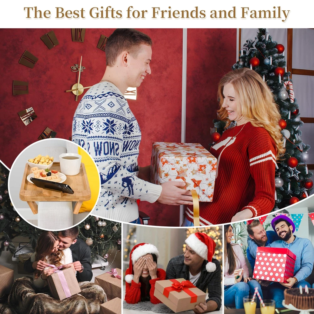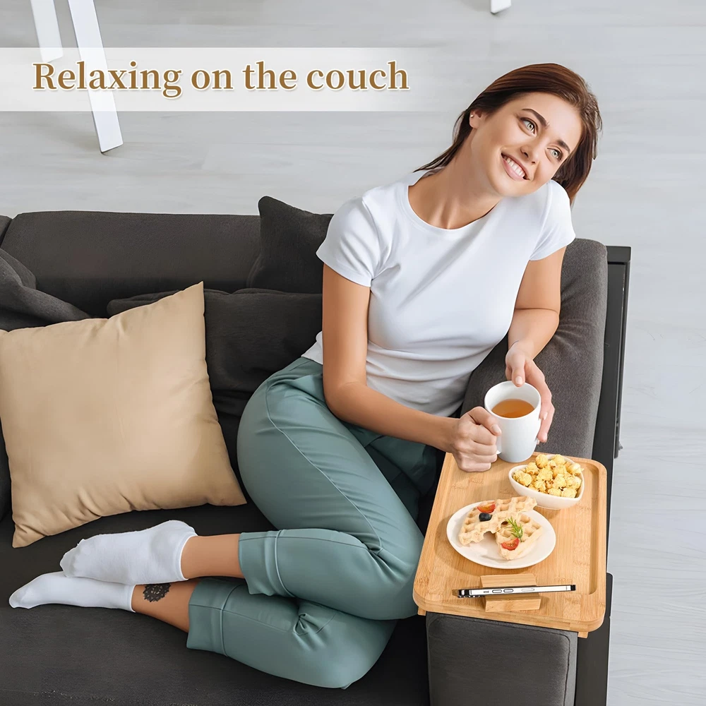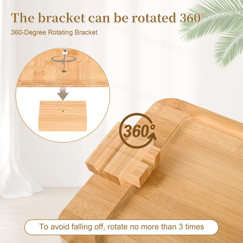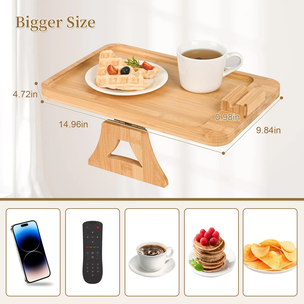 【Multi-functional Couch Arm Table】The couch arm tray is convenient for remote control, drinks, snacks, phones, etc, which is very suitable for people who do not want to move around. 【Natural Bamboo sofa Table】Made from 100% natural bamboo and wood, stylish and visually appealing bamboo panels complement almost any interior decoration. Coupled with a protective coating, it is waterproof and easy to clean. 【Super stable】This sofa table has two armrests at the bottom composed of high quality hinges and non-slip silicone at the bottom, ensuring stability during use and not easy to shake. Double protection ensures that drinks can be safely placed on the sofa table. 【360° Rotating Stand】This sofa armrest tray with features 360° rotating stand that allows you to watch videos from all angles on your phone and tablet, enhancing the usefulness of this sofa table tray. 【Item Dimensions】14.96(L)x 9.84(W)x 2.5 folded /5.3 unfolded (H) inches, suitable for sofa armrest widths between 2-12 inches. When not in use, it can be stored under the sofa or in a 2.5-inch drawer