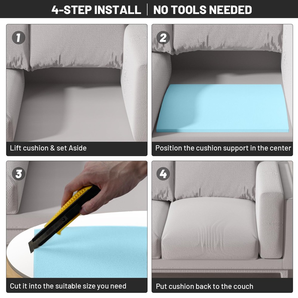 Made from high-density foam and expertly designed to restore sagging cushions, our sofa restoration cushions eliminate dents caused by prolonged use. These couch supports for sagging cushions provide firm support, making them an ideal couch cushion support for enhancing comfort and rejuvenating your sofa. Suitable for most domestic sofas, our sofa cushion support ensures your seating is both supportive and comfortable, effectively serving as the perfect couch support to maintain your furniture's appearance and functionality. 【Revitalize Your Sagging Seats】Our couch support is specially designed to restore sagging cushions and eliminate dents from prolonged use. It provides firm support, rejuvenating your sofa and elevating your comfort. 【Quick and Easy Installation】 Simply put our couch support under your cushions for an effortless fix. These couch supports for sagging cushions offer a fast, hassle-free solution to restore your sofa's original shape and support. 【High-Quality Materials】Crafted from premium 40D high-density foam, the curved arch design ensures superior firmness and stability, providing durable support that extends your sofa's lifespan and maintains its comfort. 【Customizable Fit】 Measuring 20" x 20" with a 2" center thickness, these sofa support for sagging cushions fit most household sofas and can be easily trimmed to achieve the ideal fit for your furniture. 【Warm tips】 Our sofa restoration cushion is vacuum packed and will regain its shape within a day after unpacking. If the product can not be restored to the original after opening the vacuum bag for a day, you can soak it in water, wring out the water to dry and then use it again, the restoration effect will be better.