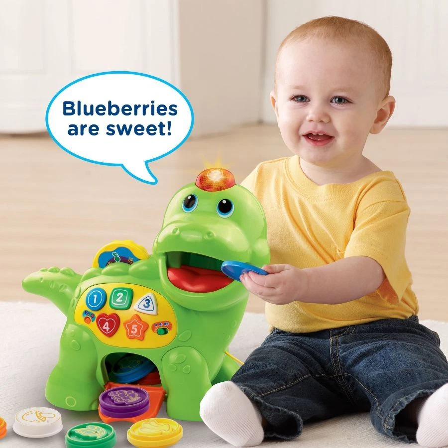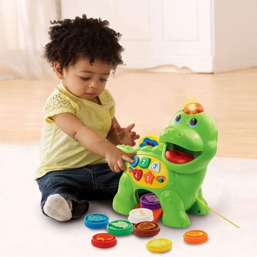 Feed the LeapFrog Chomp and Count Dino a healthy treat! Put the eight brightly colored play pieces in the dino’s mouth, and watch as he eats and recognizes each piece. You can play in either meal mode or counting mode. The dino responds with rewarding sounds and phrases while introducing colors, numbers, shapes and food. Press the question button and answer the dino’s questions to show what you’ve learned. Learn shapes and numbers by pressing any of the dino’s five shape buttons. Pull the dino by the included pull string or push the dino along to strengthen motor skills and hear fun melodies. Spin the disc on the dino’s back to play sing-along songs. Intended for children ages 12-36 months. Requires 2 AA batteries. Batteries included for demo purposes only. batteries recommended for regular use. Unisex, On Dec 19, 2024 at 17:42:01 PST, seller added the following information: