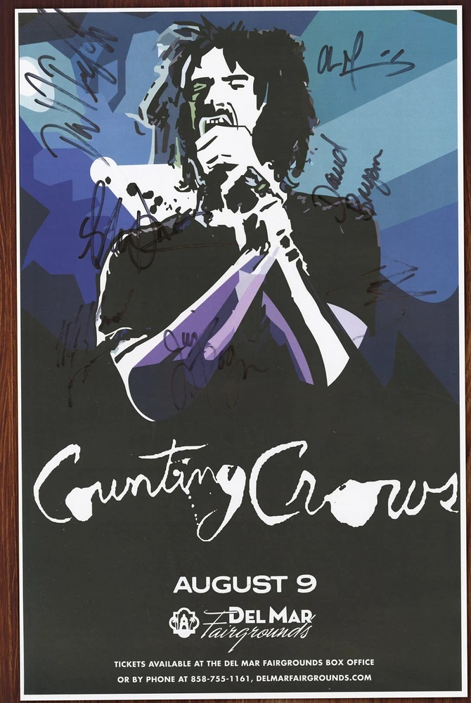 Counting Crows concert poster Del Mar, CA - 2014 While I was backstage at the show, I had this poster signed by David Immerglück, David Bryson, Adam Duritz, Millard Powers, Jim Bogios, Charlie Gillingham and Dan Vickrey I've never gotten around to framing the poster, so I am going to let it go. Size: 1 1 x 1 7 inches