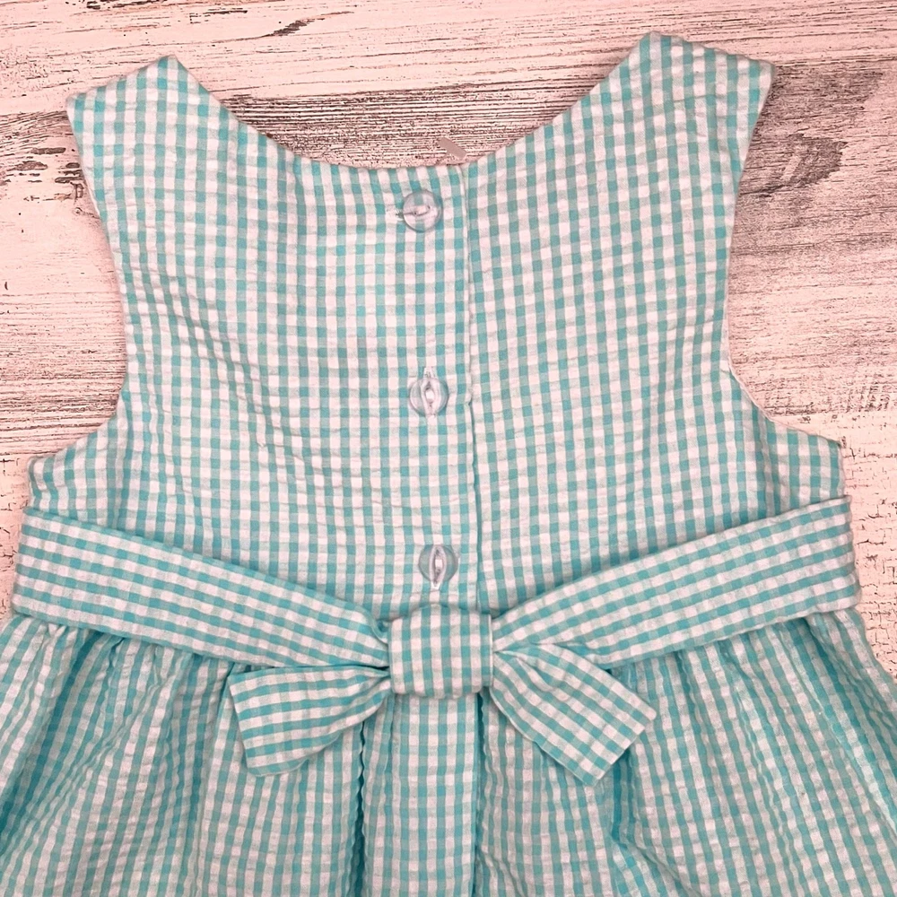 Sweet and playful Counting Daisies baby girl dress set made from lightweight gingham seersucker fabric. Features a cupcake appliqué, pink ribbon waist bow, and matching bloomers for a complete warm-weather outfit. Styling suggestion: Pair with white sandals and a sunhat for birthdays, parties, or sunny day outings. Details: • Brand: Counting Daisies • Size: 18 Months • Color: Aqua, white, pink • Material: 54% Cotton, 46% Polyester • Style: Dress and bloomers set • Features: Cupcake appliqué, gingham seersucker, pink ribbon bow, bloomers included • Neckline: Round • Sleeve: Sleeveless • Closure: Button back with tie • Dress length: Above knee • Fit: Regular • Pattern: Gingham • Occasion: Birthday, party, everyday • Season: Spring, Summer • Condition: Excellent like new condition. No flaws. Keywords: cupcake, gingham, seersucker, birthday, party, summer, bow, outfit, bloomers Ships fast from a U.S. seller. Clean, smoke-free, pet-friendly home. Bundle to save!