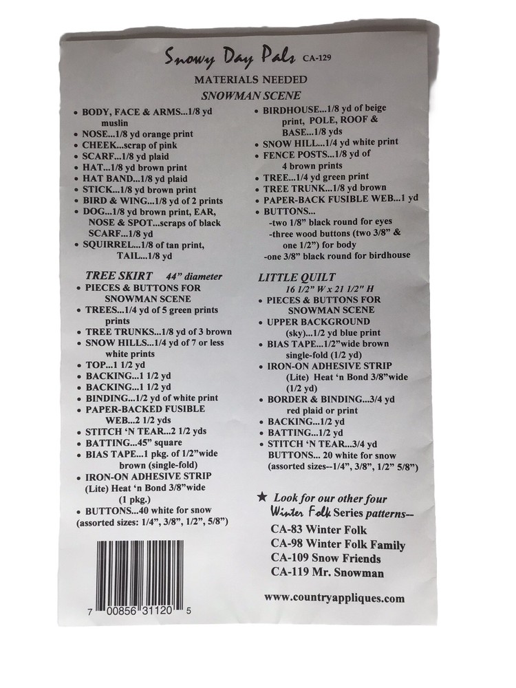 Create beautiful and cozy quilts for your home with this Country Appliqués Snowy Day Pals Quilting Kit. The kit includes everything you need to make a charming little quilt and a matching tree skirt, featuring adorable snowmen and evergreen trees. Perfect for the winter season, this kit is a great addition to any room. Crafted with high-quality materials, this quilting kit is perfect for both beginners and experienced quilters. The pre-cut fabrics make it easy to get started, and the detailed instructions will guide you through the process. Whether you're looking for a fun holiday project or a thoughtful gift for a loved one, this Country Appliqués Snowy Day Pals Quilting Kit is the perfect choice.