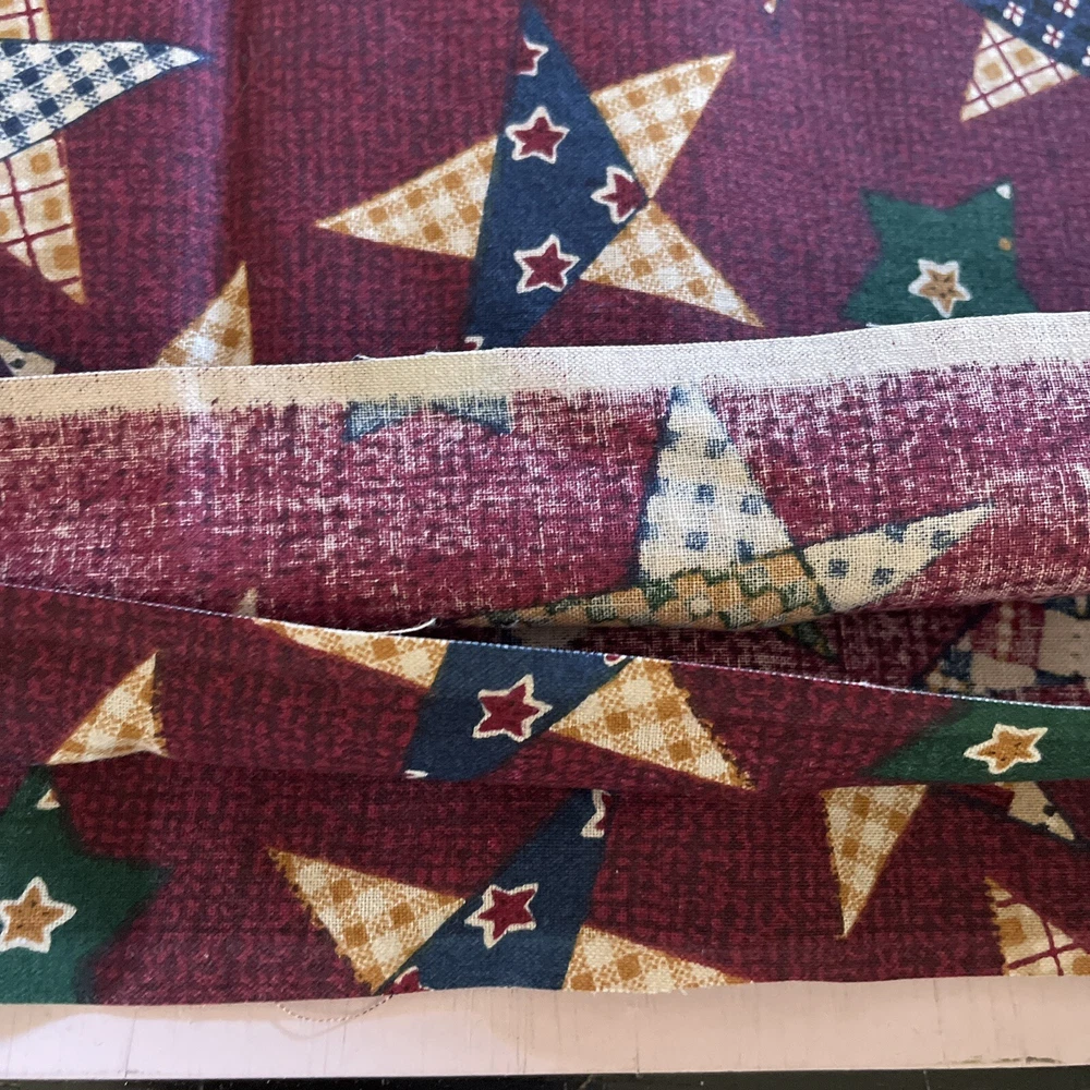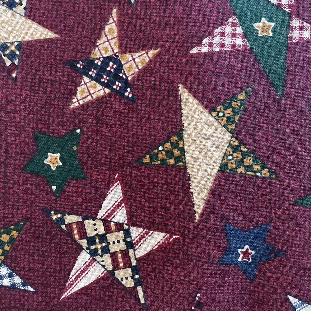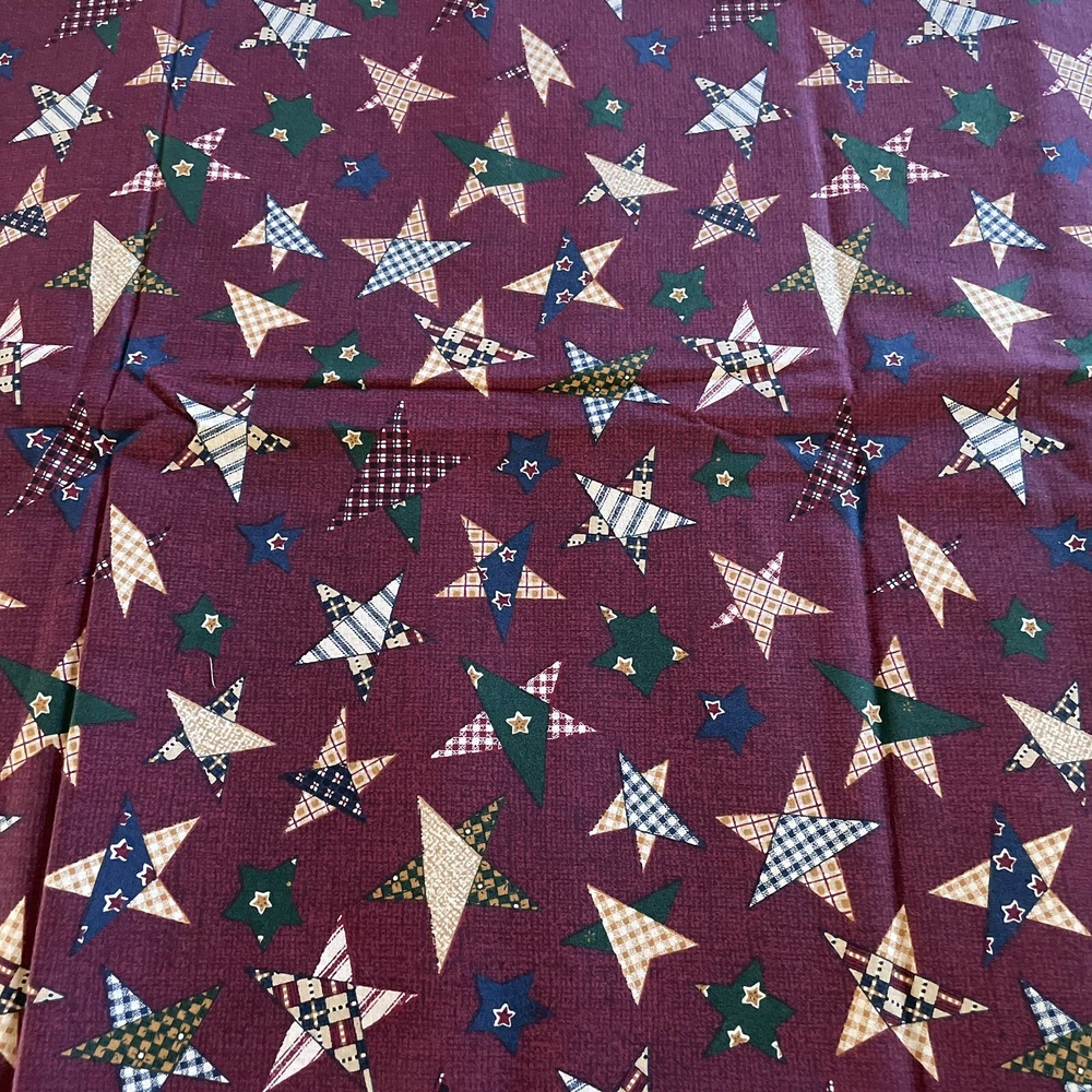 Country Burgundy Patchwork Tossed Stars 2.5 Yards. Unmarked brand on selvedge. Comes as about 2.5 yards; 92” long.