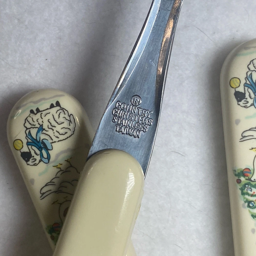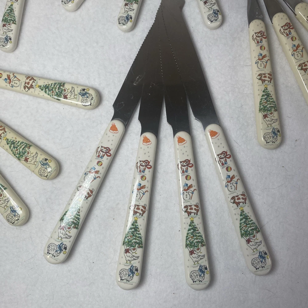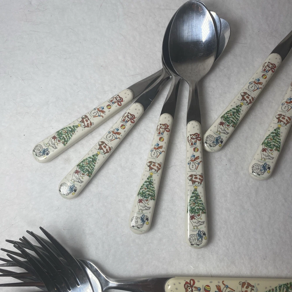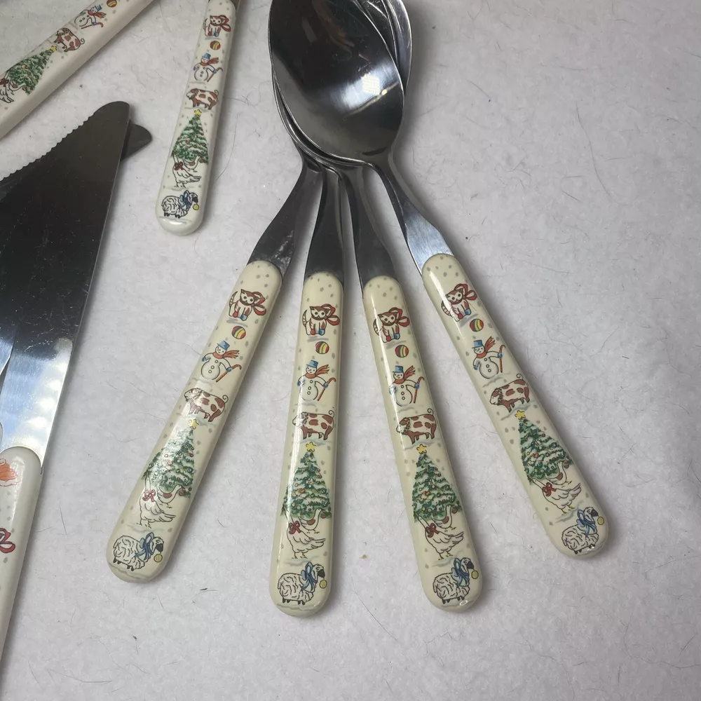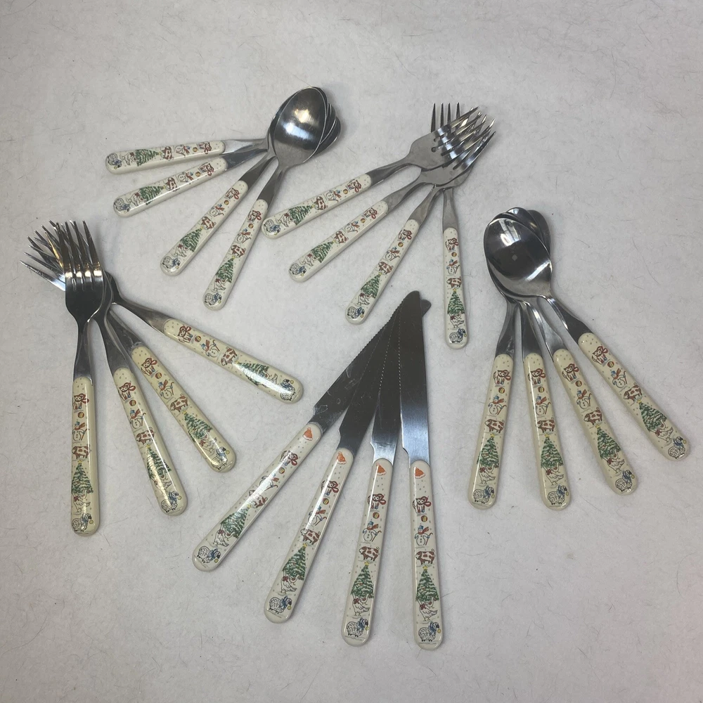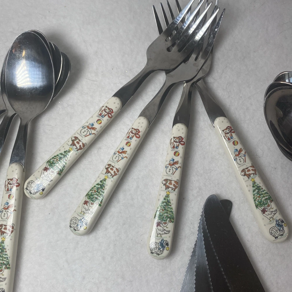 COUNTRY CHRISTMAS Vintage Stainless Steel Plastic Handle Flatware Set Silverware 20 pieces Service for 4 Unique vintage set that is hard to find! See photos for use and condition.
