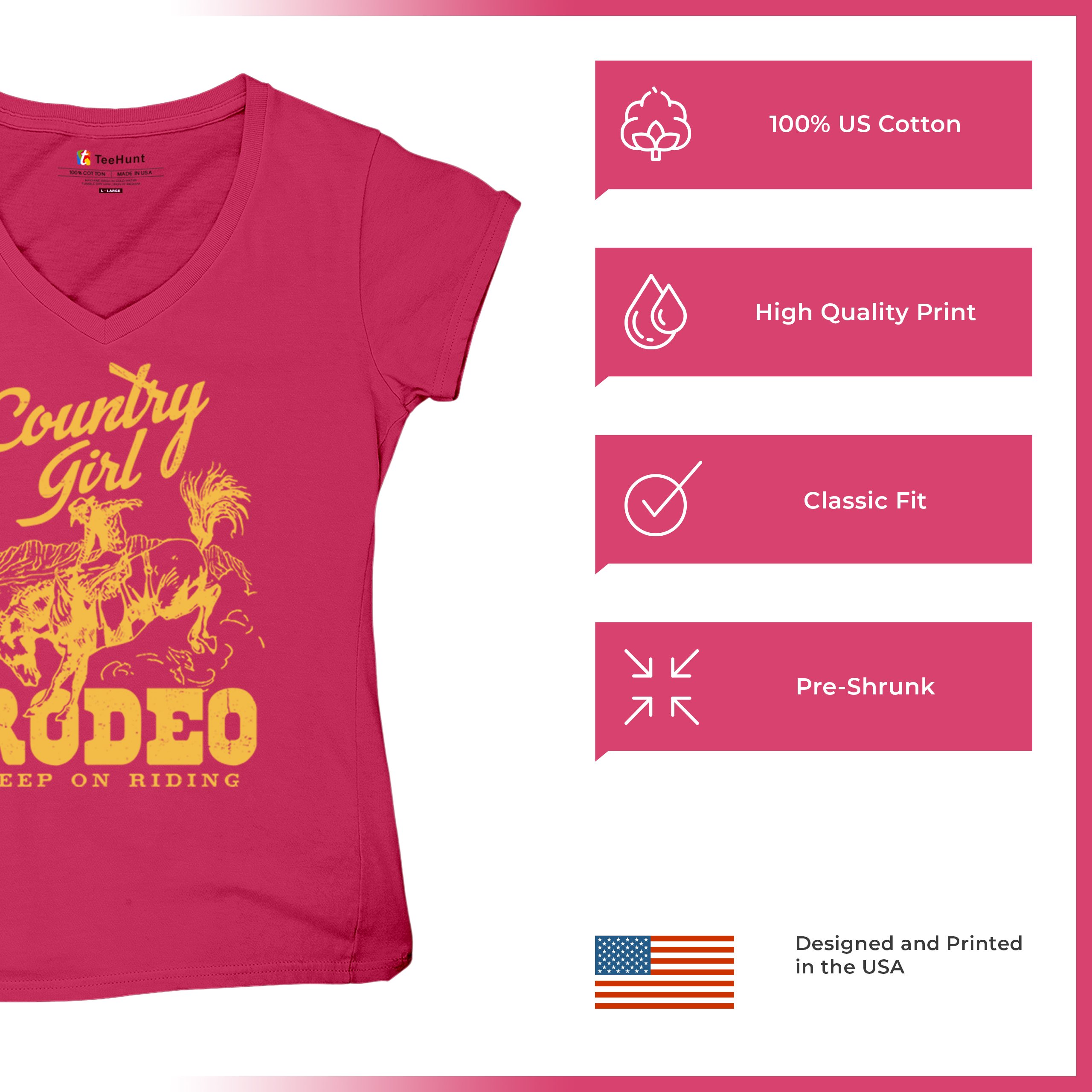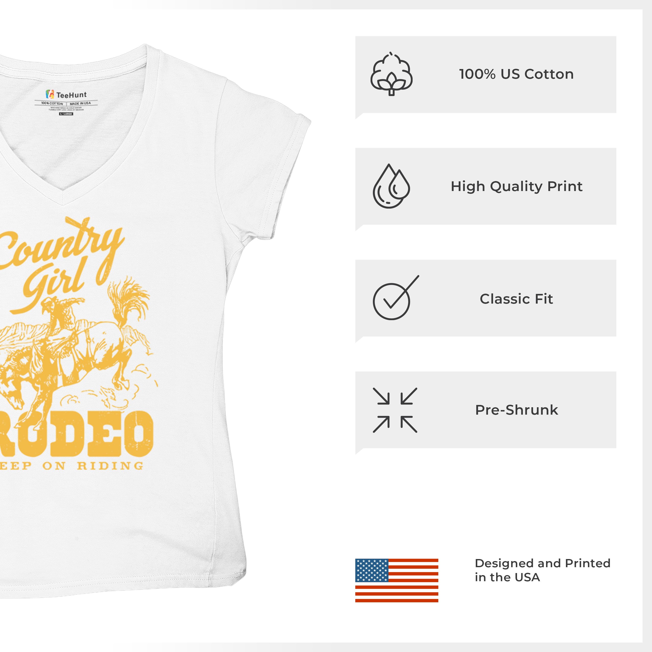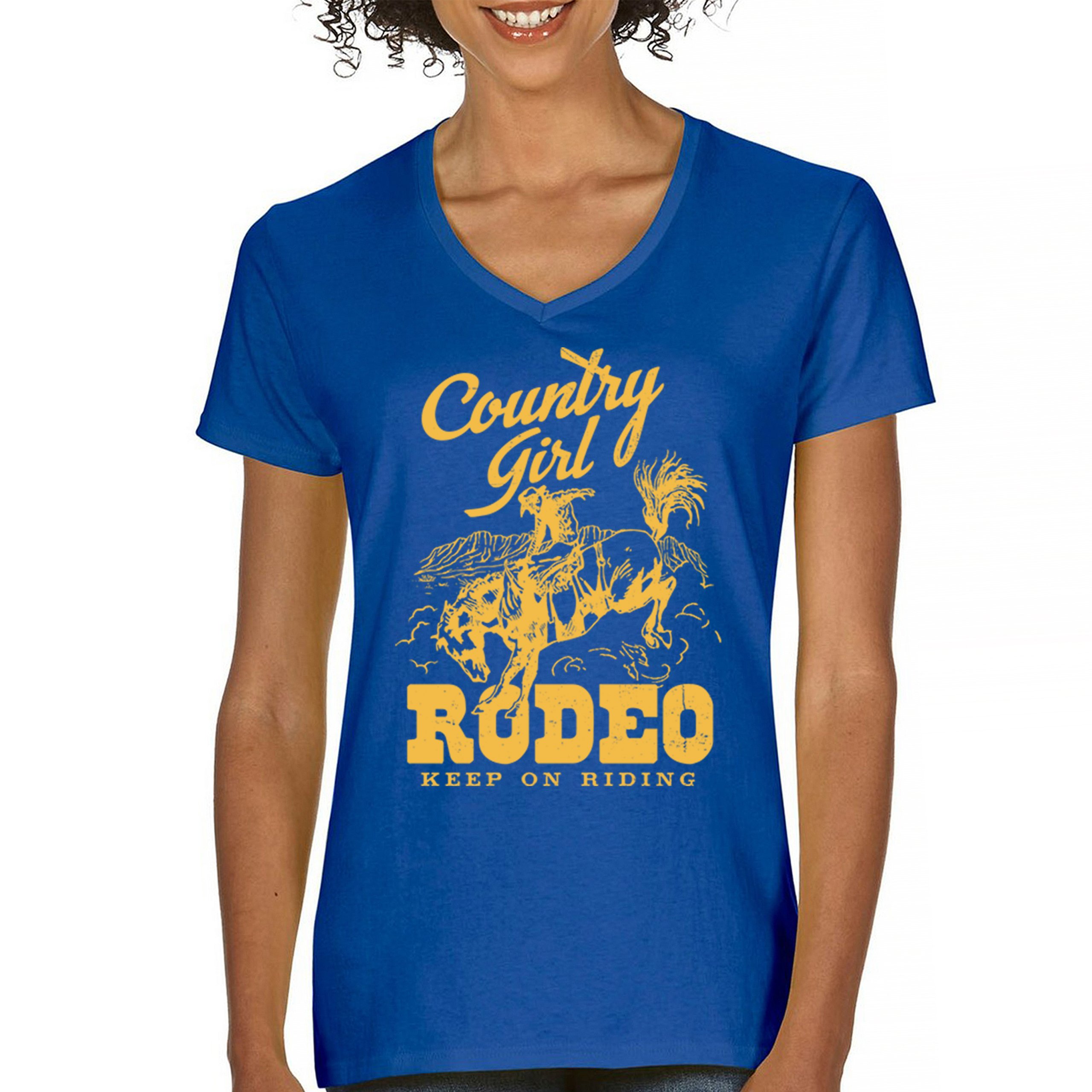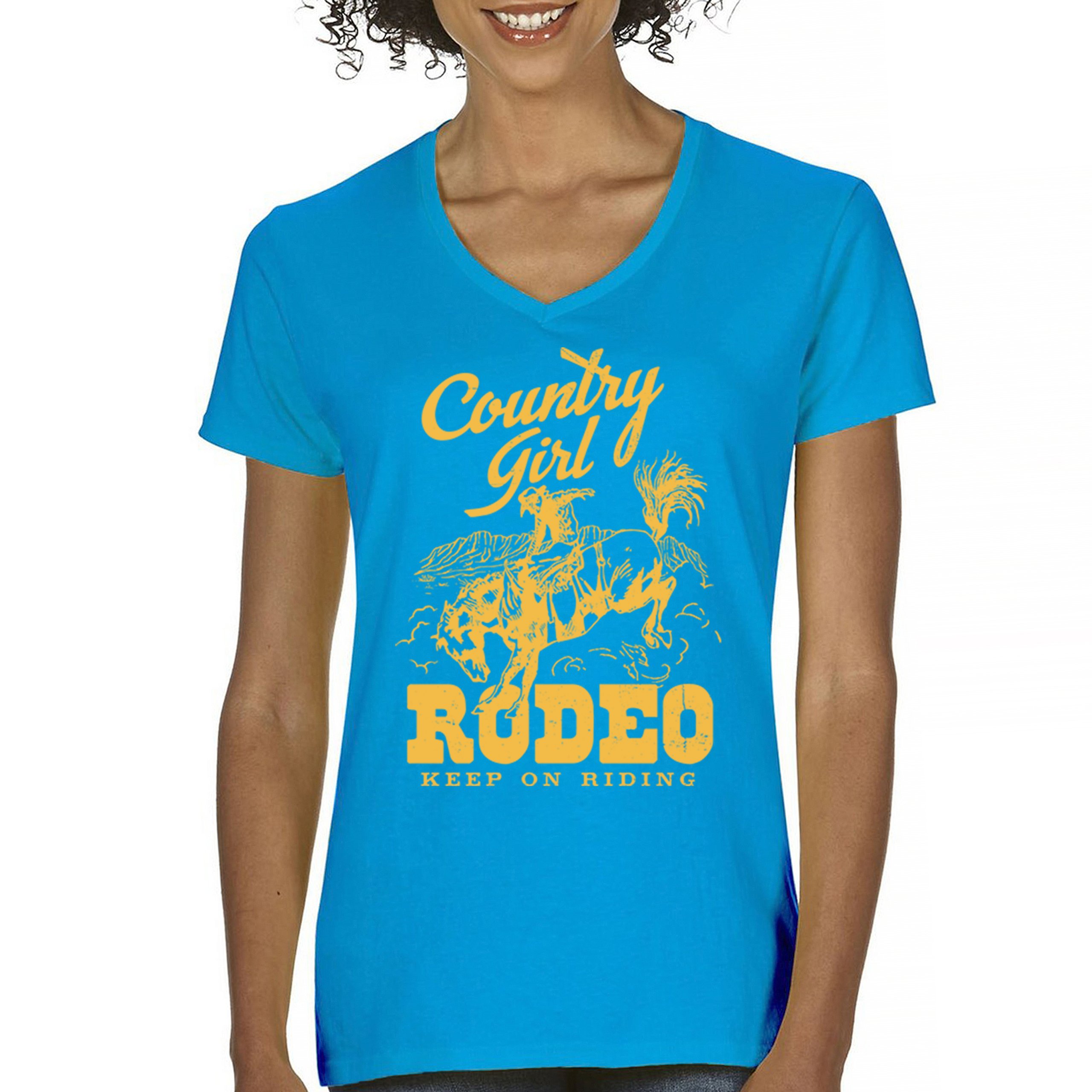 Fast & Free Shipping HIGH QUALITY 1 DAY HANDLING Country Girl Rodeo Women's V-Neck T-shirt Keep On Riding Western Cowgirl ITEM DESCRIPTION Brand New Ladies V-Neck T-Shirt High Quality Print Semi-fitted Contoured Silhouette 100% Pre-Shrunk Cotton Sport Grey : 90/10 cotton/polyester 1/2"" Mitered V-neck Collar Printed in the USA Also Available In WASHING INSTRUCTIONS: turn inside out and wash in cold water on a delicate cycle of your washing machine. Try to avoid dryer or set it on low heat. To minimize shrinkage we recommend to air dry. PLEASE NOTE: The print may appear smaller on larger sizes. Due to the many variations in monitors and browsers, actual colors may vary slightly from what appears online. PAYMENTS: We accept the following payment methods: Paypal, All Major Credit Cards (processed through eBay's Payment System, no account necessary). We do not ship package until the payment is cleared. if you have a problem with payment, please contact us. SHIPPING: We offer FREE domestic shipping within the continental US! Your order will be shipped within 1 business day of receiving payment (Monday-Friday) Shipping services we offer: Domestic Orders: USPS First Class Mail, Priority Mail and Express options. International Orders: USPS First Class Mail, Priority Mail and Express options. We are NOT responsible for any foreign customs duties or taxes. We do not refund postage for unclaimed, undeliverable or refused packages. If a package is returned as undeliverable unclaimed or refused, it is the customers responsibility to follow up with the postal carrier. In the very unlikely event that your item is lost or damaged during post, then WE are responsible and will issue either a full refund or replacement. RETURNS: If you are not completely satisfied with your purchase, you can return the item within 30 days and get a full refund if the item is defective, damaged, or an error is made on our end. If you would like to exchange the item, please contact us through eBay Messages. All returns must be initiated through eBay Returns System. If 30 days have gone by since your purchase, unfortunately we can’t offer you a refund or exchange. And returned item can be shipped back to customer at customers expense, or will be disposed within 7 days. To be eligible for a return, your item must be unused, unwashed and in the same condition that you received it. Custom made items (including custom images, writing or other customization requested by customer) are not eligible for a refund or exchange. Once your return is received and inspected, we will notify you of the approval or rejection of your refund. If approved, your refund will be processed, and a credit will automatically be applied to original method of payment, within 3-4 days. All payments and refunds are processed by eBay's Payment system. If a refund has been issued, but you do not see the funds in your account within 3-4 days, please contact eBay Support. You will be responsible for paying for your own shipping costs for returning your item. Shipping costs are non-refundable. if you receive a refund, the cost of return shipping will be deducted from your refund. Depending on where you live, the time it may take for your exchanged product to reach you, may vary. You should consider using a trackable shipping service or purchasing shipping insurance. We don’t guarantee that we will receive your returned item. Visit our ebay store to see more amazing items T-Shirts Sweatshirts Tank Tops