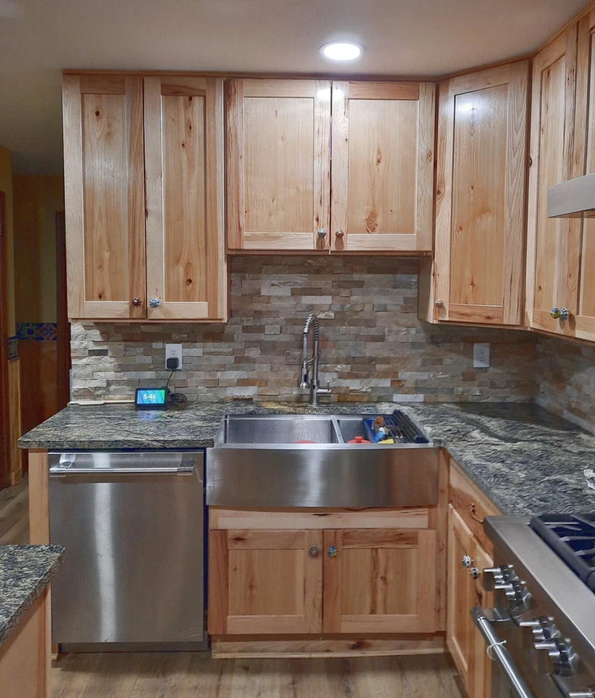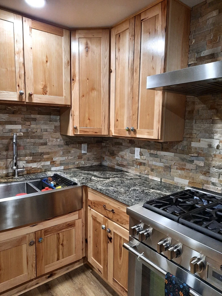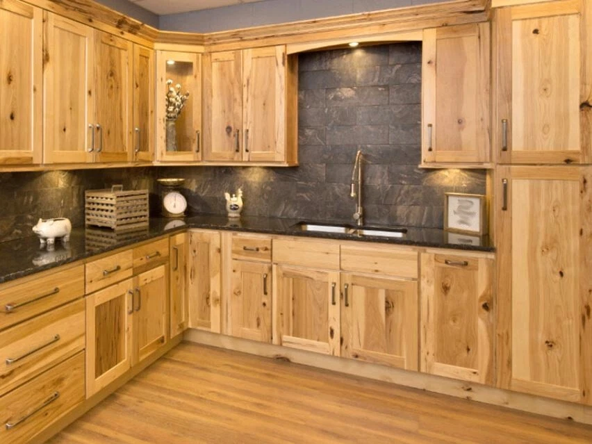 All Wood Hickory Shaker Kitchen Cabinets full overlay doors NEW-Country Hickory Kitchen & Vanity Cabinets -NEW Order this Sample Door of Beautiful Country Hickory Kitchen Cabinets Order this sample door to see the details and decide if these are right for you! All Wood Cabinets with hickory face frames and doors. Plywood box construction , completely finished and NO PARTICLE BOARD! All wood drawer box with slab drawer front , full extension soft close drawer glides with super simple assembly. Hidden door hinges adjustable-euro style, soft close upgrade if needed. Matching pre- finished veneer end panels are available. Natural stained pre-finished veneer over furniture grade plywood interiors. Matching fillers, valances, fluted trim, mullion doors available- for a truly custom look! Ready to assemble with robotically pre-fitted components and all parts included. Country natural finish with protective matte finish top coat. Full Overlay doors Full Manufacturers Warranty * We ship anywhere in the U.S. at great rates! Great rates to Canada also! We have a super customs broker and We just keep making it easier! Email or Call us to get a shipping quote! Toll Free 877-839-2227 This auction is for a sample door in Country Hickory Shaker to see the door color and style before buying your kitchen. 9" - 54" wide base cabinets 30" - 42" wide sink base cabinets 12" - 30" wide drawer base cabinets 12' deep 30", 42" high and more wall cabinets Oven and Pantry cabinets More sizes and accessories.... We also offer free layout and design services! To preview the these beautiful Country Hickory Kitchen cabinets, order this door sample or a finish sample for only $7.99. View our other items to see other sizes, styles, samples and more. For more information email or call- we ship to U.S. and Canada! Cabinet prices have just been lowered to make them even more affordable! If you are searching for high end ready to assemble kitchen cabinetry at wholesale prices (ours cost 50% less than traditional assembled cabinets) you've found it! We have several styles to choose from and all are super easy to assemble and install. We specialize in providing kitchen and vanity cabinets to the do-it-yourselfers, remodel and new home builders. These cabinets are perfect for adding storage to your existing home or replacing outdated cabinetry. Whatever your needs, we have a solution- one or two cabinets, a whole kitchen, or ten kitchens. Let us know what you are looking for, we can help with free layout and design assistance, as well as detailed assembly and installation instructions. Remember: Buy now and save $$$$$$ Easy Kitchen Cabinets! Remodel your kitchen or bath for less! Kitchen and bath remodel offer the greatest return on your remodel dollar! A new kitchen is the next best thing to buying a new home!!!!! To preview the Country Hickory Kitchen cabinets, order a Country hickory finish sample or sample door. Your Sample will be sent right away, this is a sample, cut from trim or accessories in the shaker hickory finish! Additional Information about the Prefinished Country Hickory Cabinet line Wood Type: Hickory Door Style: Shaker door Stain Color: Natural hickory stain Level: Up Grade Cabinets Soft close doors as an upgrade, and soft close drawers are standard!! HURRY TO SAVE NOW! These are top of the line, with a custom country rustic look yet also at a great value. The country hickory stained finish combined with the variety of sizes and accessories to create a relaxed or country casual style. The rustic wood style flat panel doors create an interesting simple style. Many unique layouts can be obtained. See the complete listing of all the special cabinets and the huge variety of cabinet sizes. Start here to easily create the gorgeous elegant kitchen of your dreams. Basic assembly is just like our other RTA's and instructions can be downloaded from the website. The cabinets do not have the cam locks, these have metal L brackets that are used in place of the cam locks for assembly. Or staple and glue like custom build cabinetry. The plywood cabinet box has matching finished interiors and sides. This style also has full extension soft close drawer slides on all drawers. These are just like our other cabinets in all wood construction and of the finest quality.